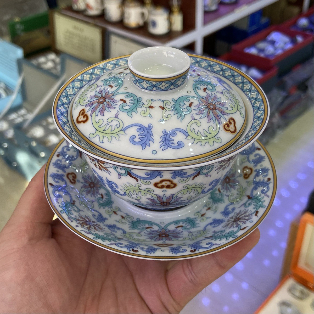 Jingdezhen gốm sứ cổ bùn xô màu vẽ vàng xung quanh cành sen ba chỉ có nắp bát Bộ trà Kung Fu đơn bát trà tách trà