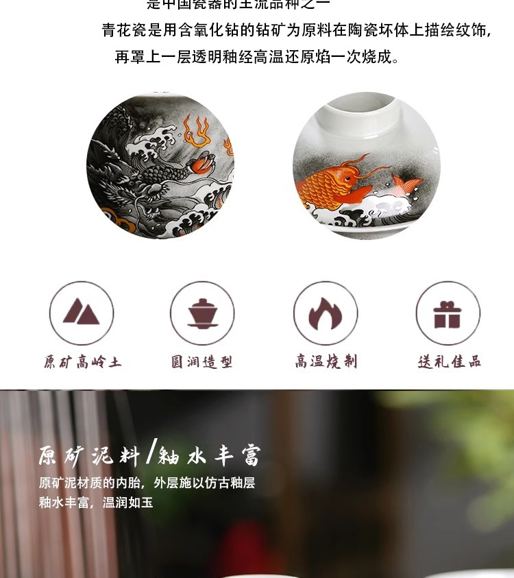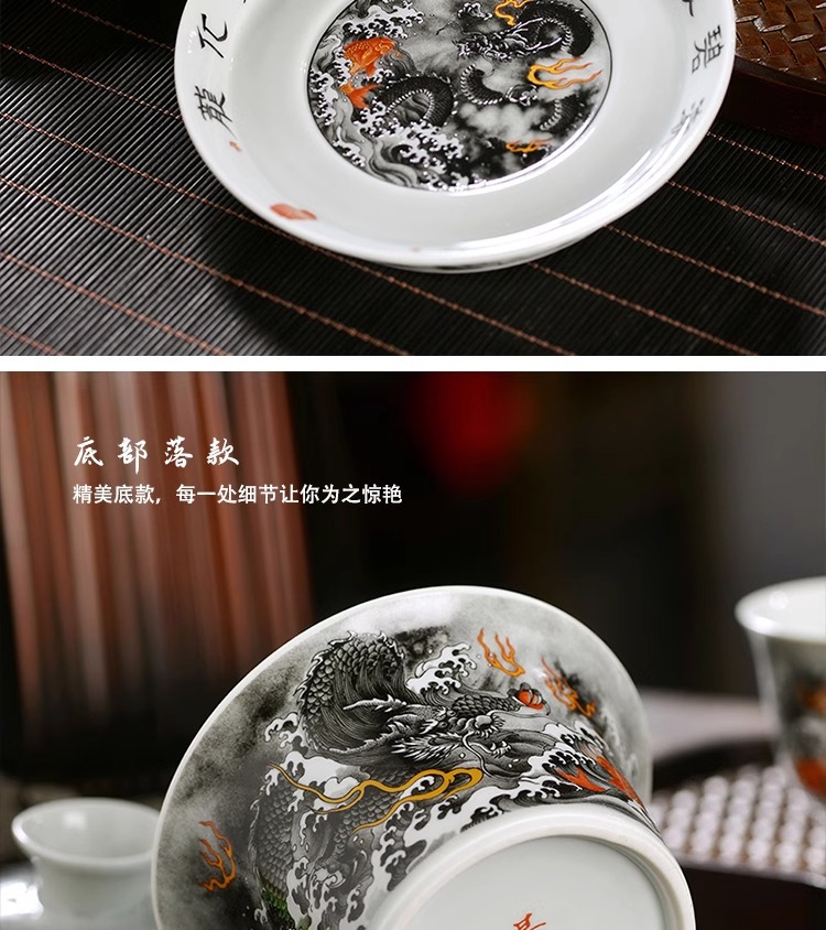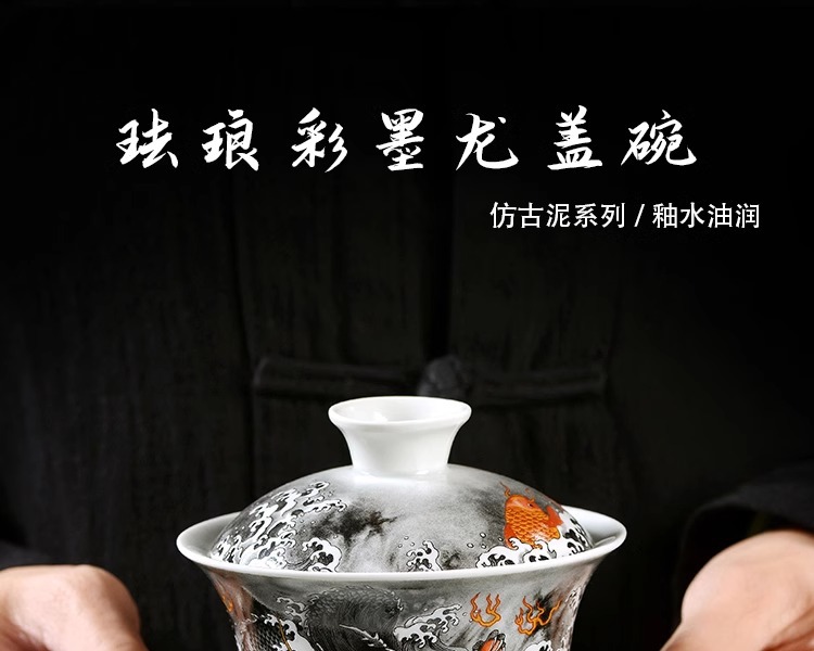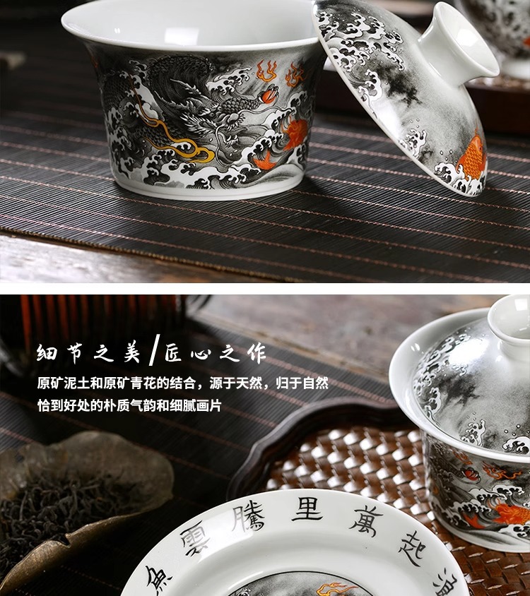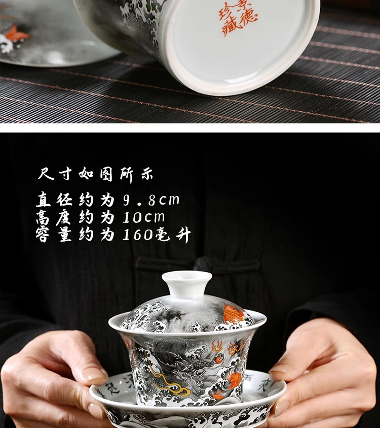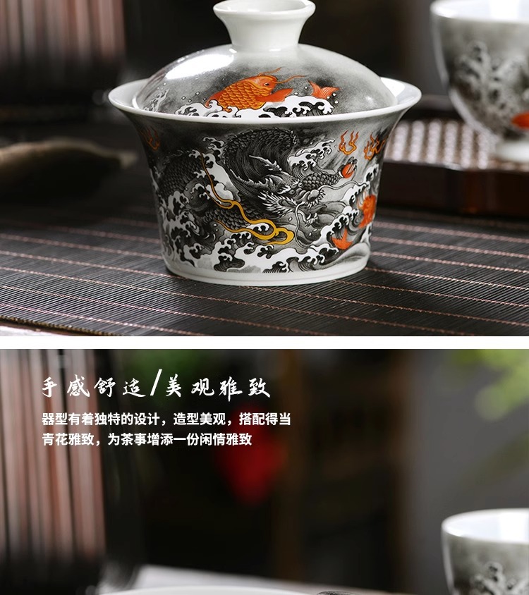 - Jingdezhen mực màu Cá hóa long tam tài Bát Nắp bát pha trà không nóng bộ đồ trà Kung Fu gốm sứ gia dụng cỡ lớn