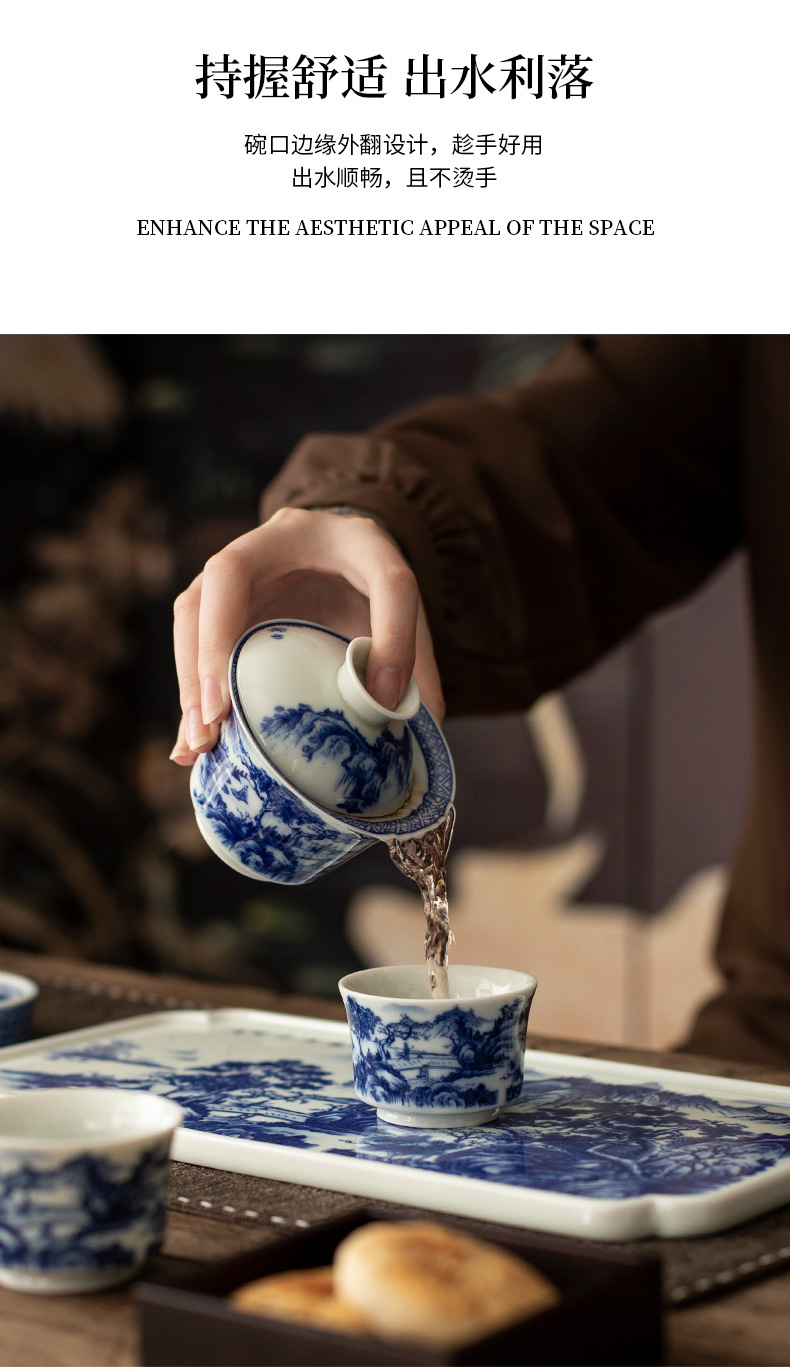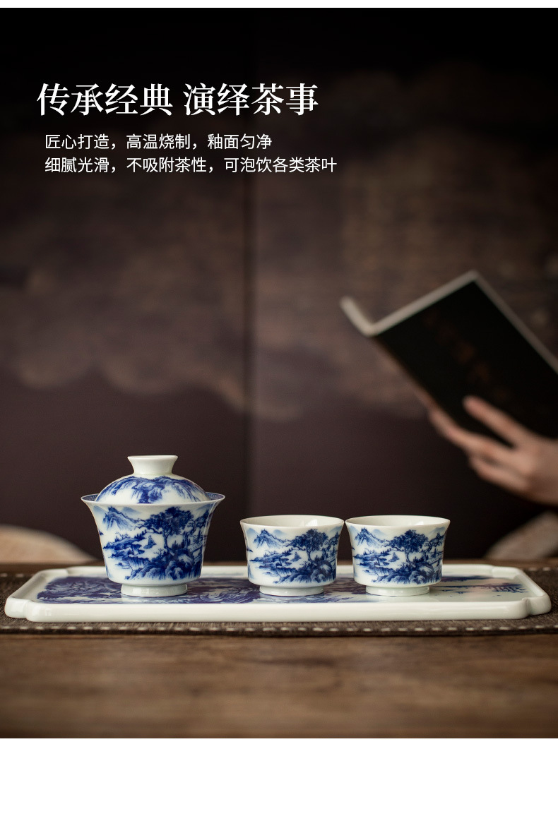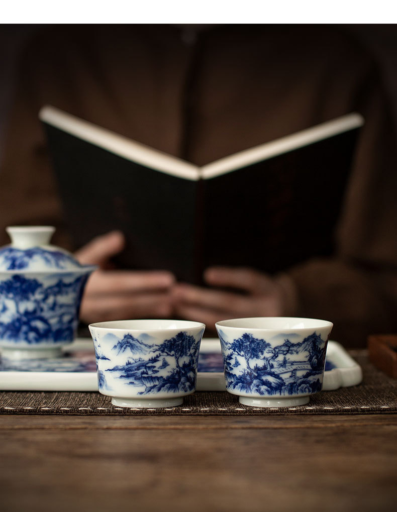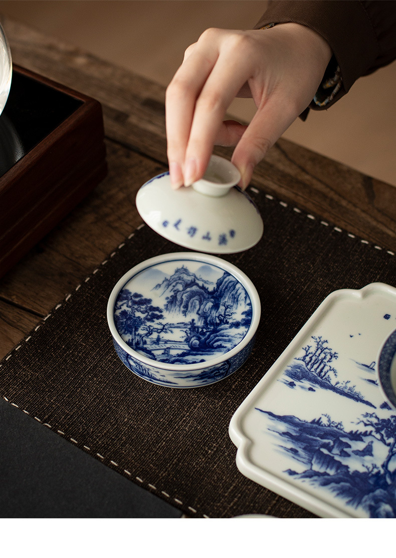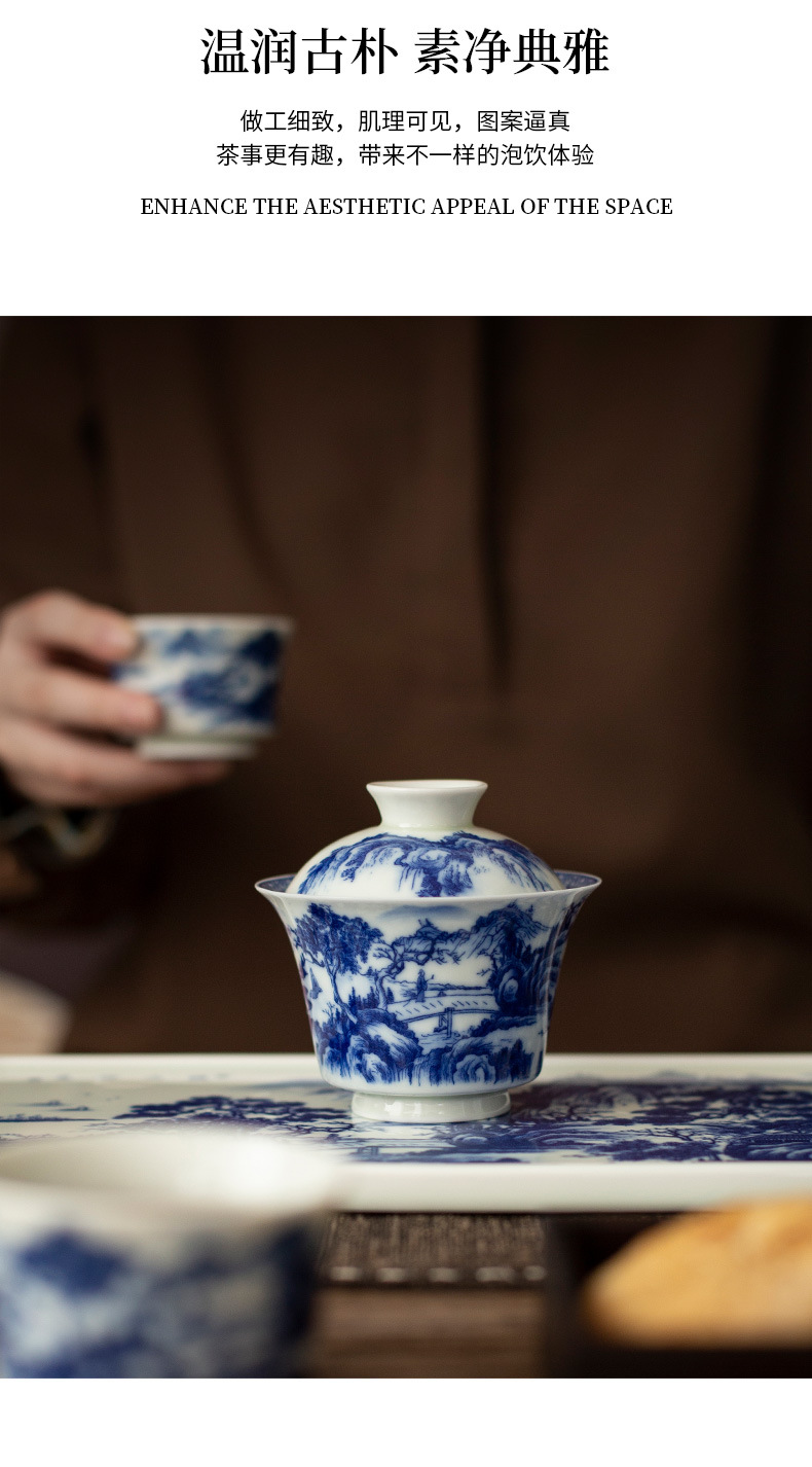 - Jingdezhen tráng men màu retro màu xanh và trắng bát nắp phong cảnh cốc trà bộ trà Kung Fu cao cấp dụng cụ trà gốm sứ khay pha khô