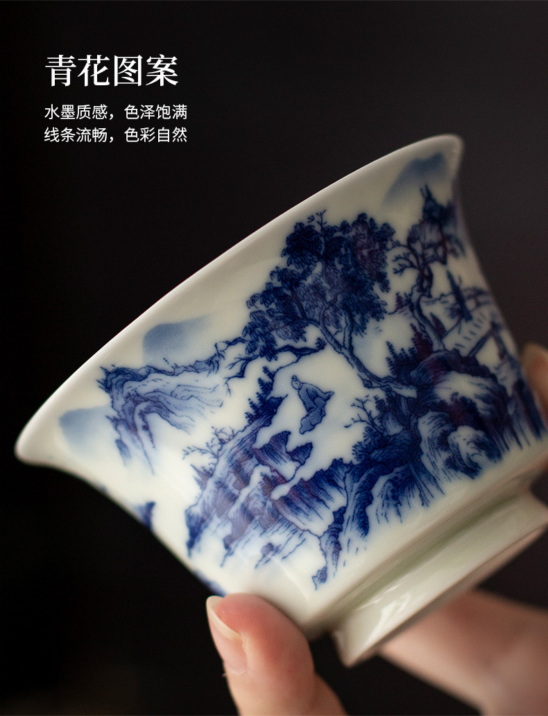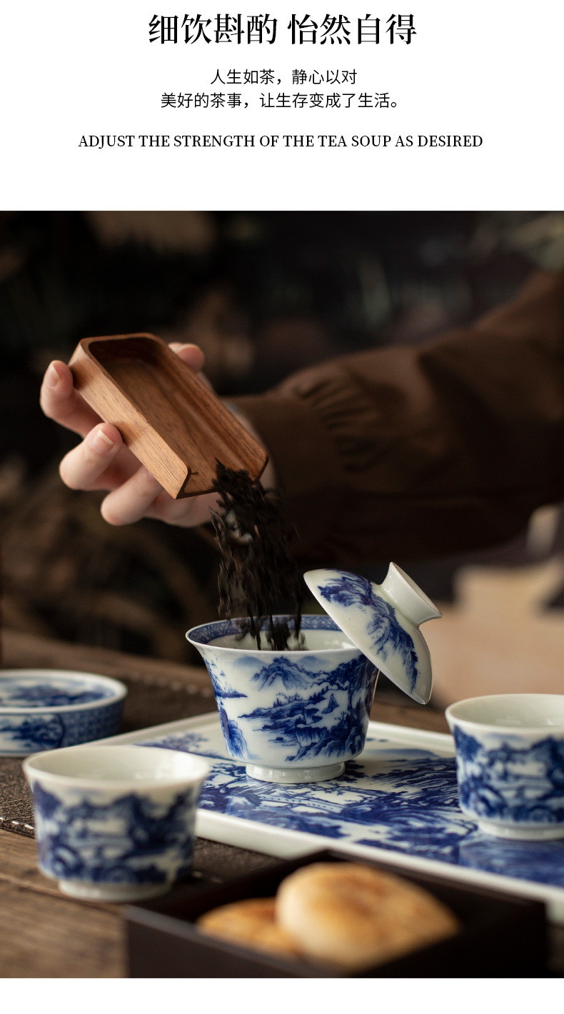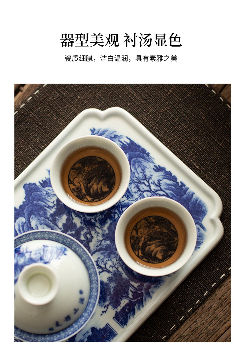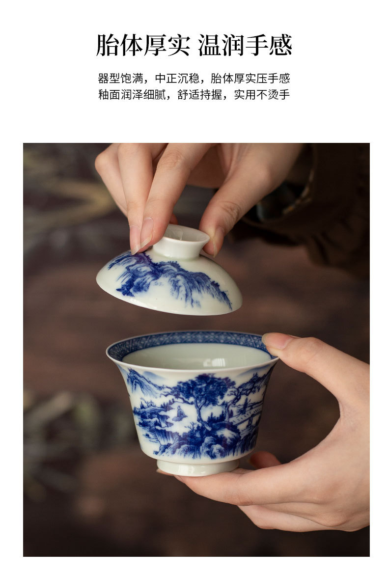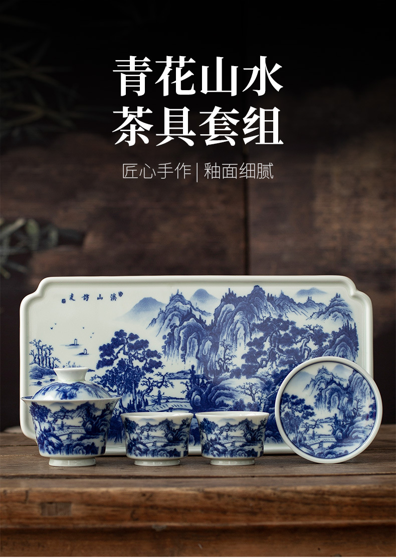 - Jingdezhen tráng men màu retro màu xanh và trắng bát nắp phong cảnh cốc trà bộ trà Kung Fu cao cấp dụng cụ trà gốm sứ khay pha khô