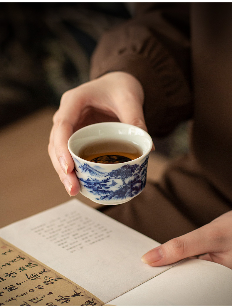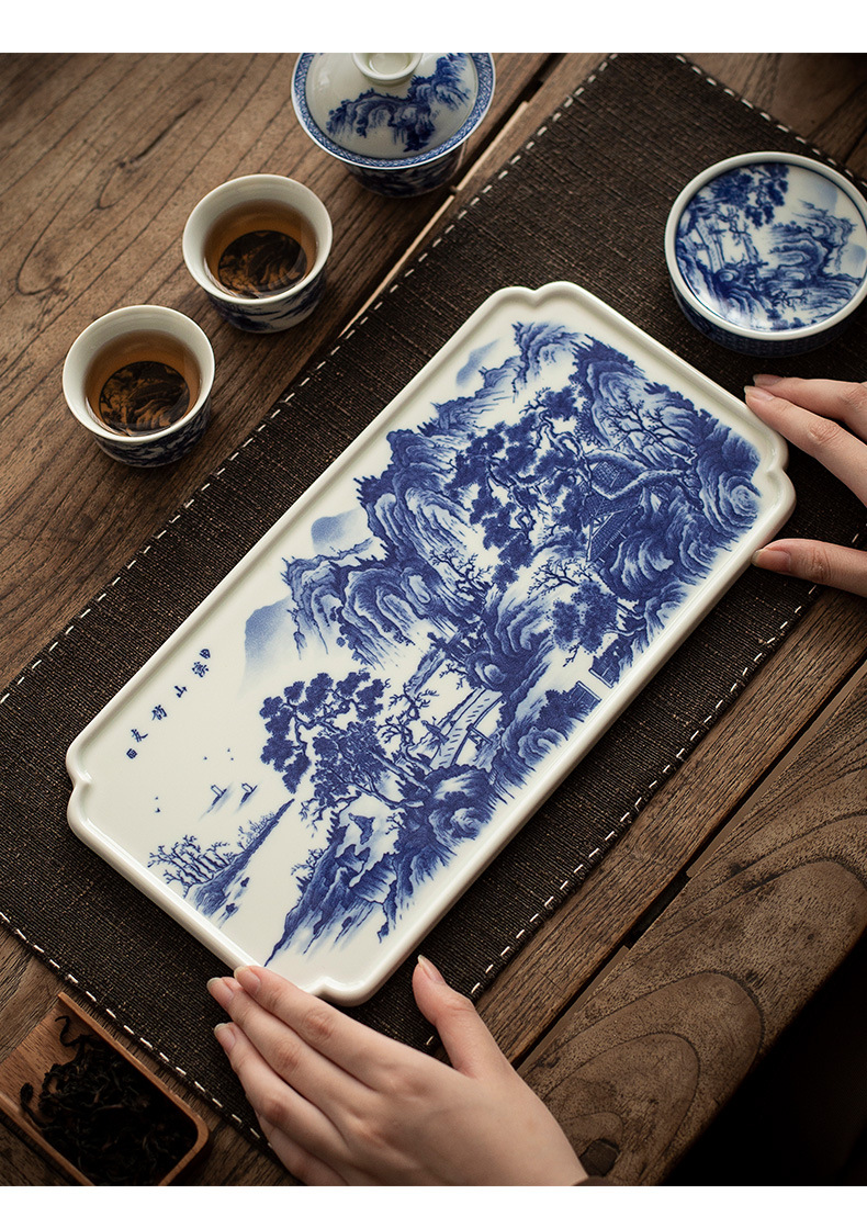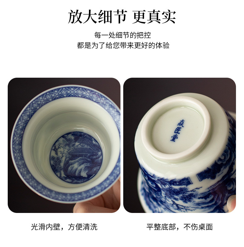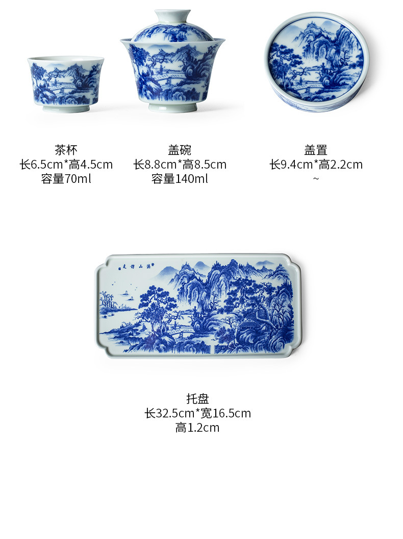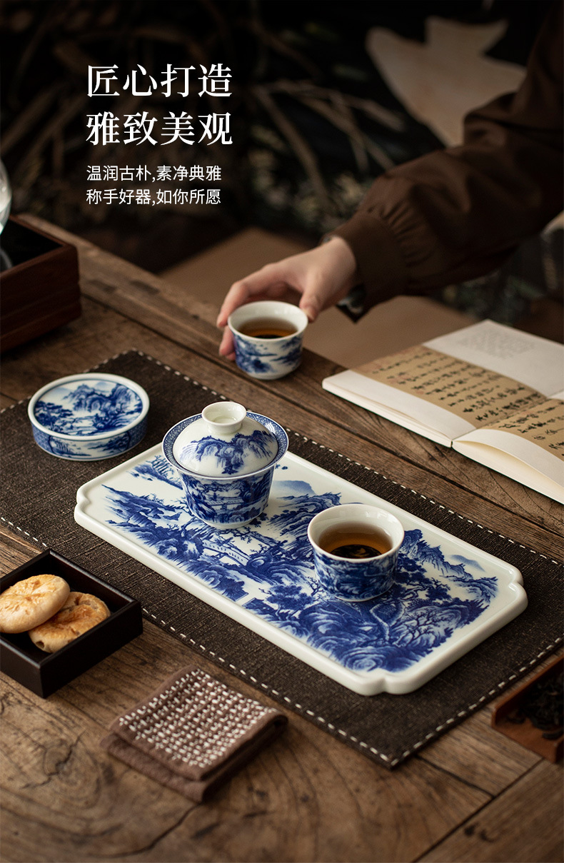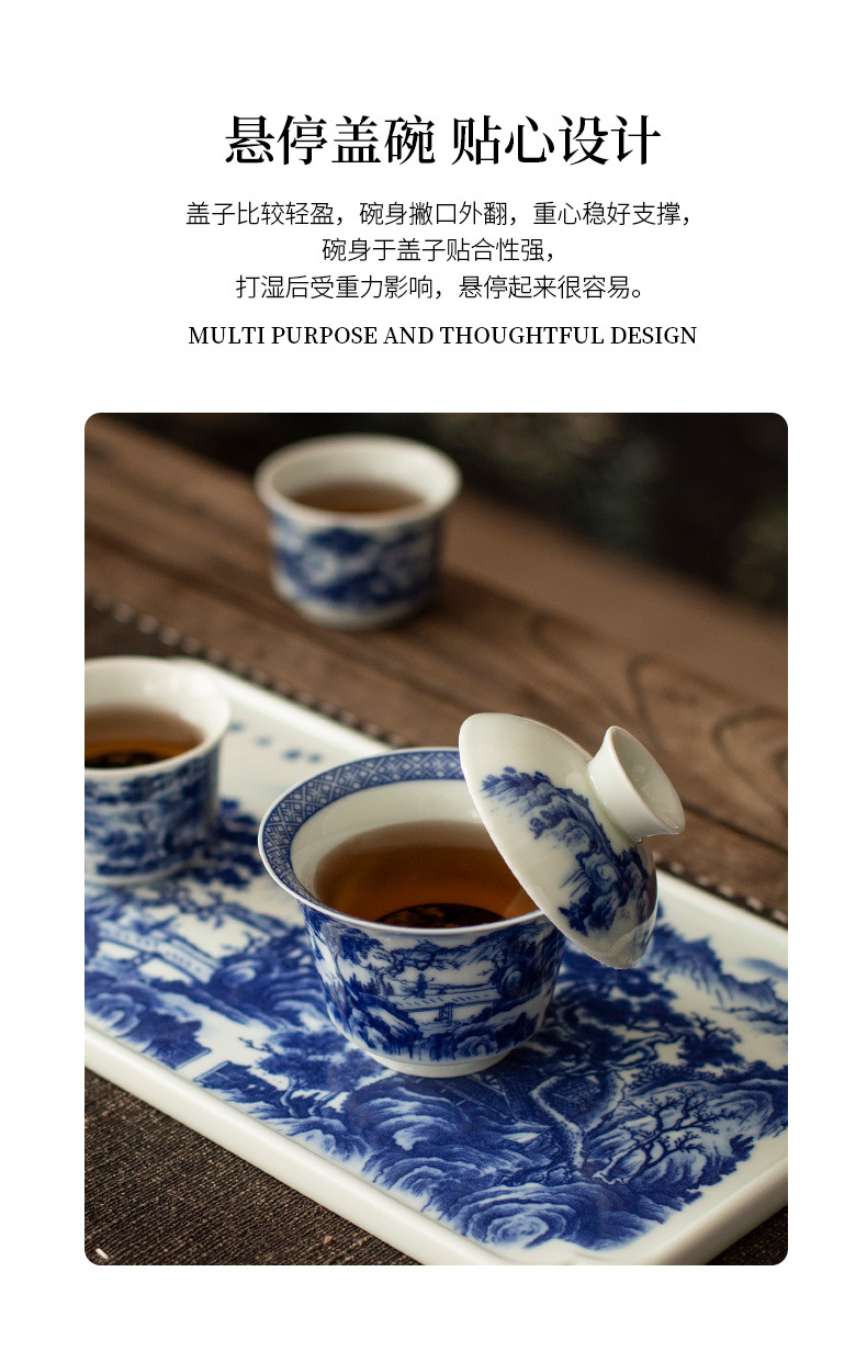 - Jingdezhen tráng men màu retro màu xanh và trắng bát nắp phong cảnh cốc trà bộ trà Kung Fu cao cấp dụng cụ trà gốm sứ khay pha khô