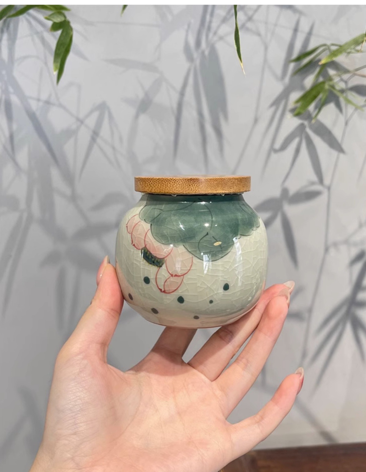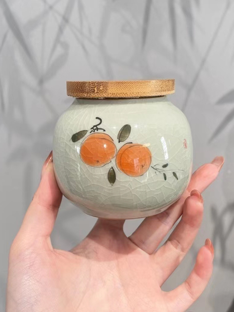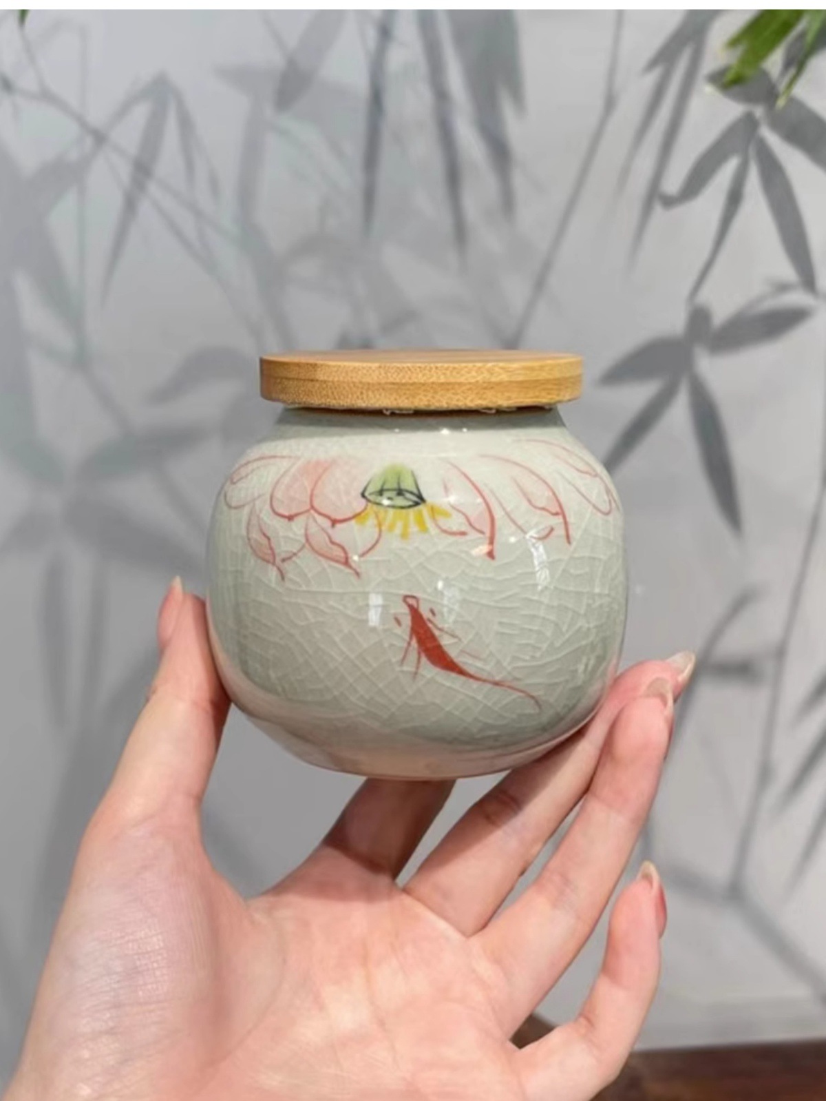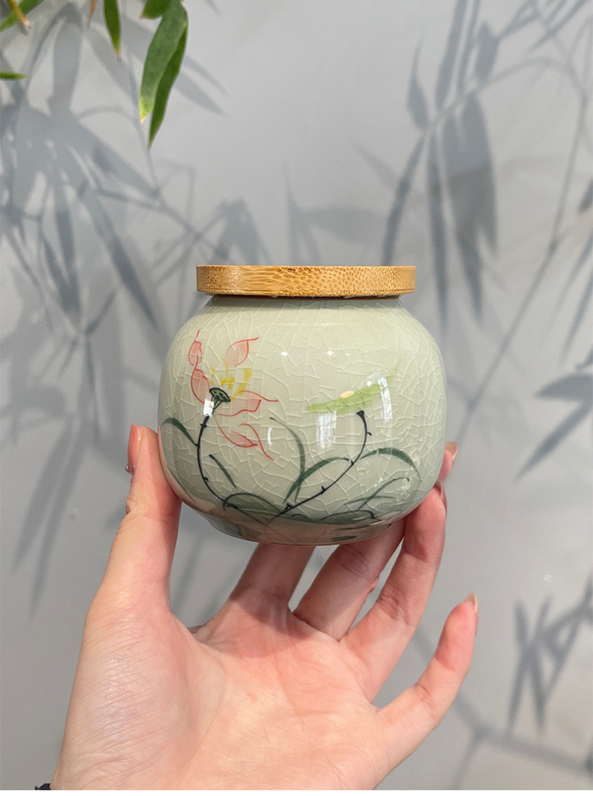 Jingzhe vẽ tay hoa sen nhỏ niêm phong bình trà men nứt băng bình bảo quản trà kiểu Trung Quốc mở nắp trúc ngăn trà chống ẩm