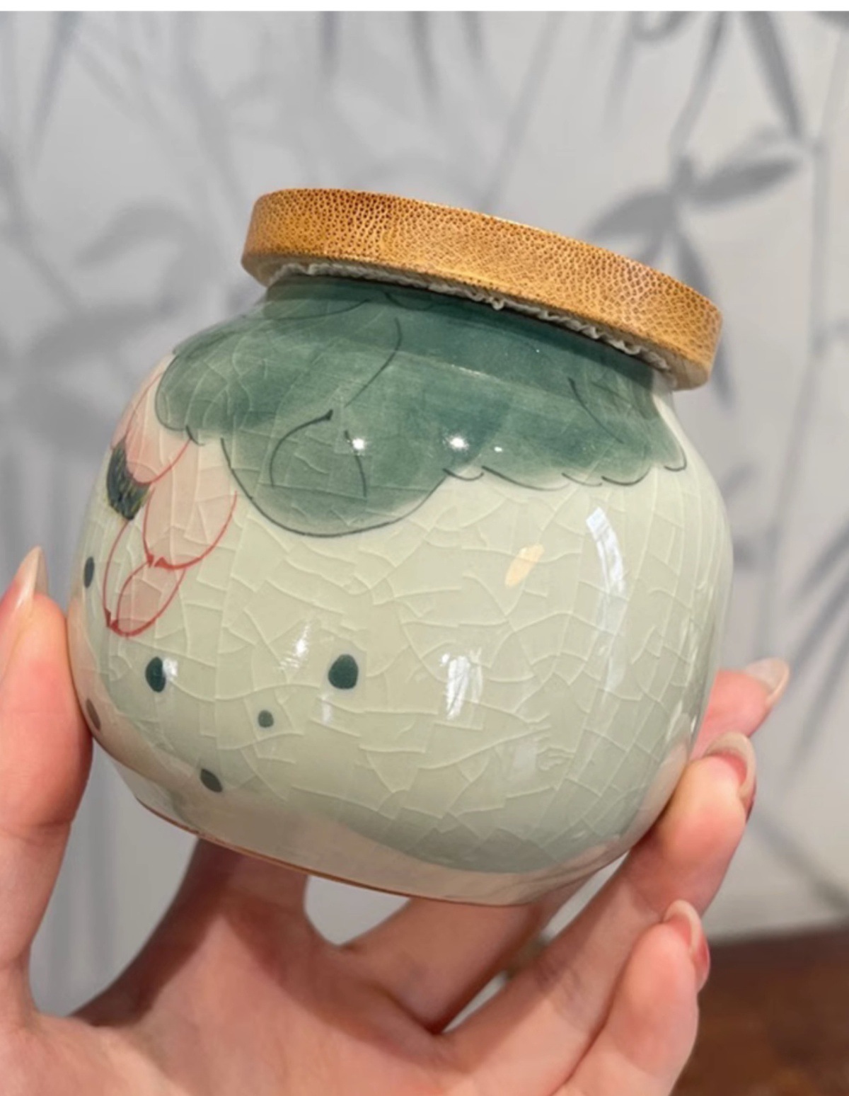 - Jingzhe vẽ tay hoa sen nhỏ niêm phong bình trà men nứt băng bình bảo quản trà kiểu Trung Quốc mở nắp trúc ngăn trà chống ẩm