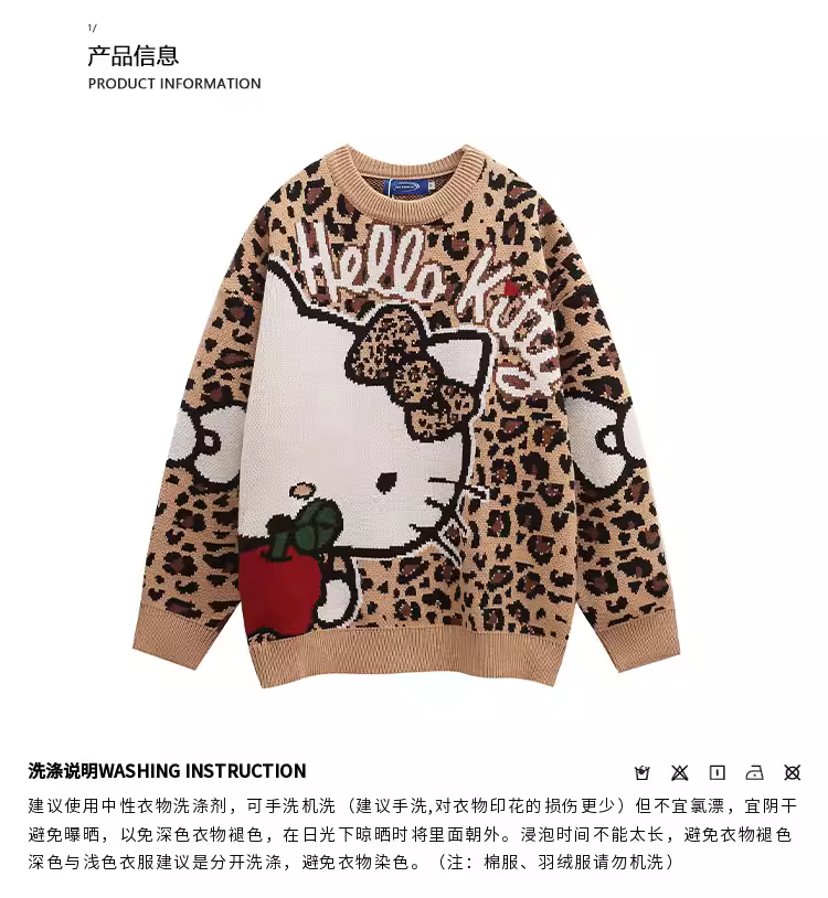 - K787 thiết kế độc đáo họa tiết da báo Hello Kitty vui nhộn dệt kim unisex kiểu Mỹ cổ điển dopamine áo len cặp đôi