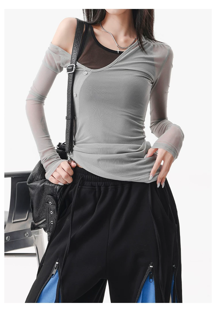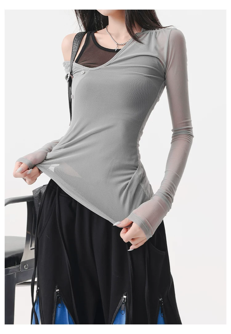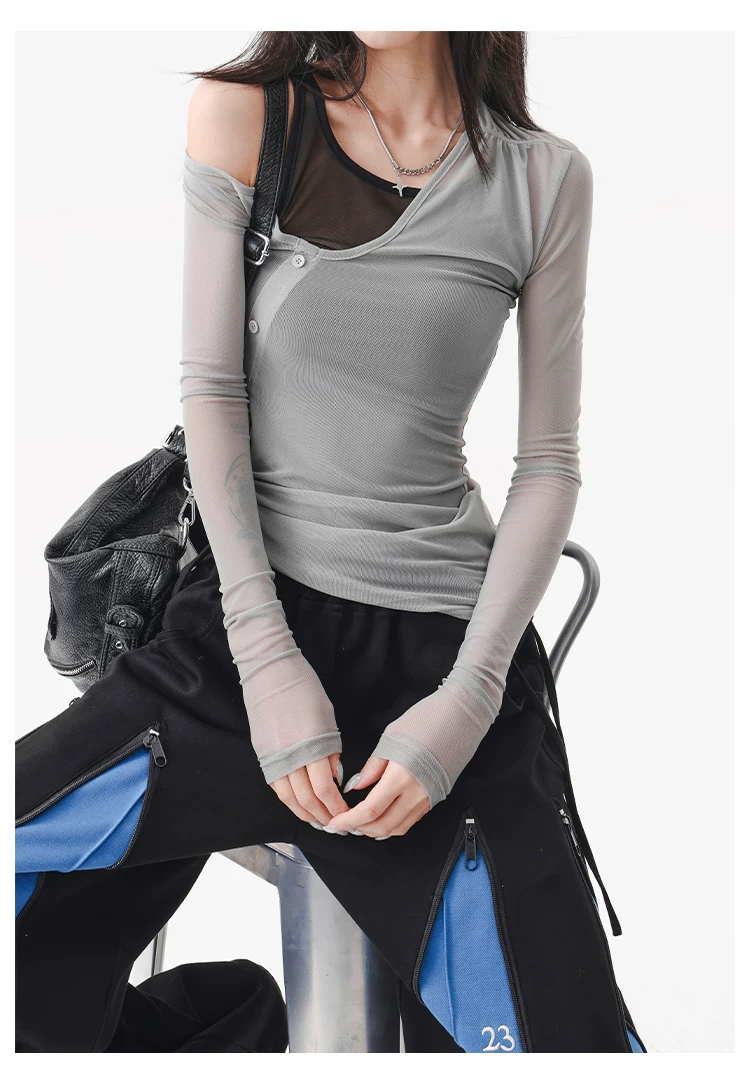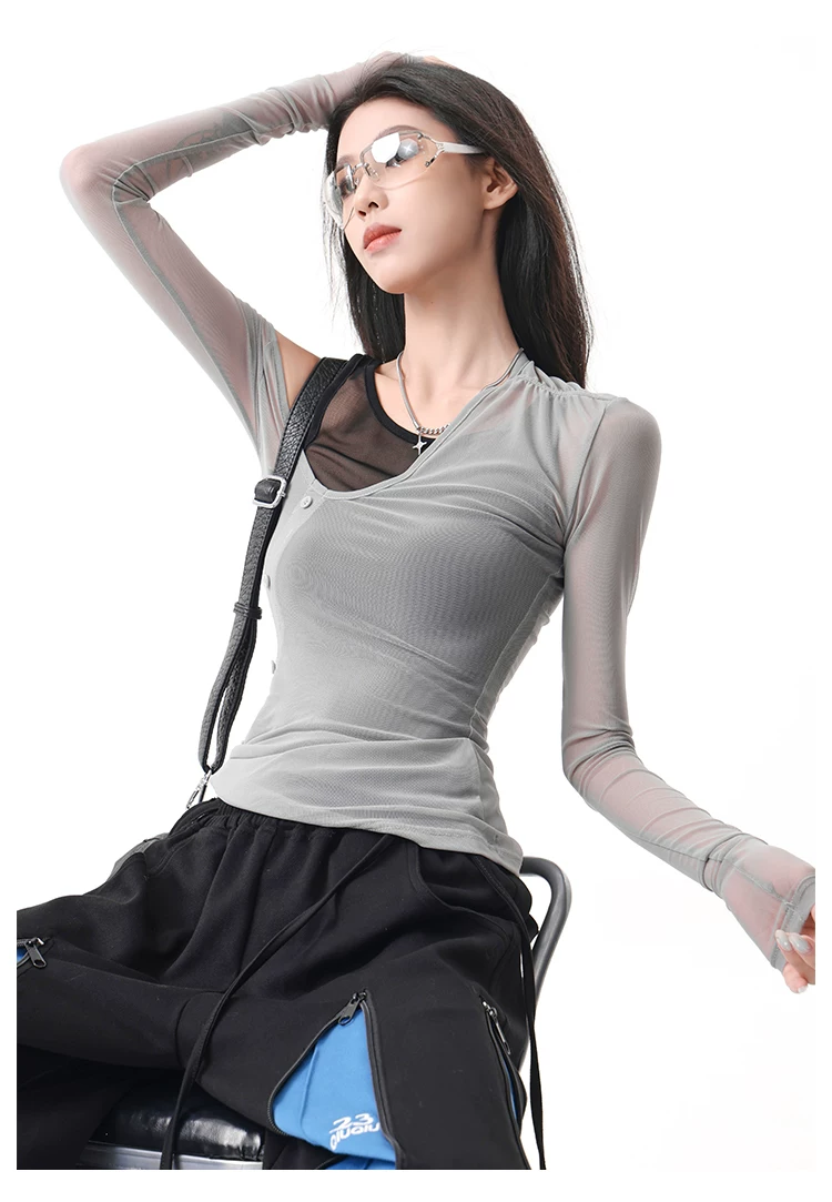 - KEN STUDIO áo ba lỗ màu xám dáng ôm vừa vặn chống nắng che nắng giả hai mảnh áo thun dài tay lưới