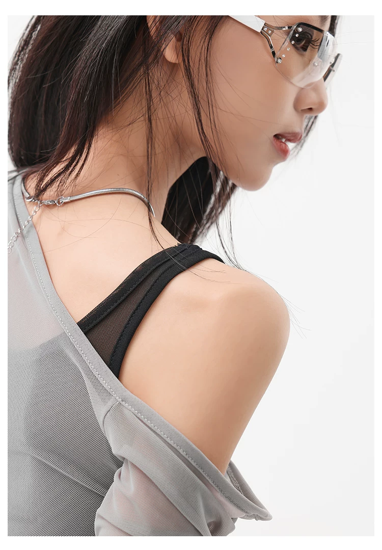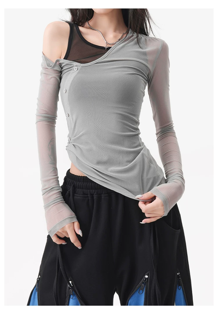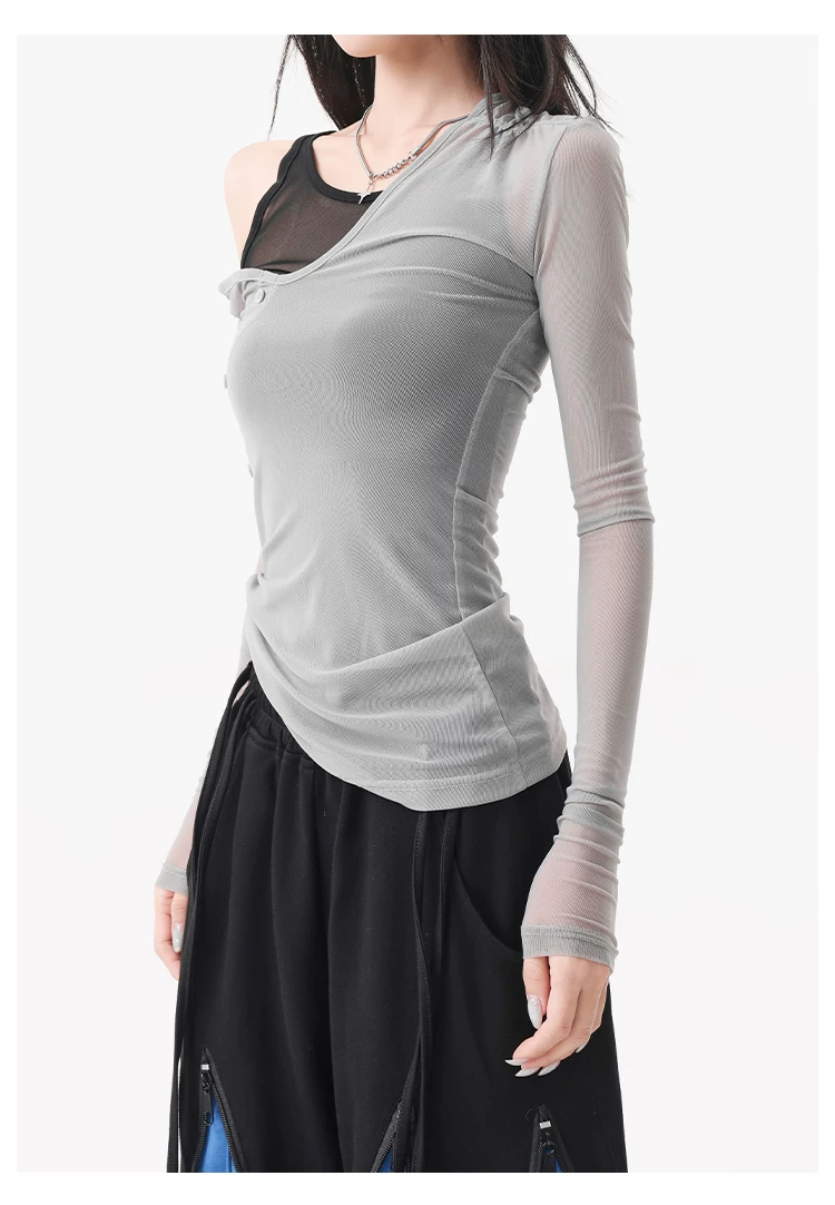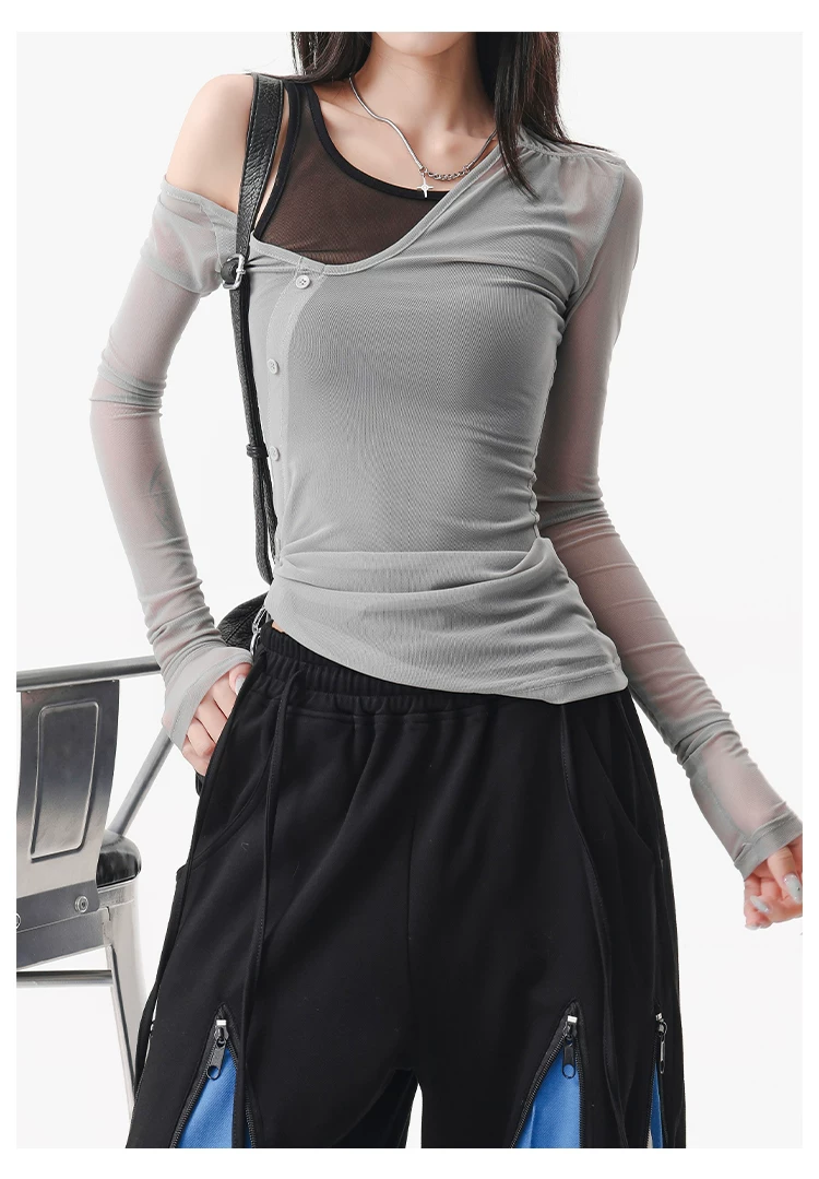 - KEN STUDIO áo ba lỗ màu xám dáng ôm vừa vặn chống nắng che nắng giả hai mảnh áo thun dài tay lưới