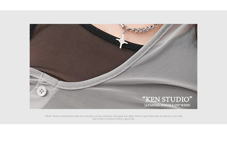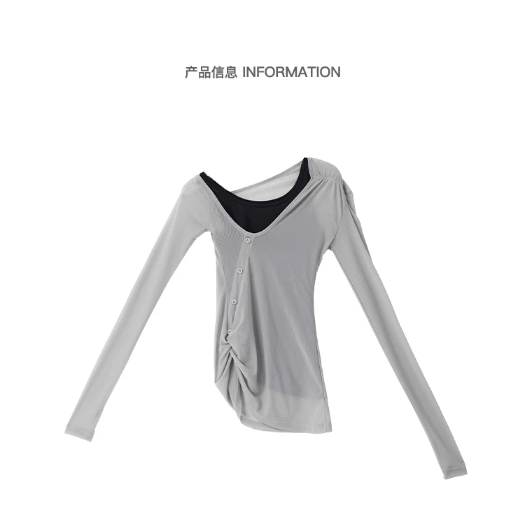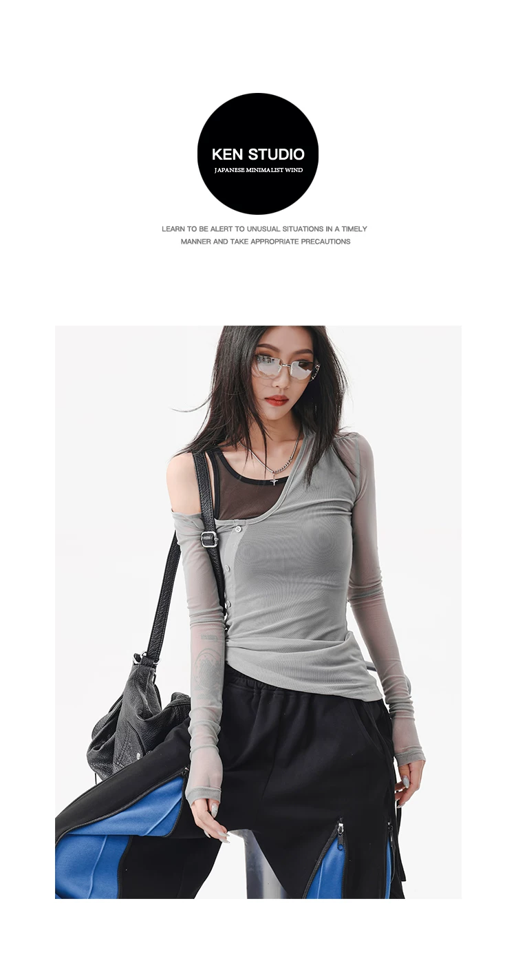 KEN STUDIO áo ba lỗ màu xám dáng ôm vừa vặn chống nắng che nắng giả hai mảnh áo thun dài tay lưới