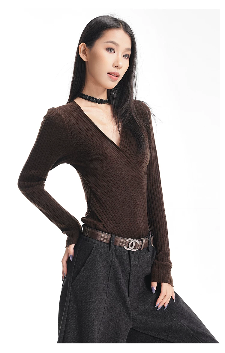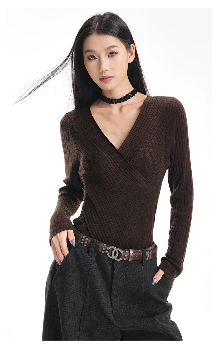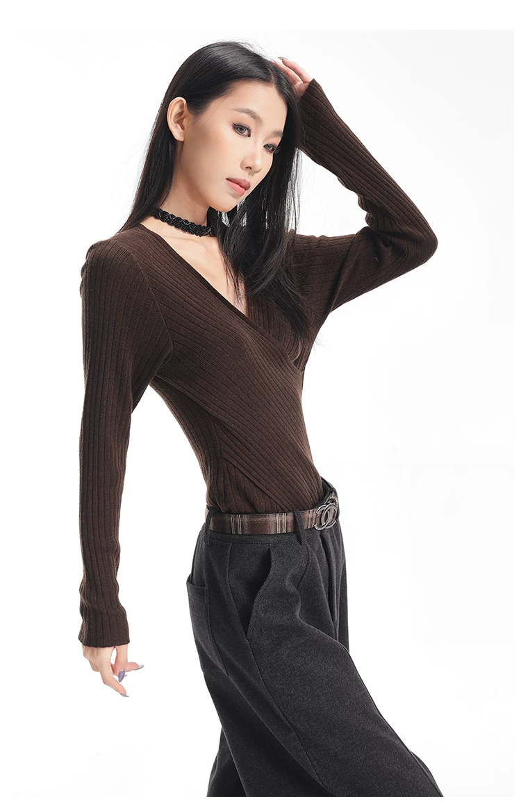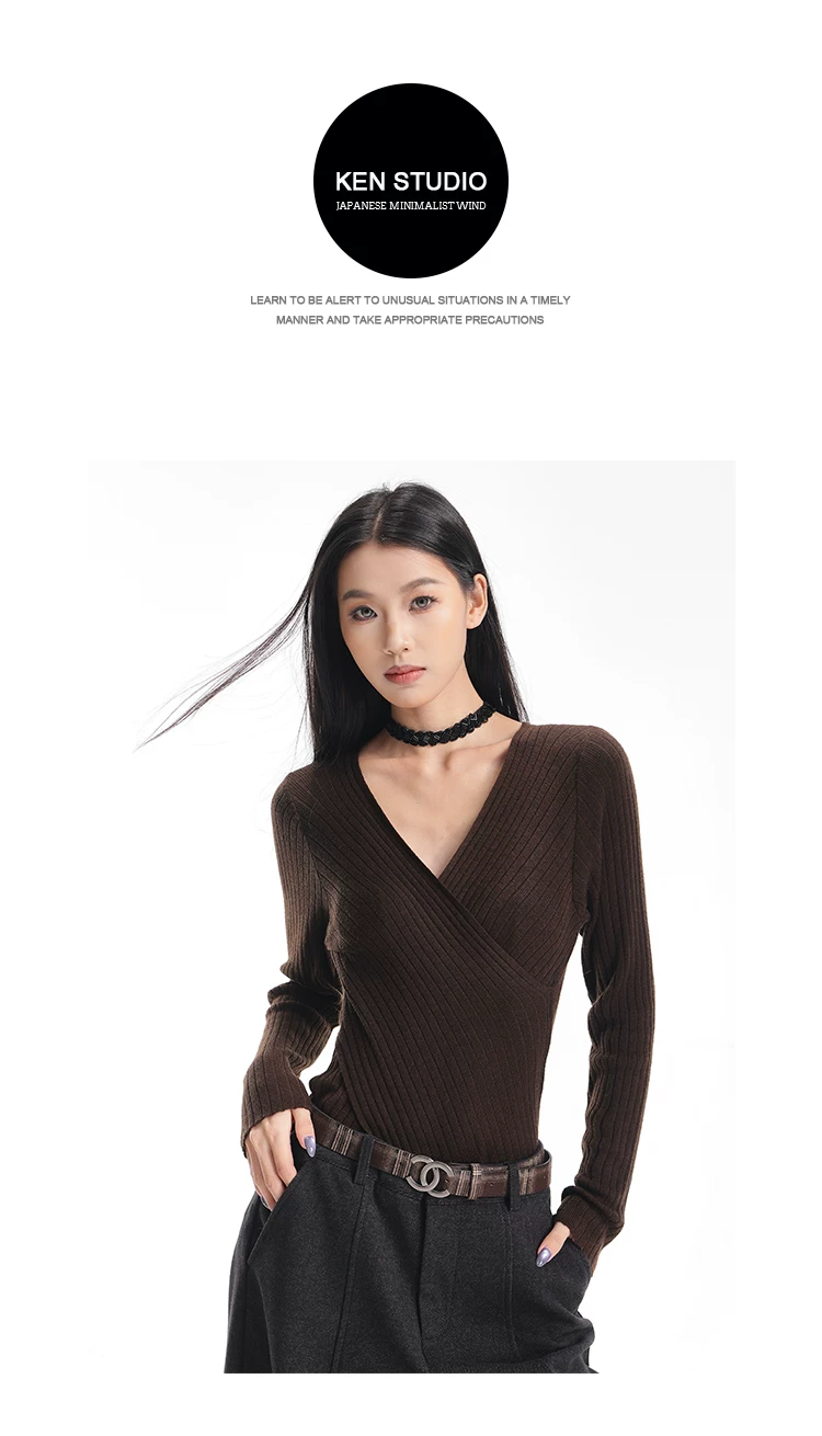 - KEN STUDIO Áo dệt kim dài tay màu cà phê mùa thu đông mới dành cho nữ có cổ chữ V, kiểu dáng ôm sát và tạo vẻ thon gọn với áo lót bên trong