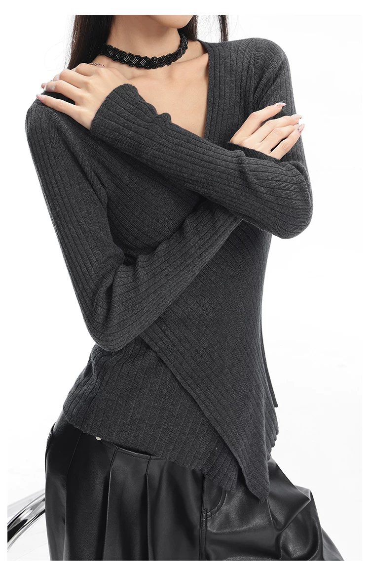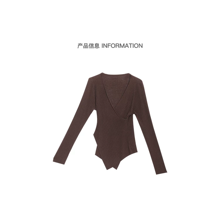 KEN STUDIO Áo dệt kim dài tay màu cà phê mùa thu đông mới dành cho nữ có cổ chữ V, kiểu dáng ôm sát và tạo vẻ thon gọn với áo lót bên trong
