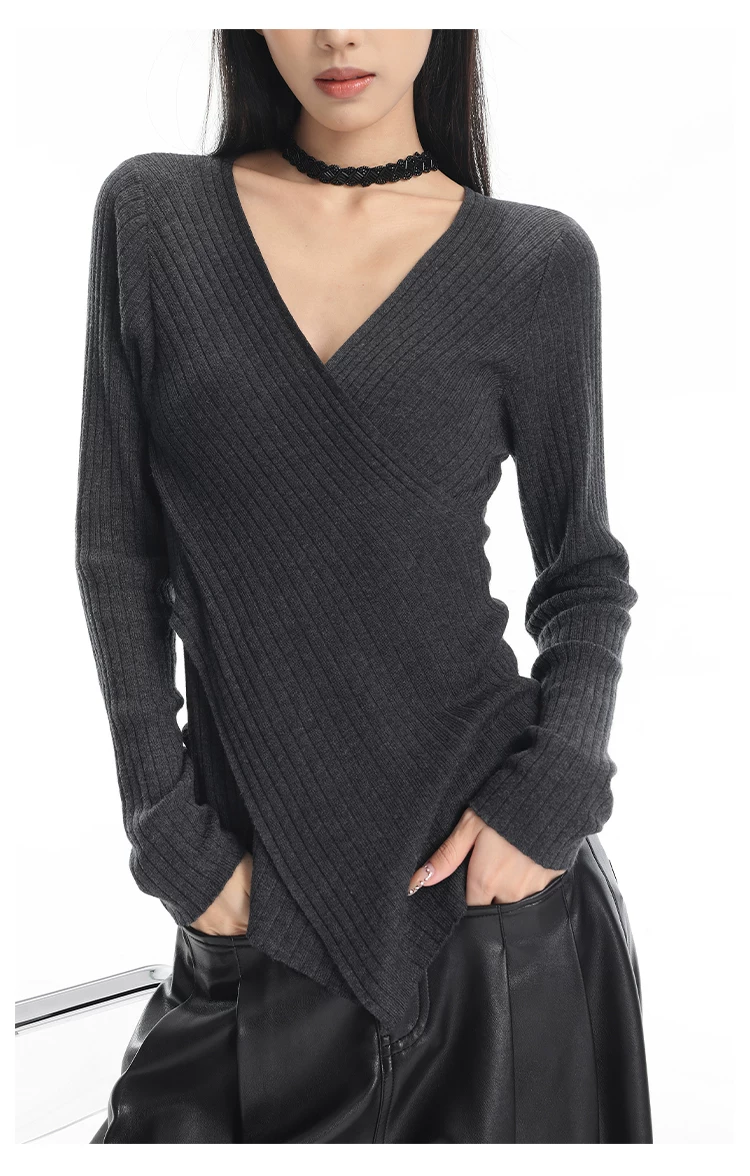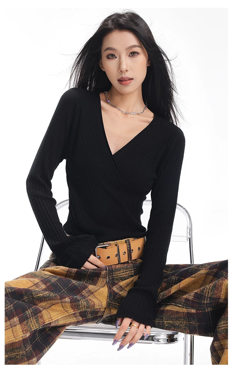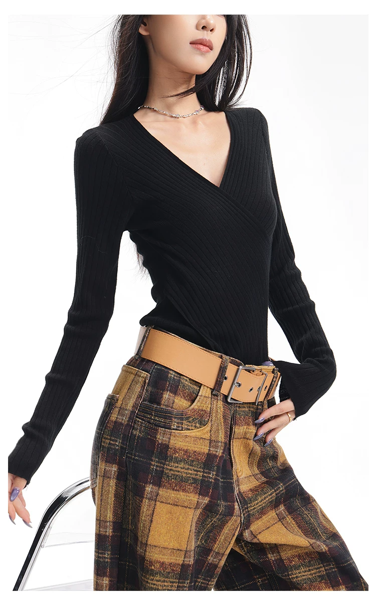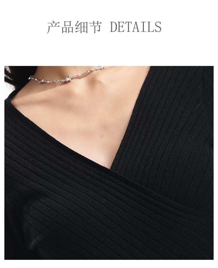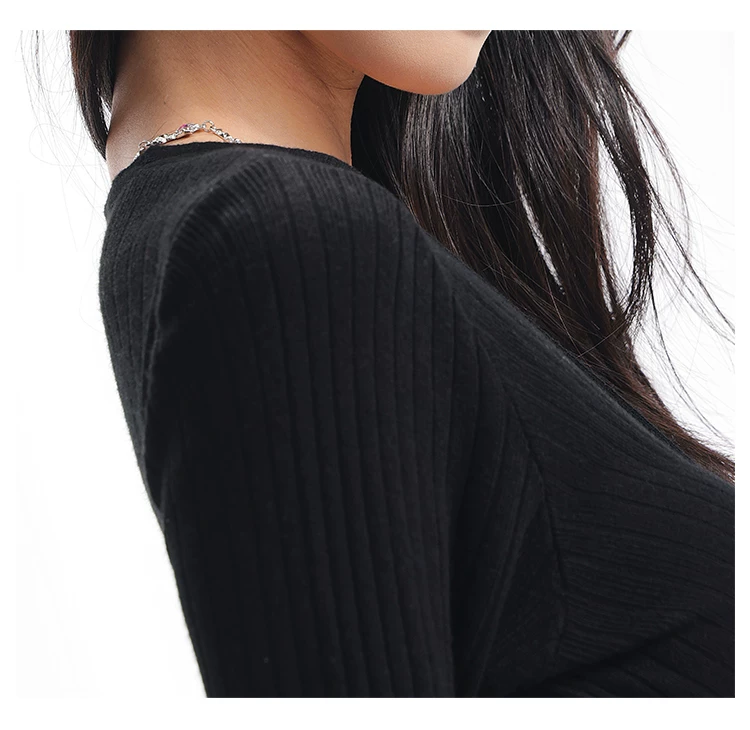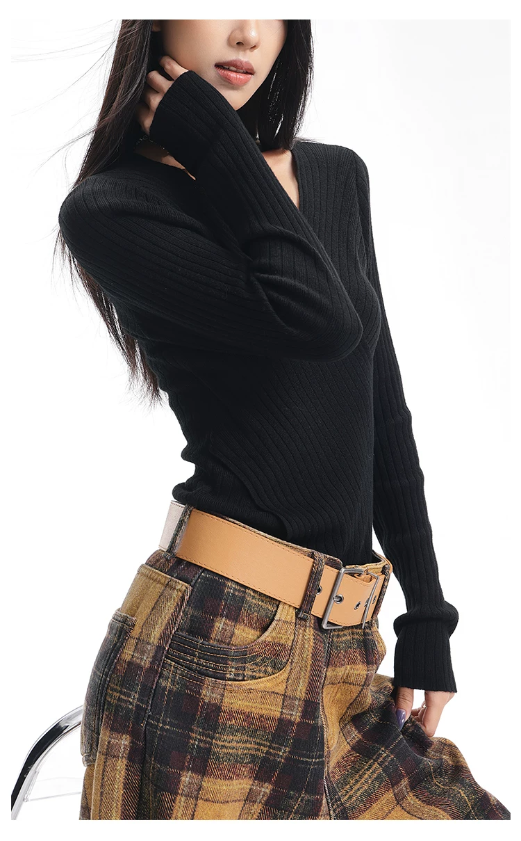 - KEN STUDIO Áo dệt kim dài tay màu đen thu đông mới dành cho nữ, cổ chữ V, ôm vừa vặn, áo lót đa năng, áo bên trong