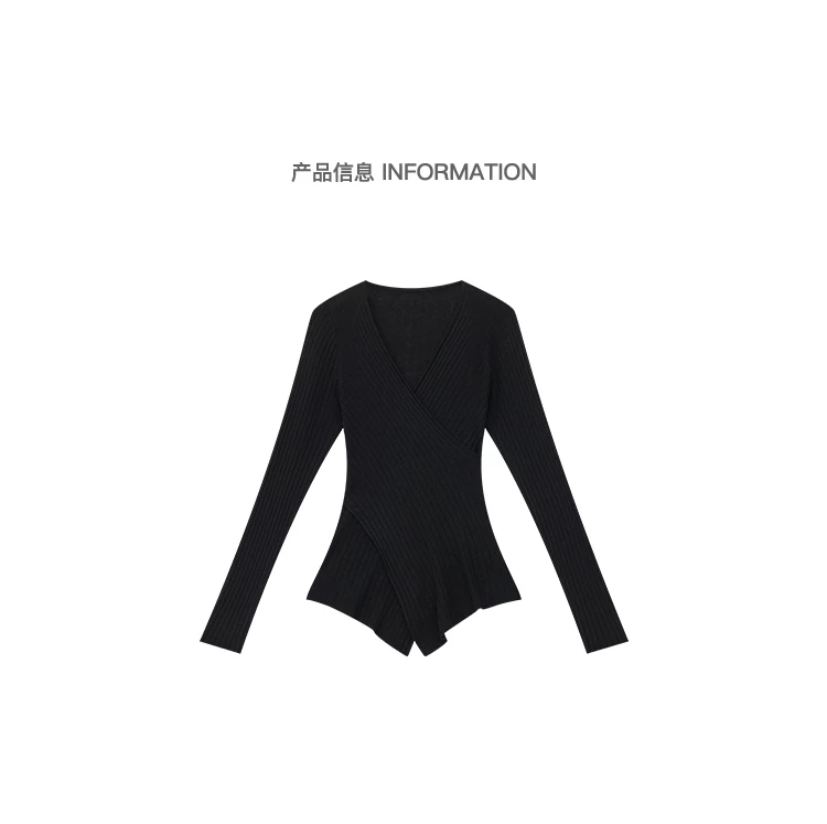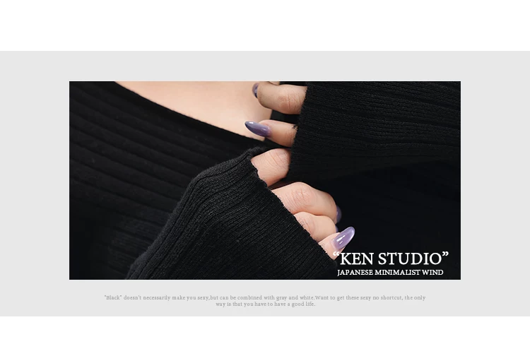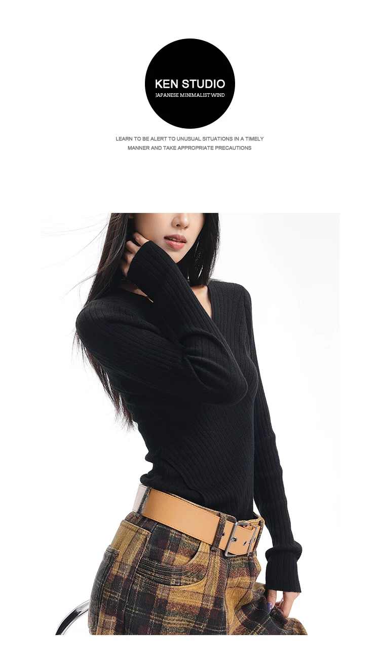 KEN STUDIO Áo dệt kim dài tay màu đen thu đông mới dành cho nữ, cổ chữ V, ôm vừa vặn, áo lót đa năng, áo bên trong