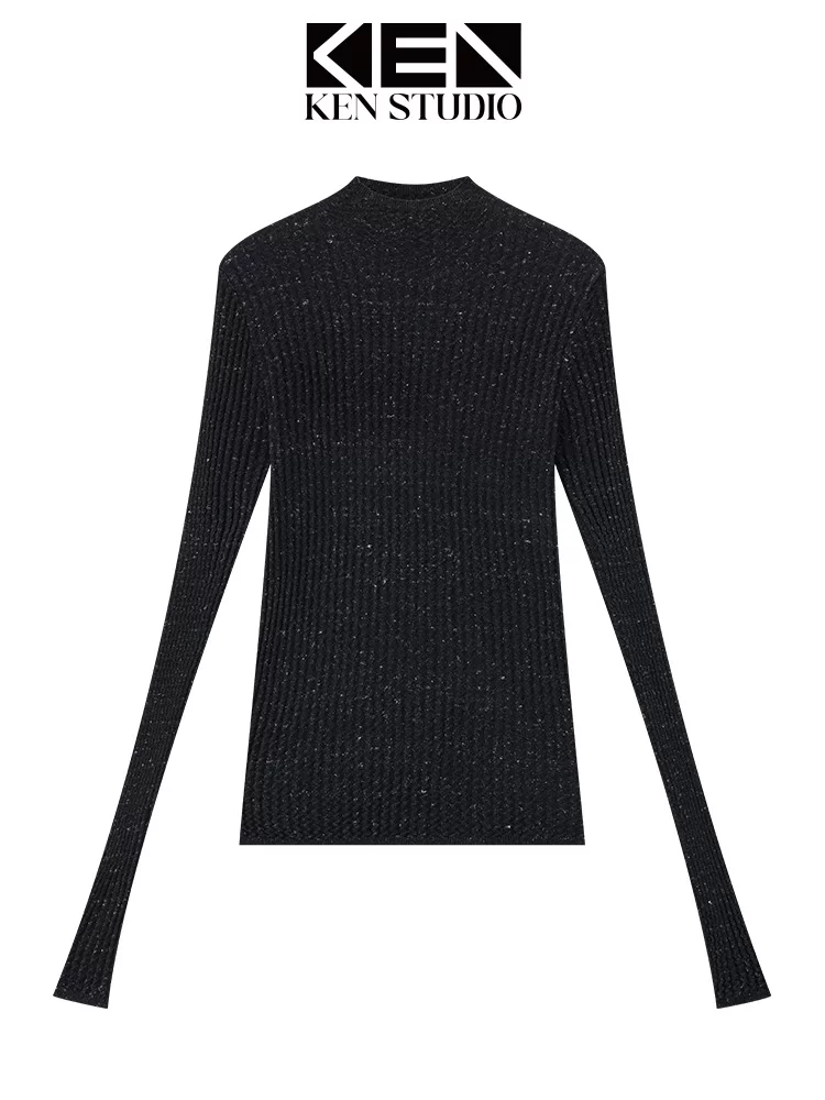 KEN STUDIO Áo dệt kim dài tay màu đen thu đông mới dành cho nữ với thiết kế tôn dáng và cổ áo nửa cao