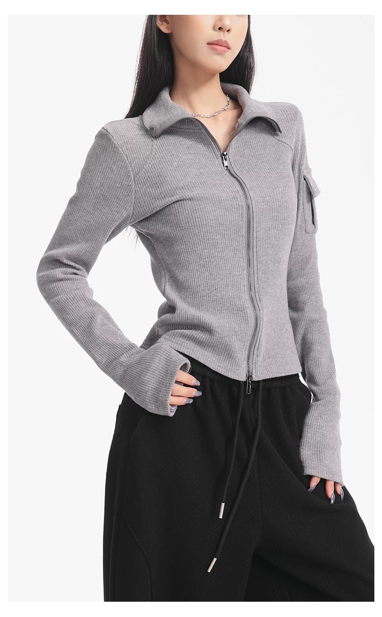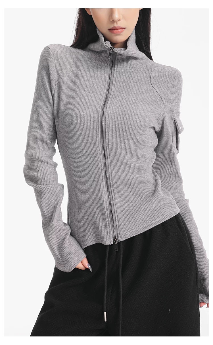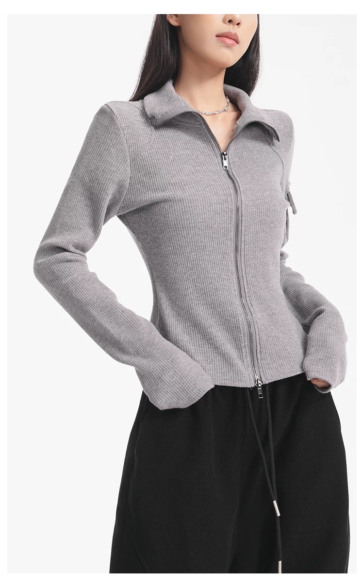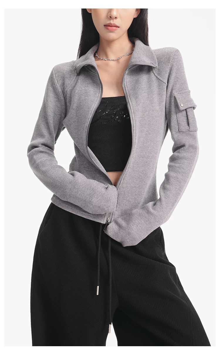 KEN STUDIO Áo khoác dệt kim màu xám mới mùa thu đông dành cho nữ có khóa kéo đôi ve áo cardigan dáng ôm dài tay