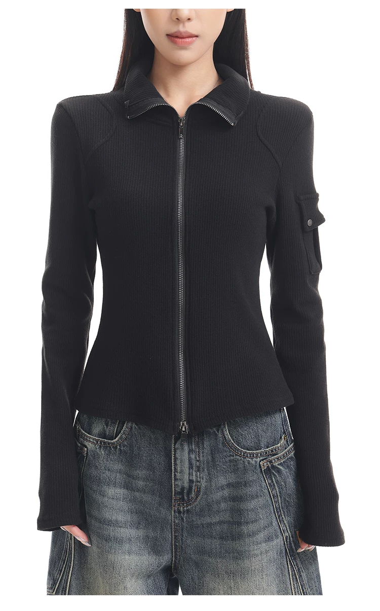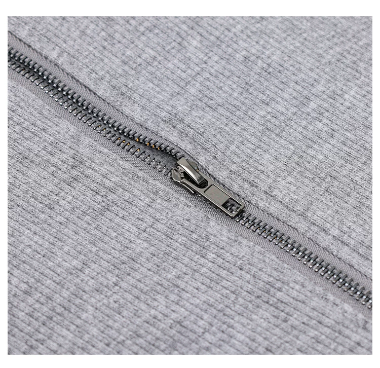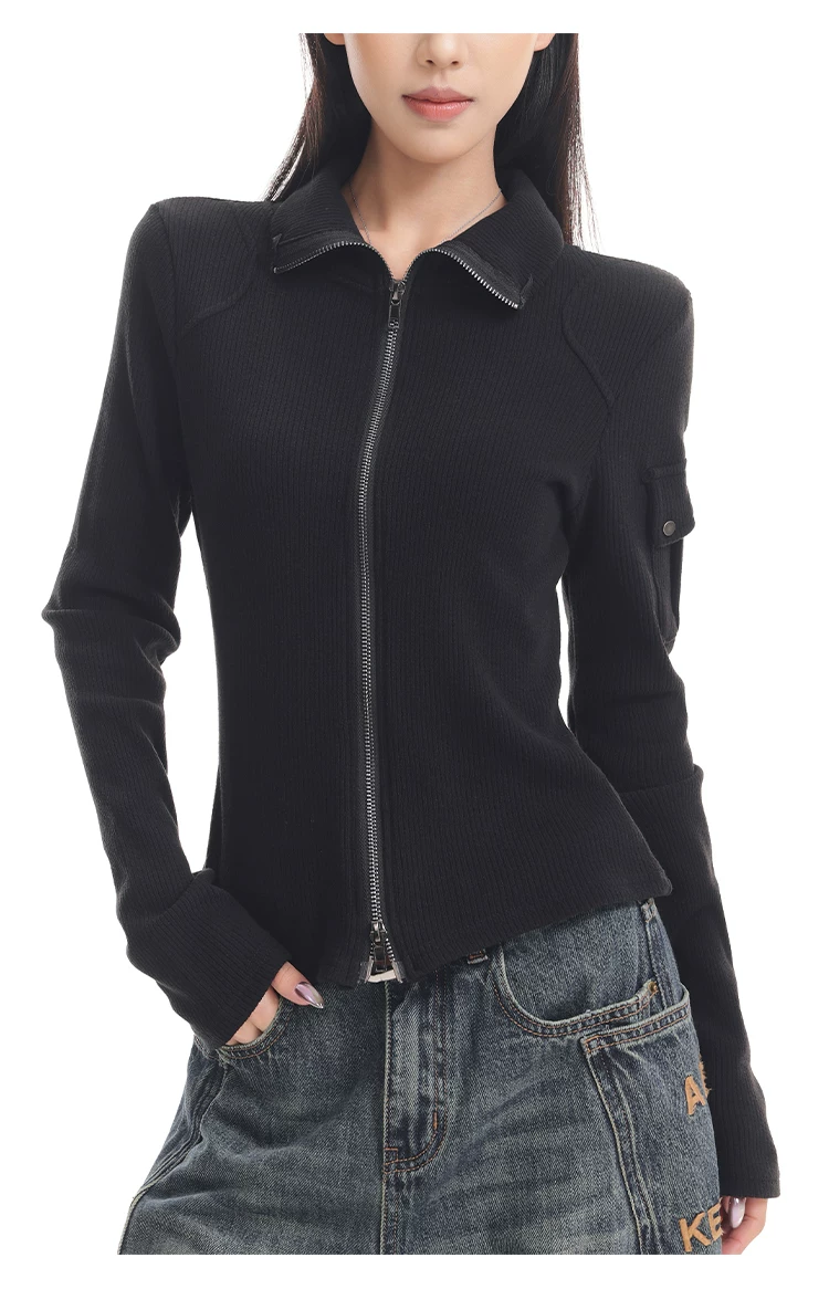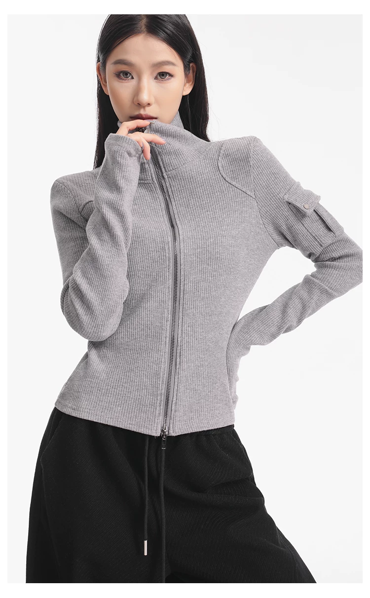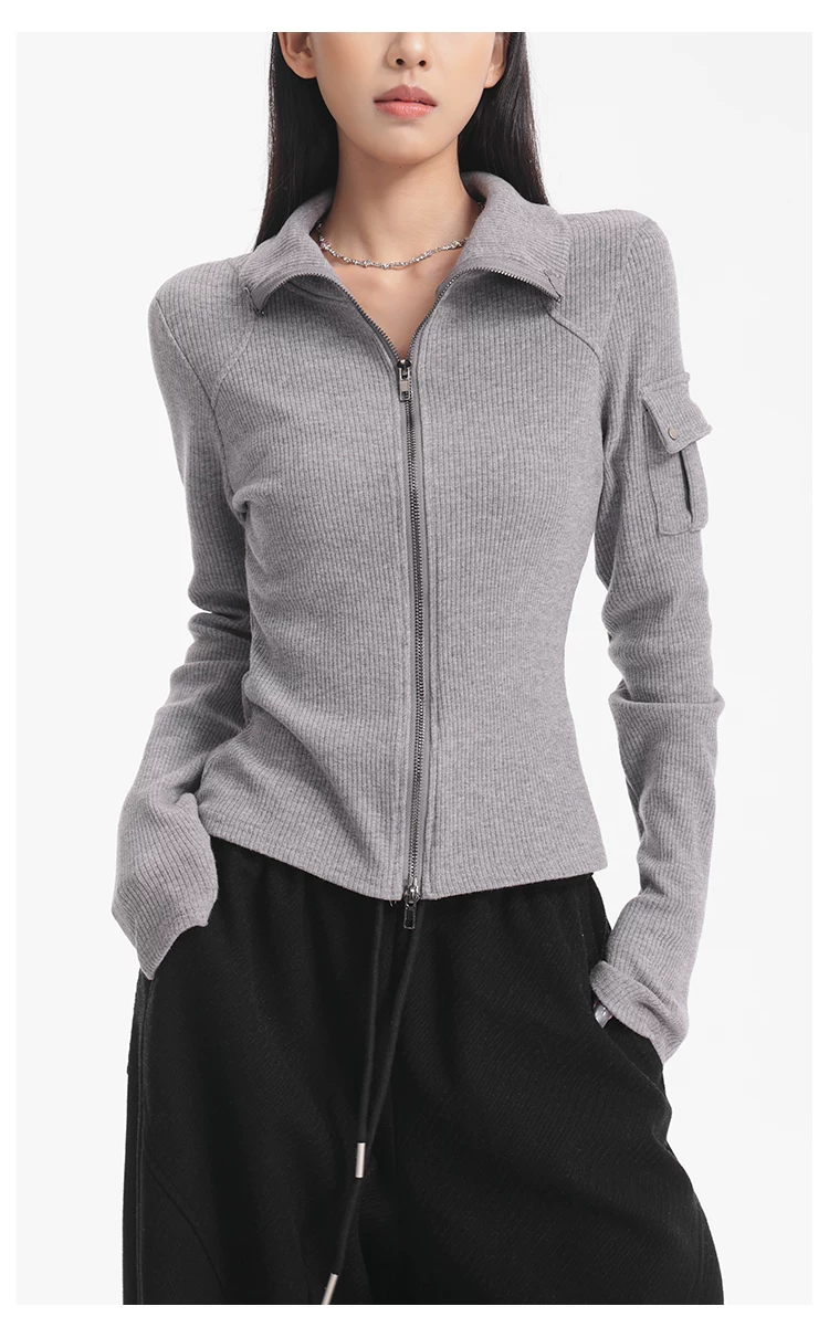 KEN STUDIO Áo khoác dệt kim màu xám mới mùa thu đông dành cho nữ có khóa kéo đôi ve áo cardigan dáng ôm dài tay