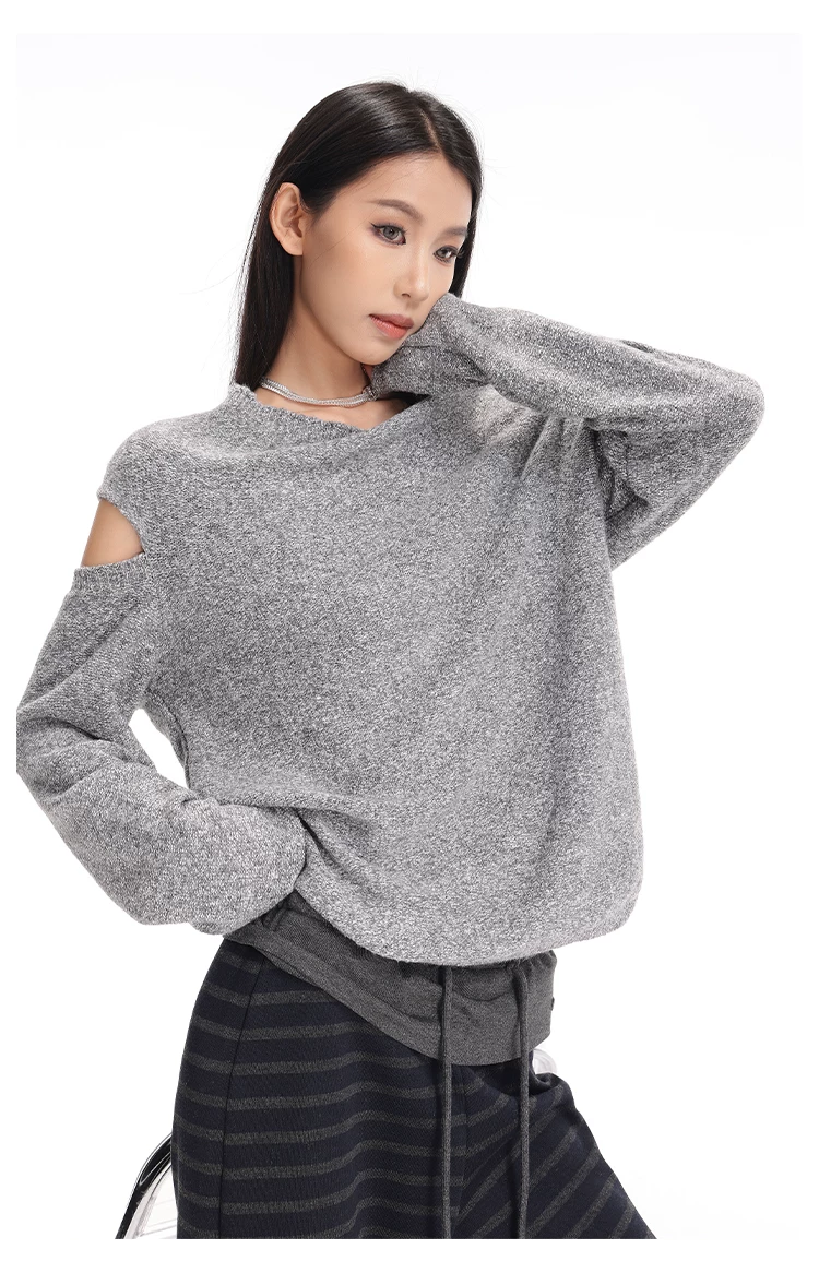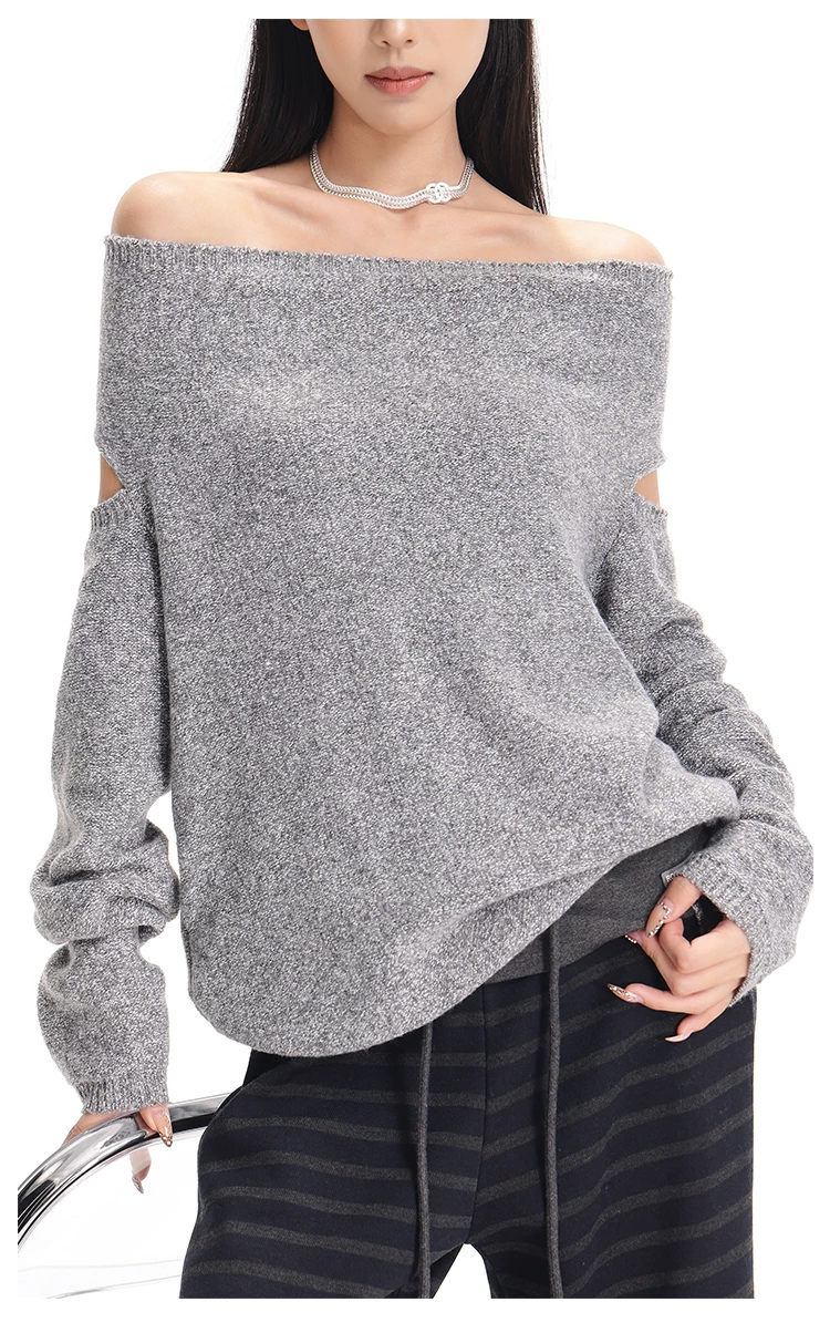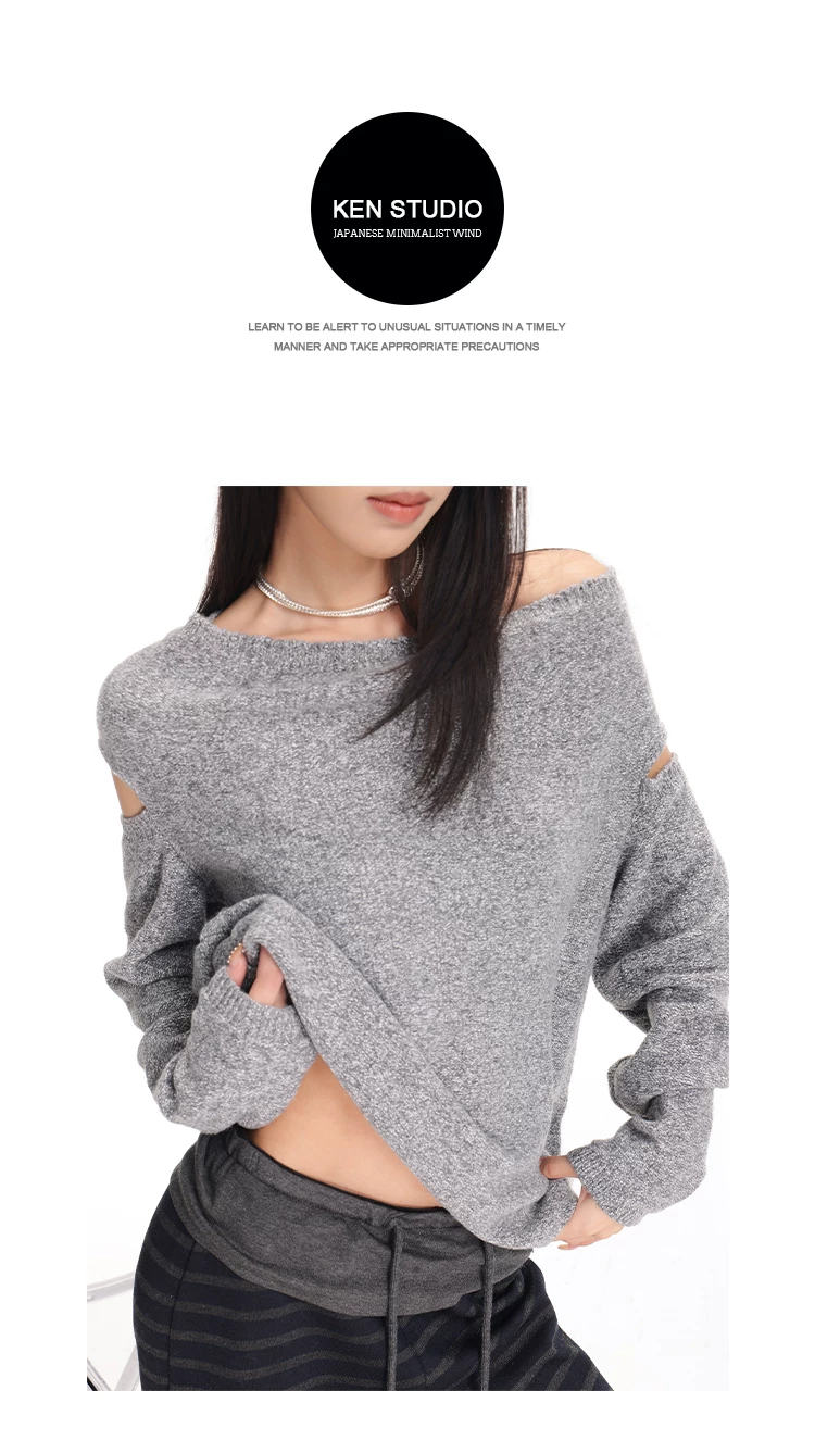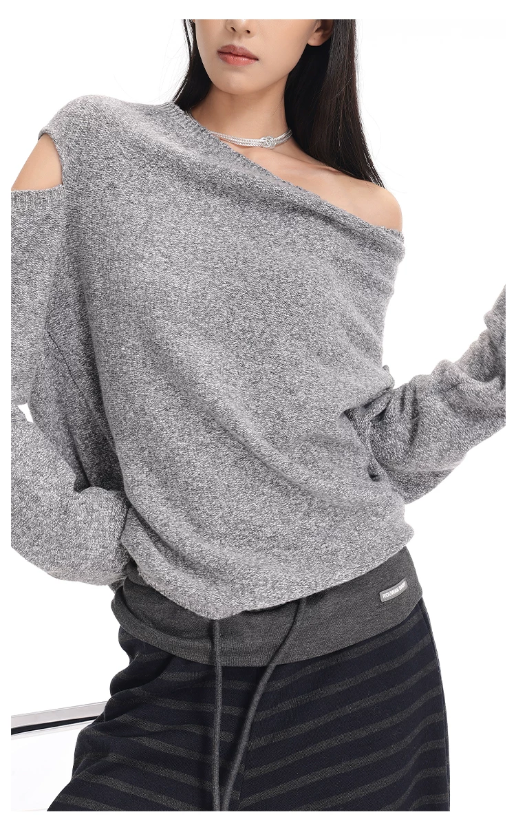 - KEN STUDIO Áo len chui đầu một vai màu xám mới thu đông dành cho nữ, áo len trễ vai kiểu dáng lười biếng thanh lịch