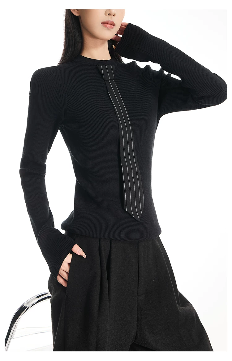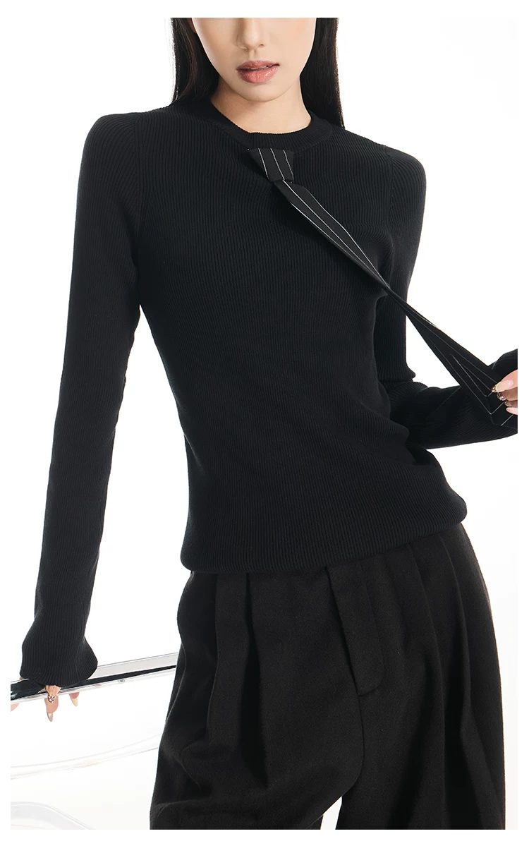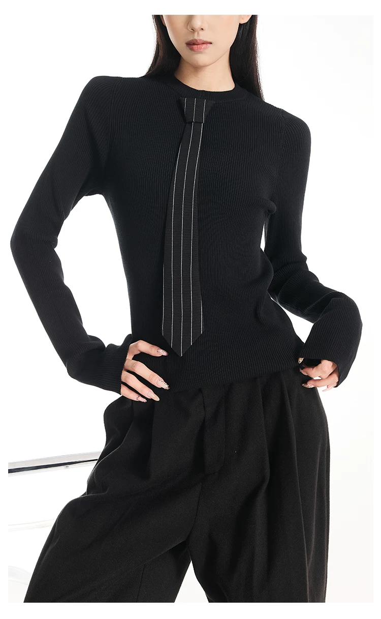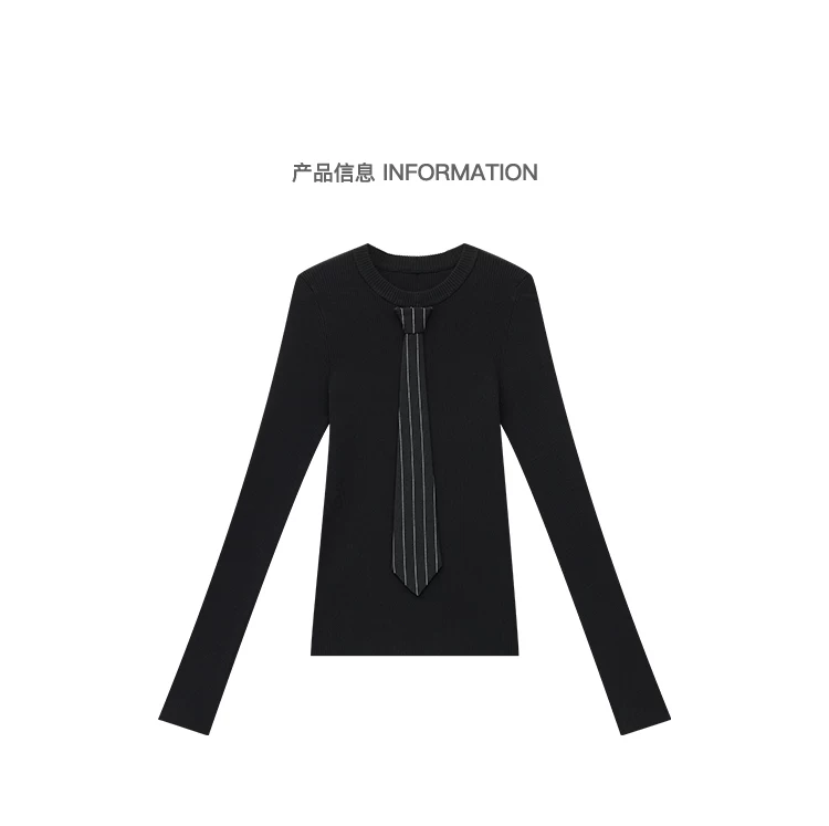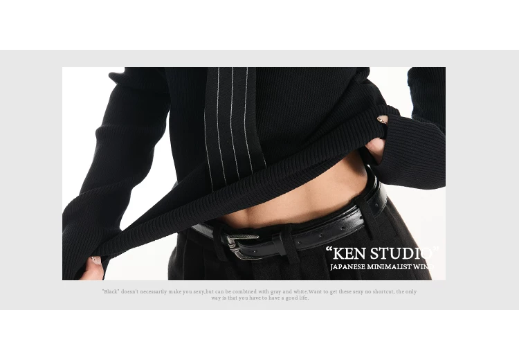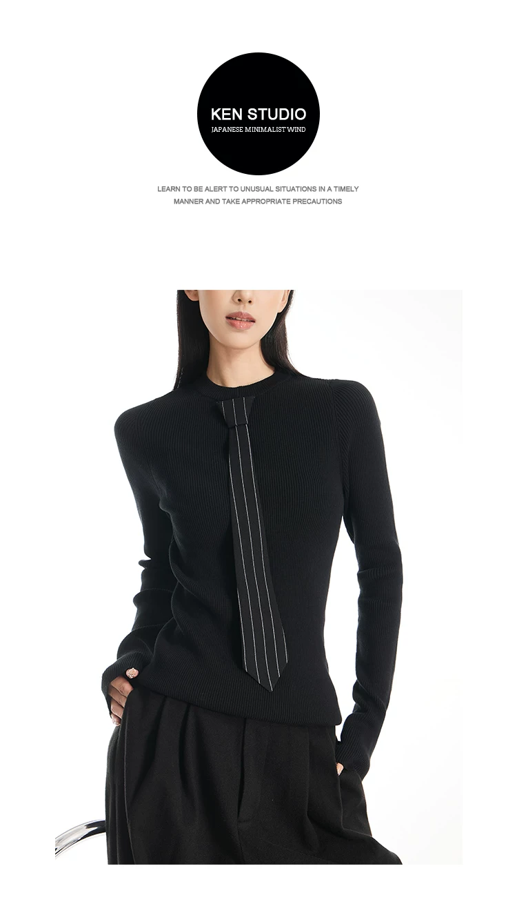 KEN STUDIO Áo len dệt kim dài tay màu đen mùa thu mới dành cho nữ, cổ tròn, ôm vừa vặn, lớp trong
