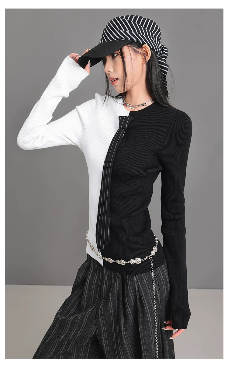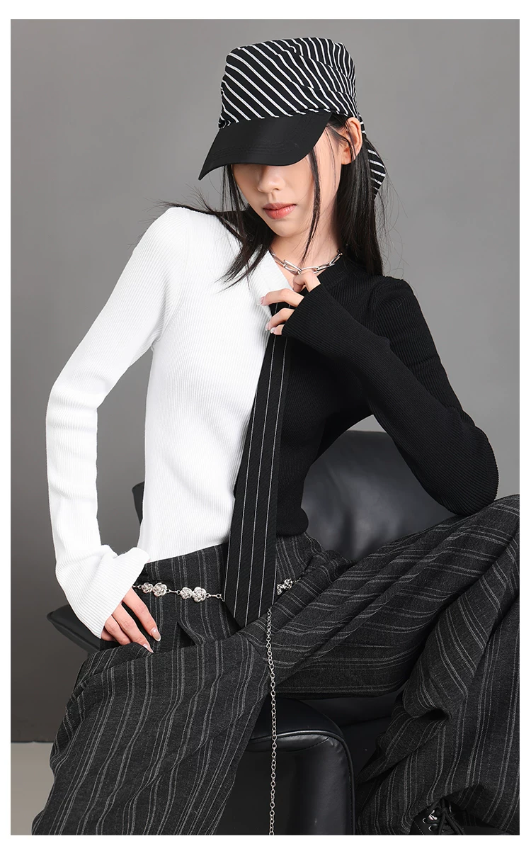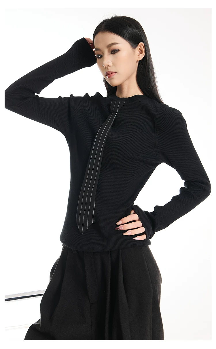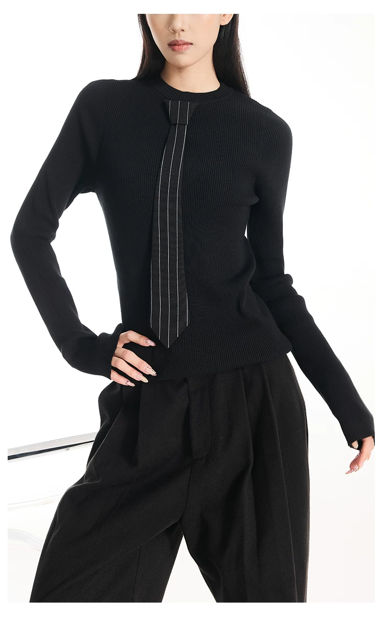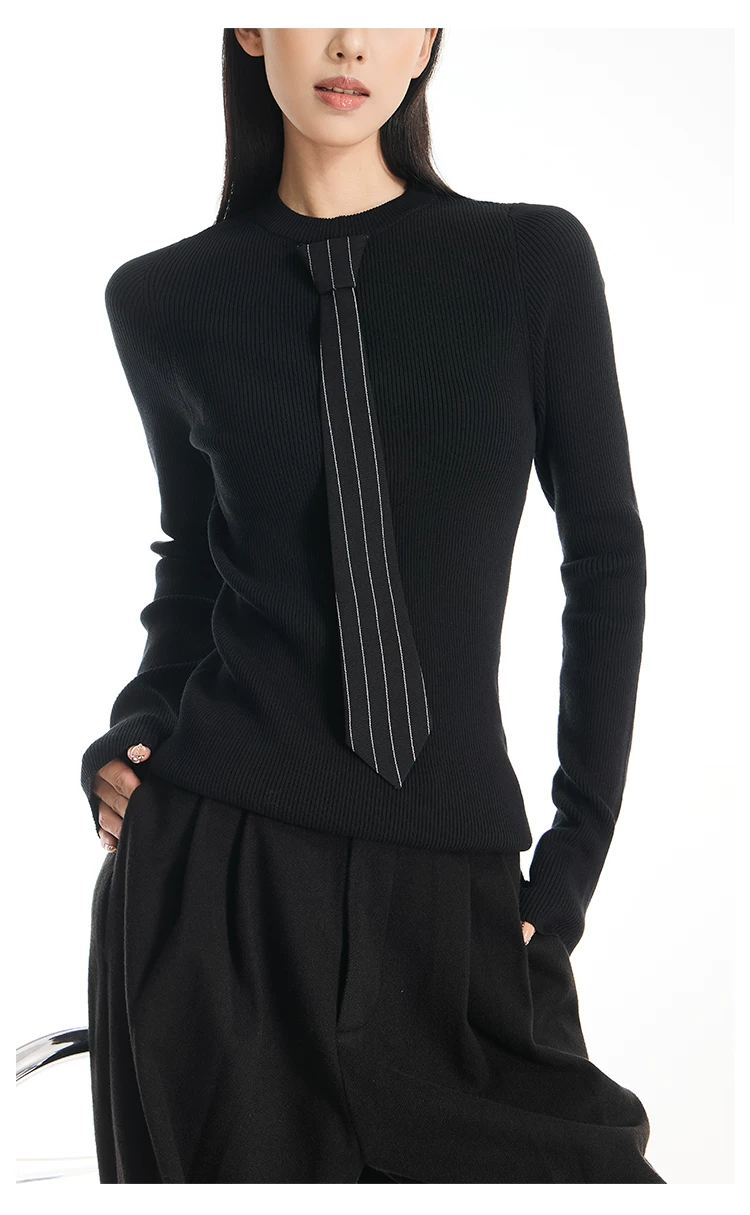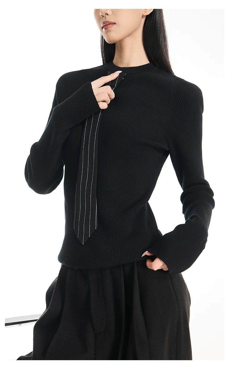 KEN STUDIO Áo len dệt kim dài tay màu đen mùa thu mới dành cho nữ, cổ tròn, ôm vừa vặn, lớp trong