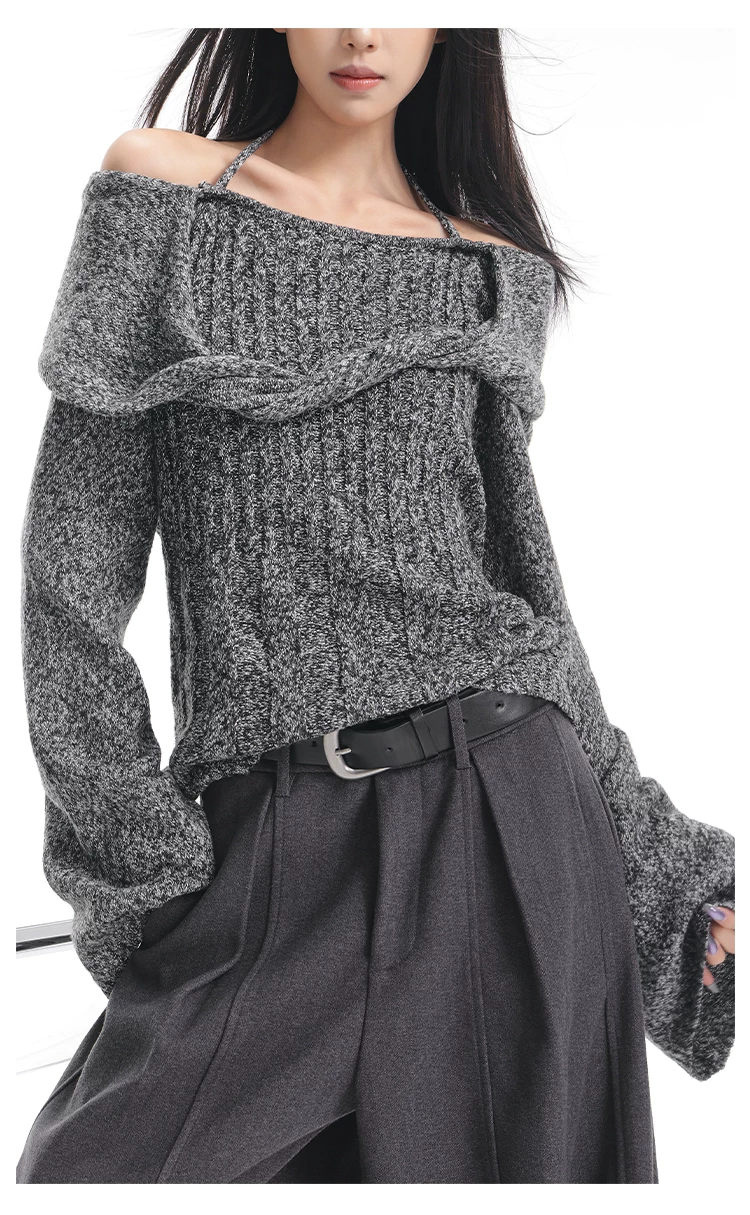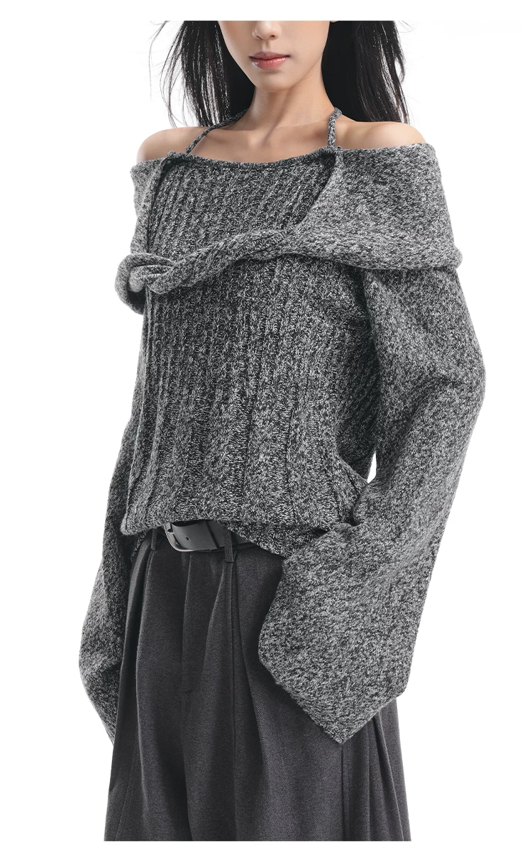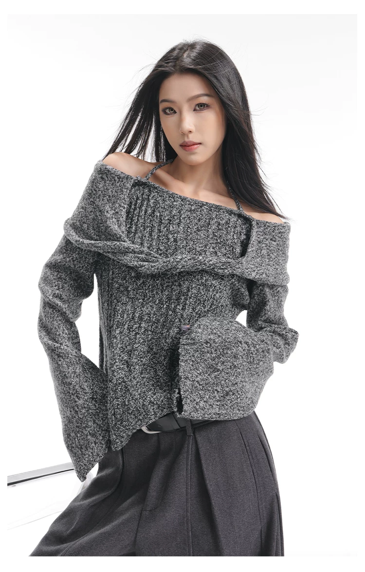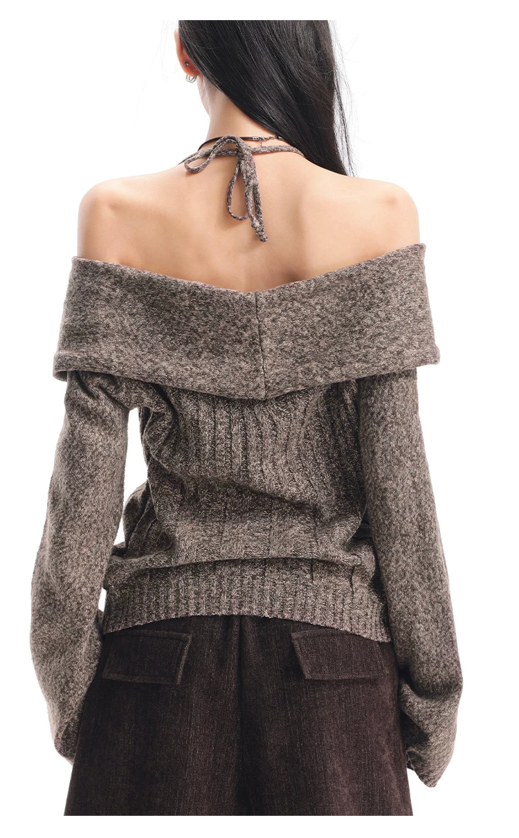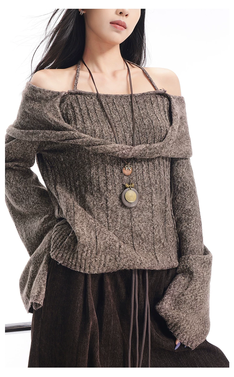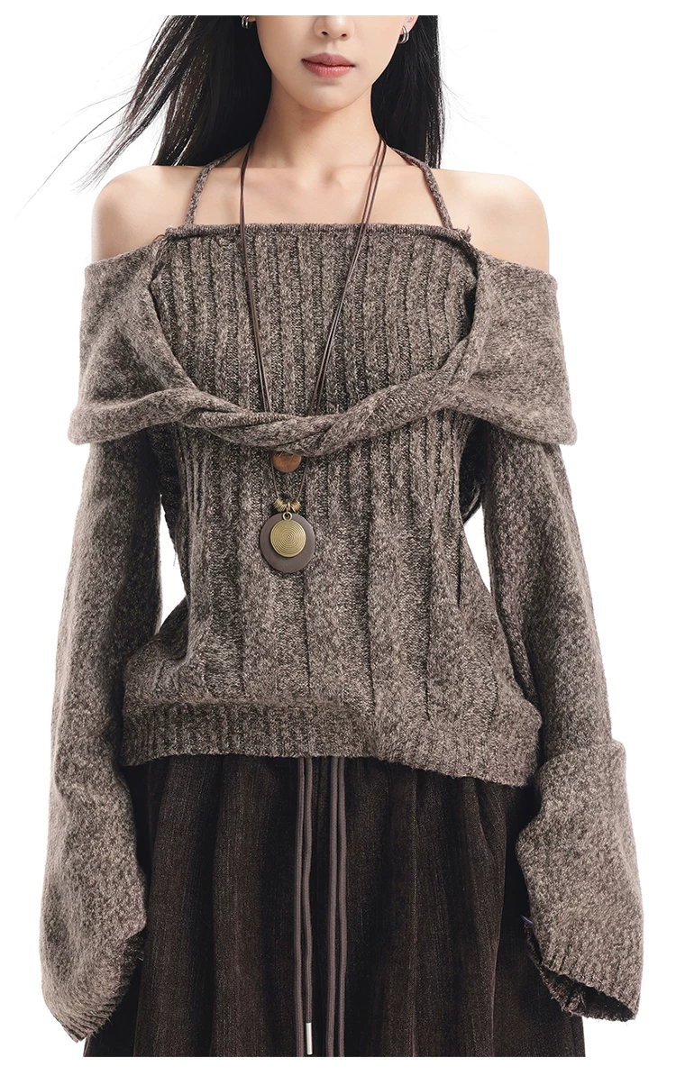 KEN STUDIO Áo len trễ vai màu cà phê thu đông mới dành cho nữ, thiết kế cổ yếm thanh lịch, áo dệt kim dáng rộng và tôn dáng