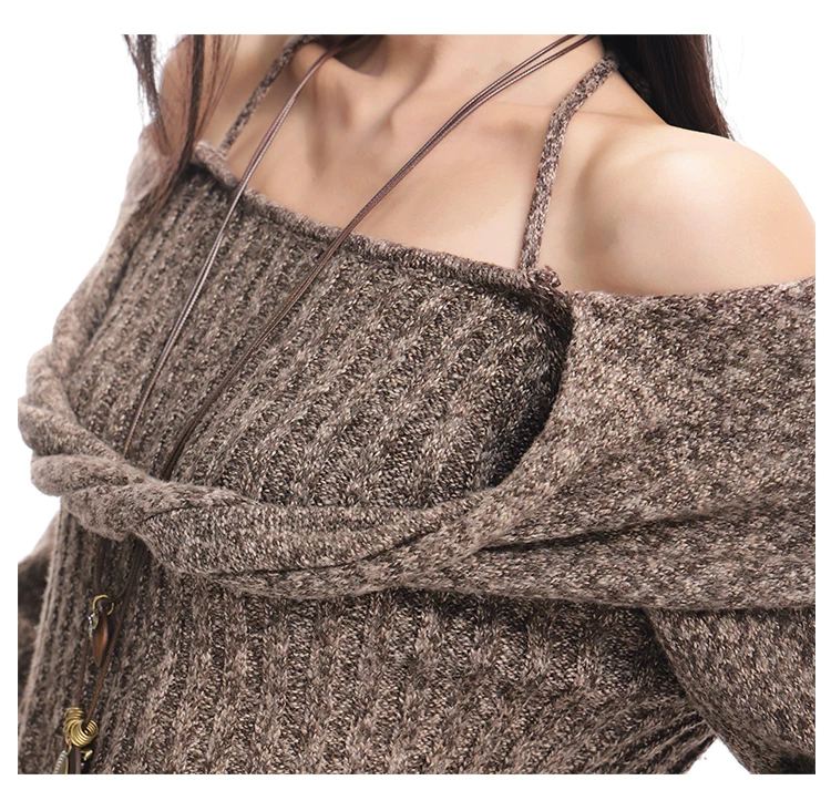 - KEN STUDIO Áo len trễ vai màu cà phê thu đông mới dành cho nữ, thiết kế cổ yếm thanh lịch, áo dệt kim dáng rộng và tôn dáng