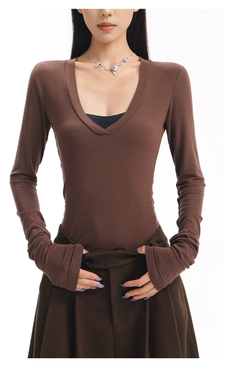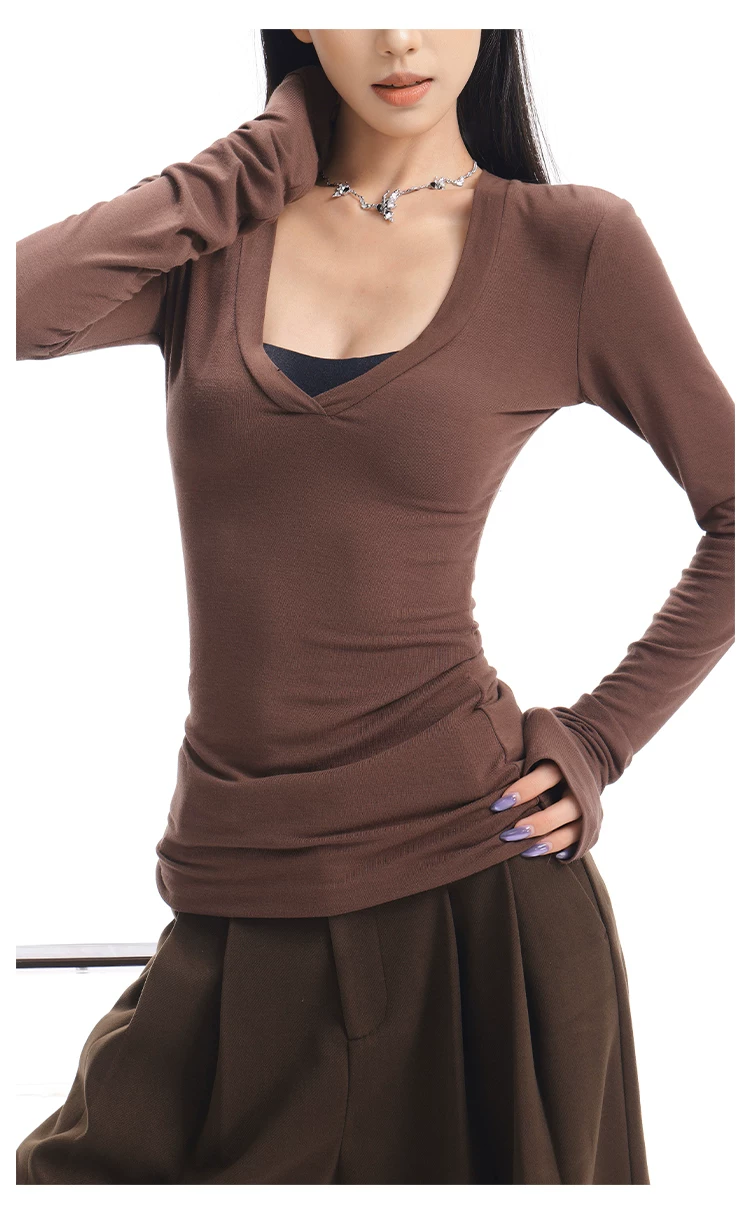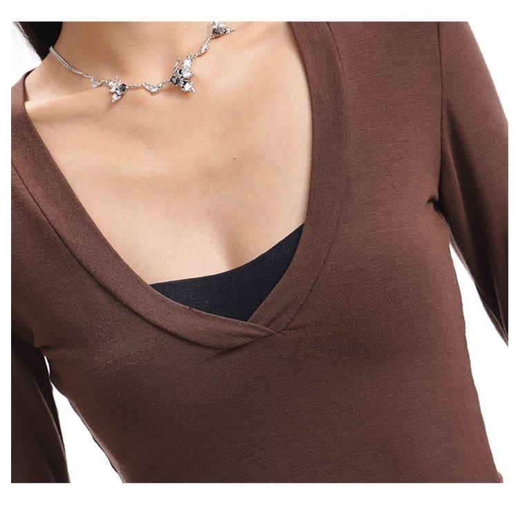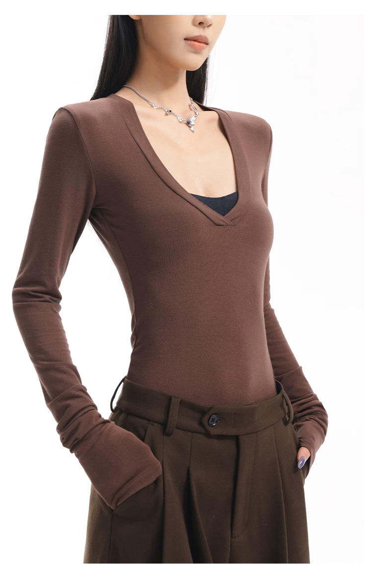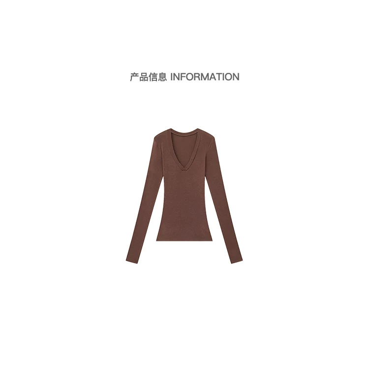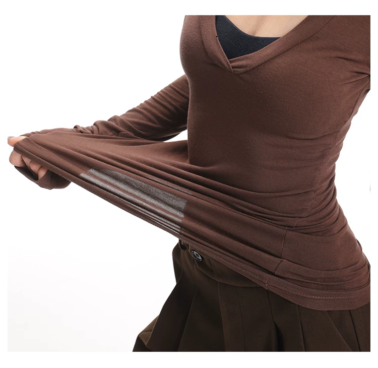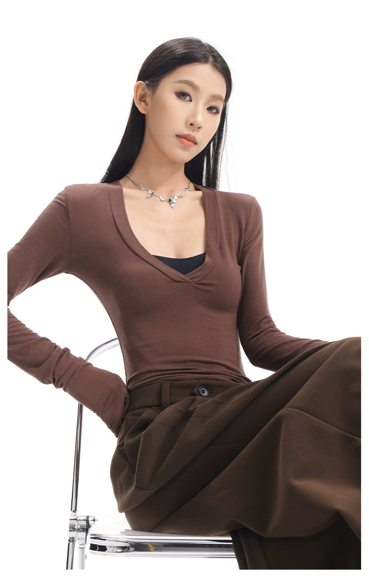 - KEN STUDIO Áo thun dài tay cổ chữ V màu cà phê mới thu đông dành cho nữ, áo sơ mi dáng ôm kiểu Maillard dáng ôm tôn dáng
