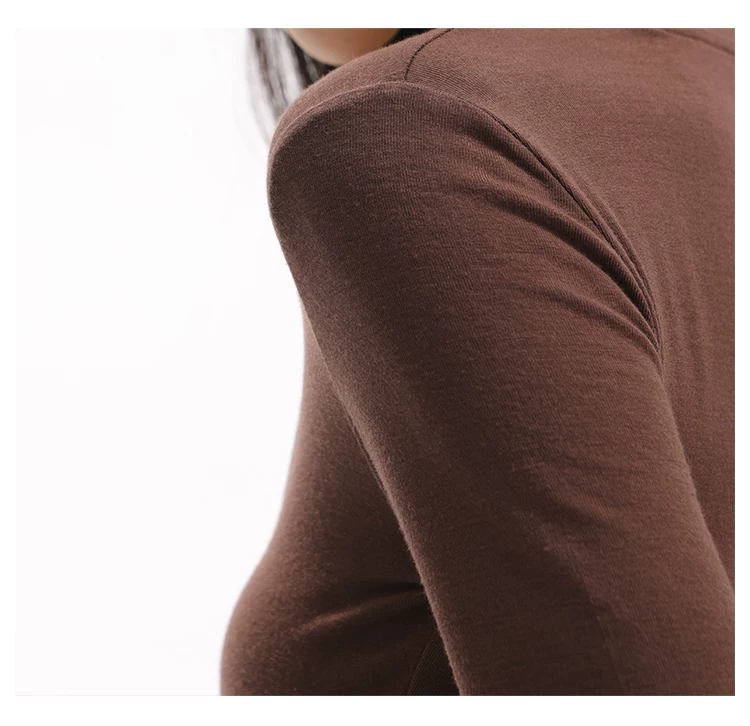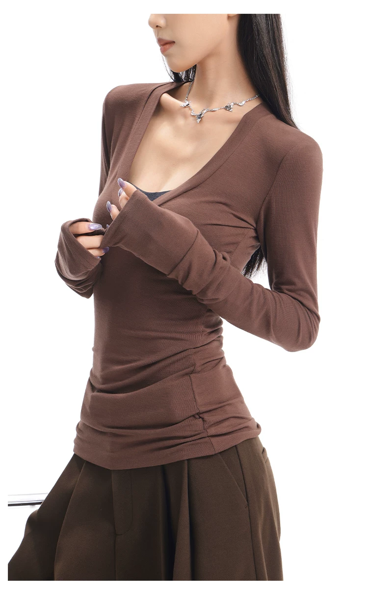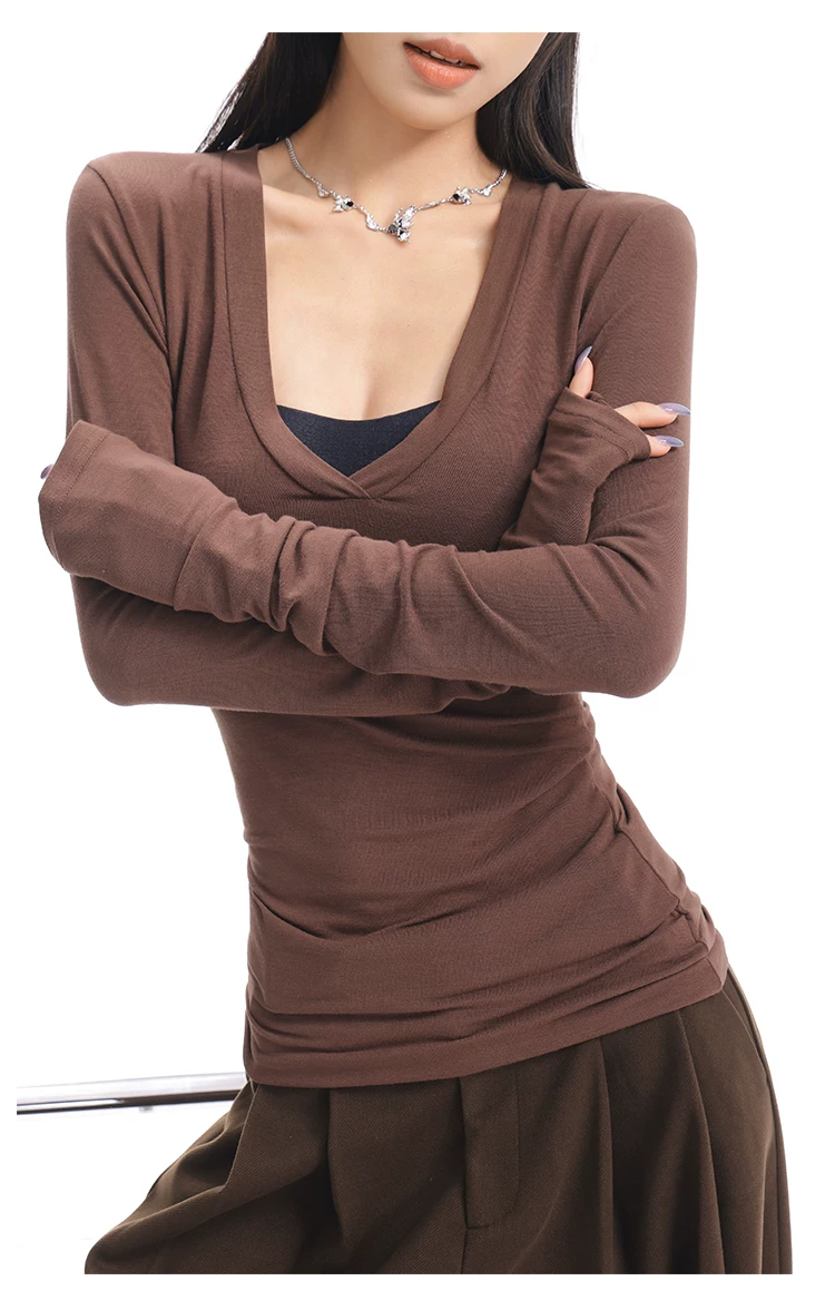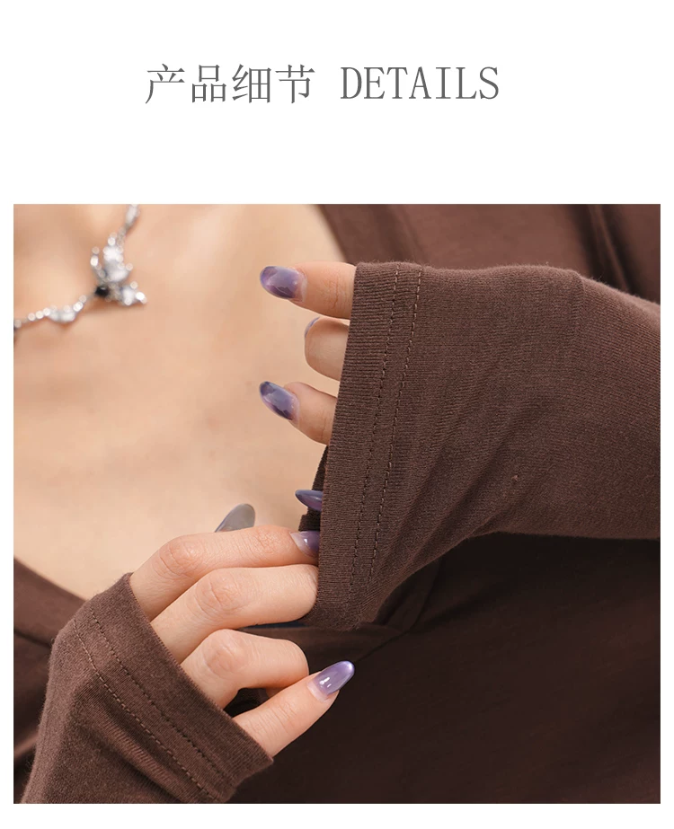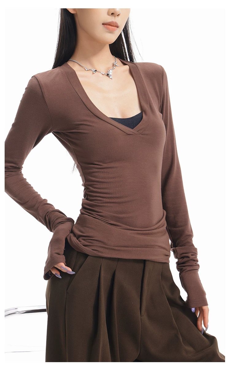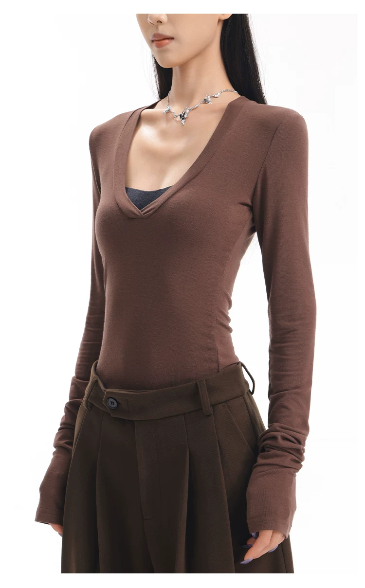 - KEN STUDIO Áo thun dài tay cổ chữ V màu cà phê mới thu đông dành cho nữ, áo sơ mi dáng ôm kiểu Maillard dáng ôm tôn dáng
