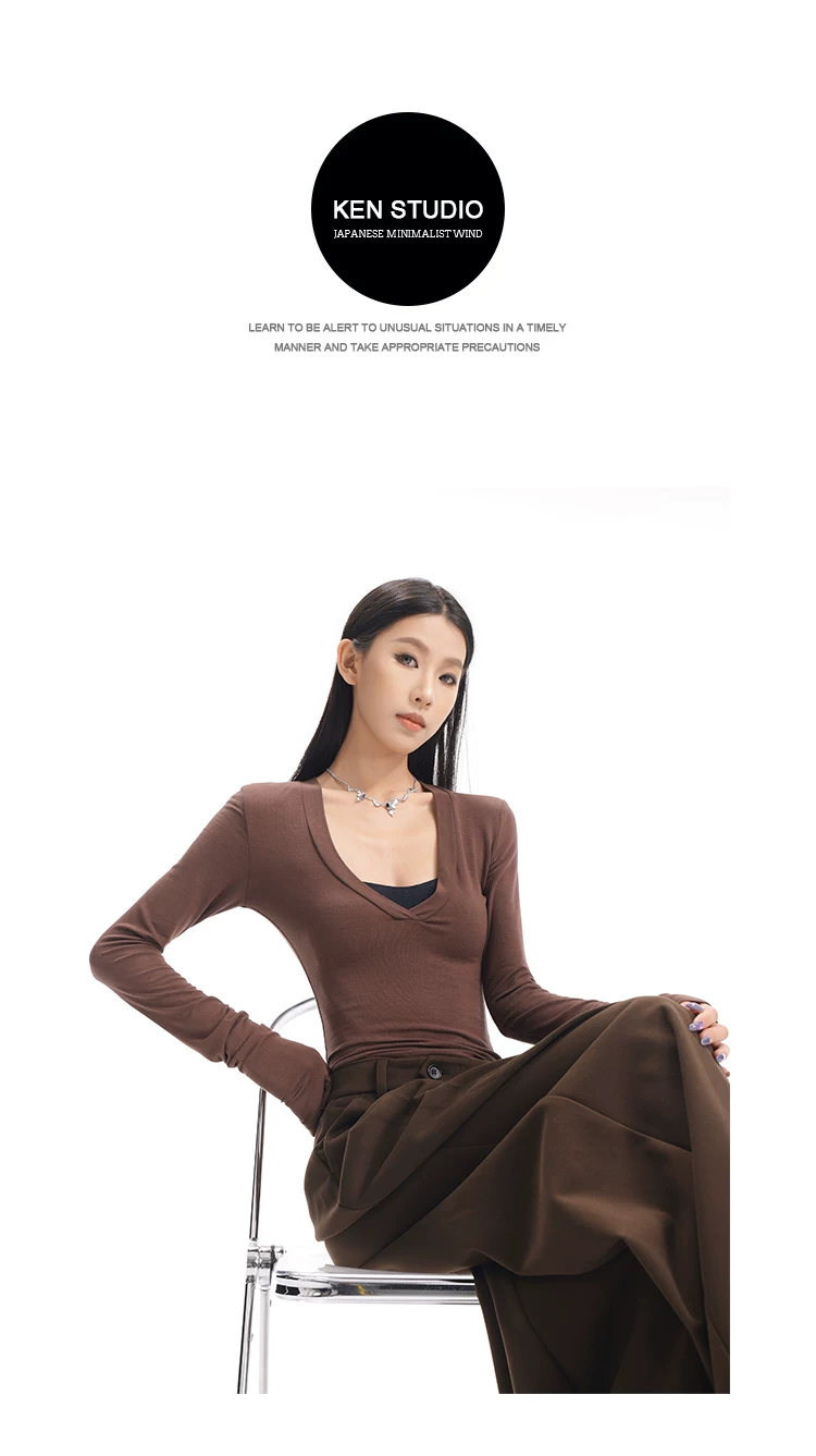 KEN STUDIO Áo thun dài tay cổ chữ V màu cà phê mới thu đông dành cho nữ, áo sơ mi dáng ôm kiểu Maillard dáng ôm tôn dáng