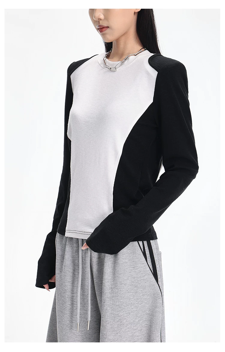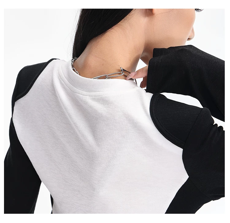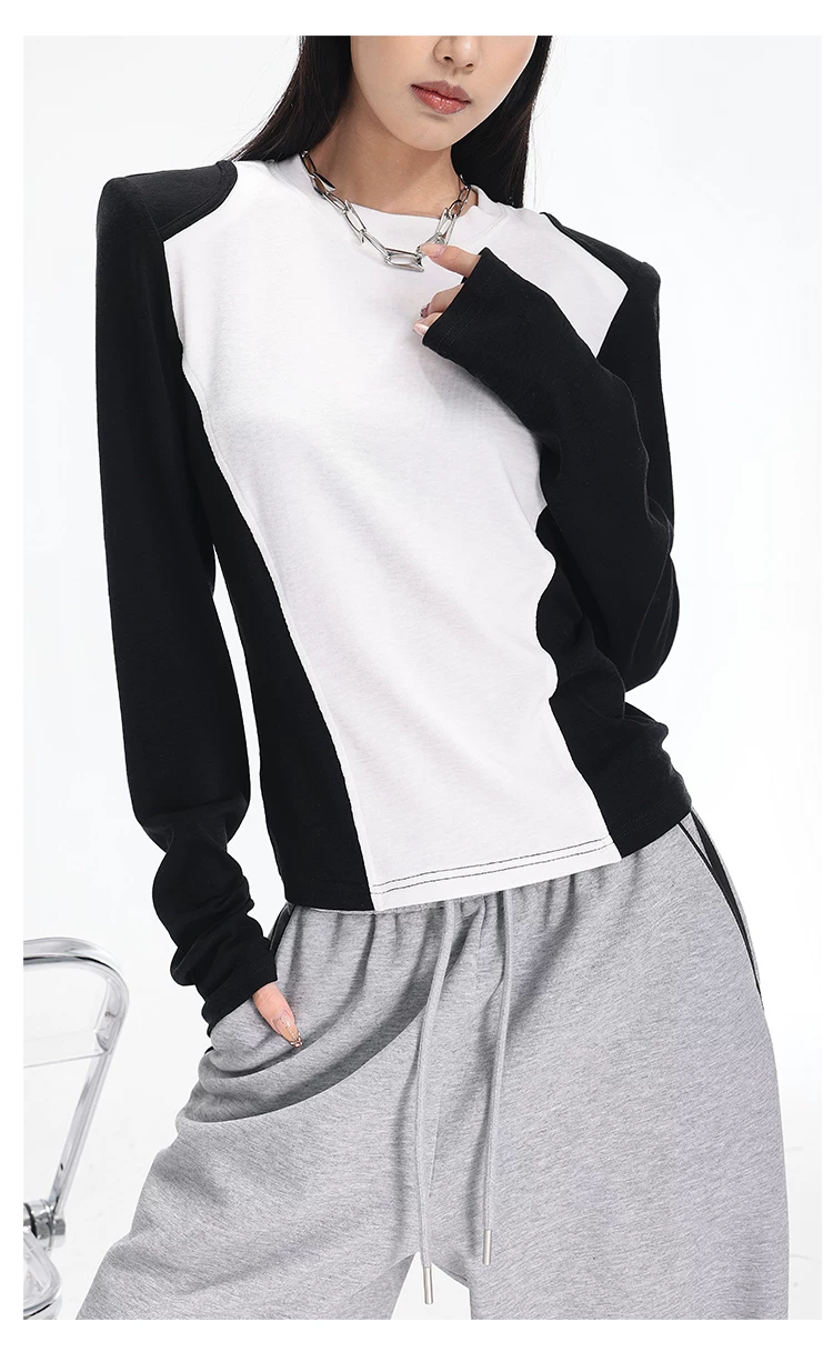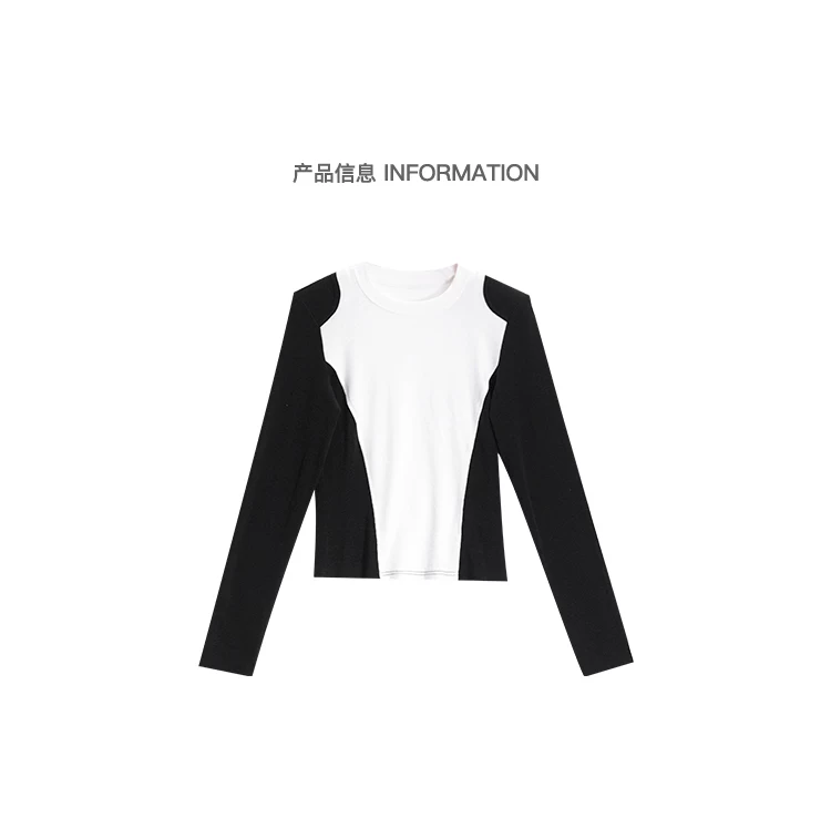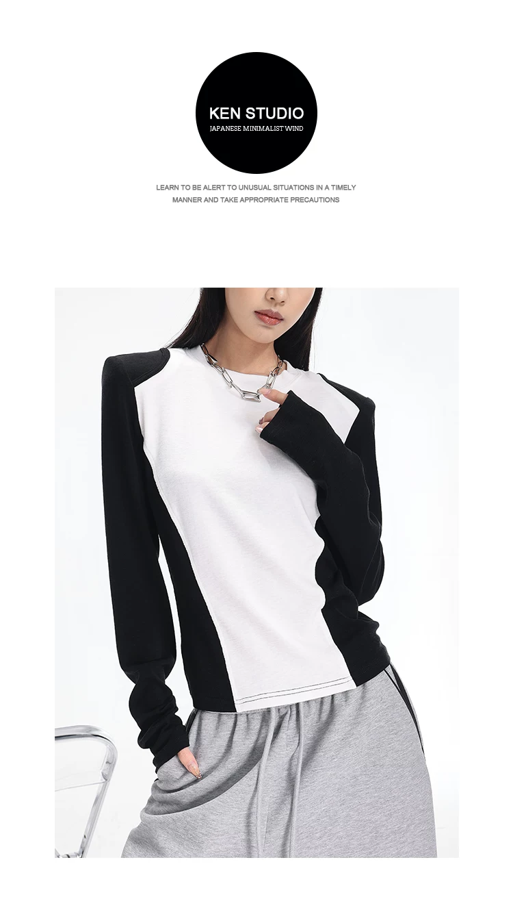 - KEN STUDIO Áo thun dài tay cổ tròn phối màu thu đông mới dành cho nữ, dáng ôm, áo sơ mi cơ bản đa năng