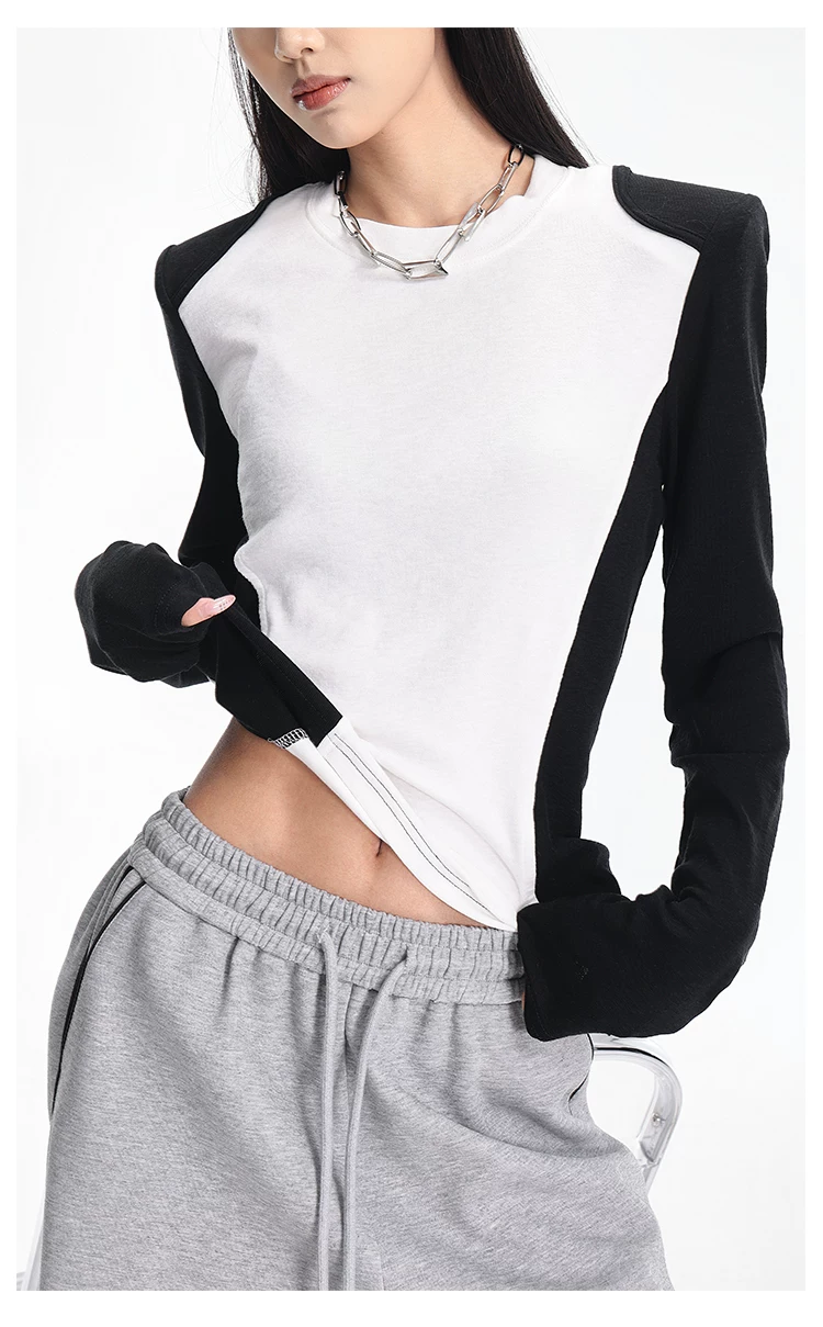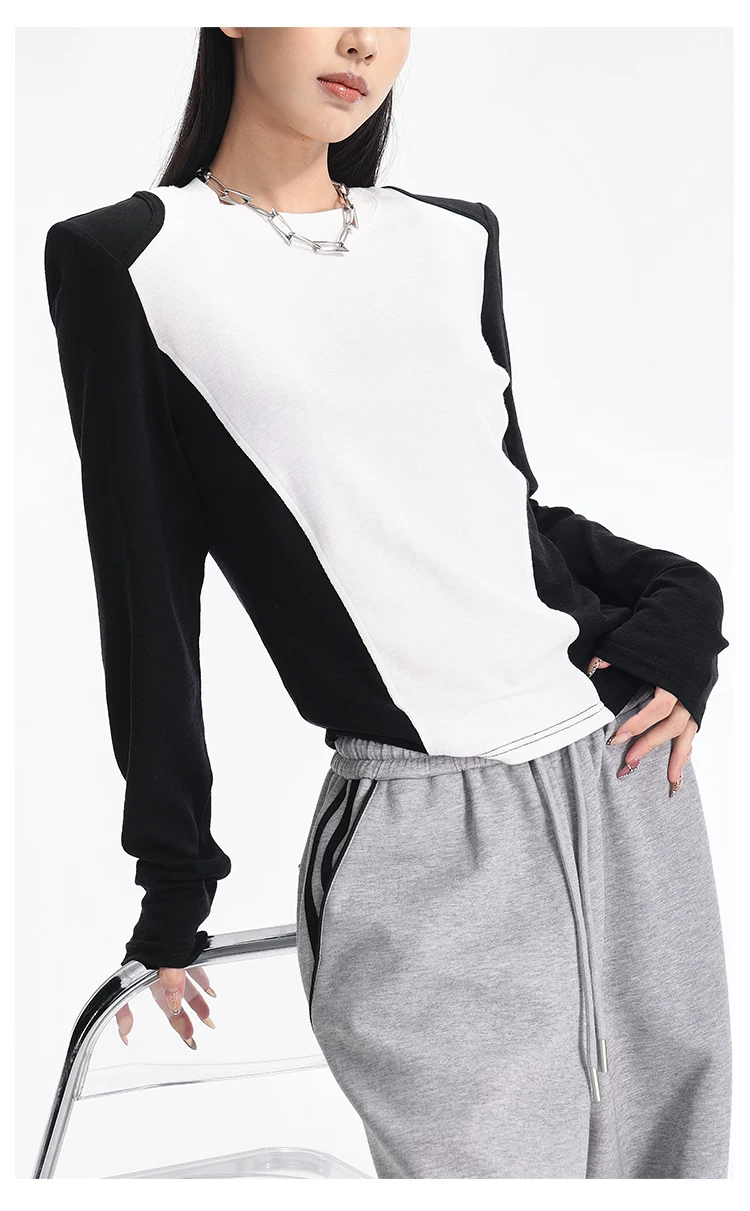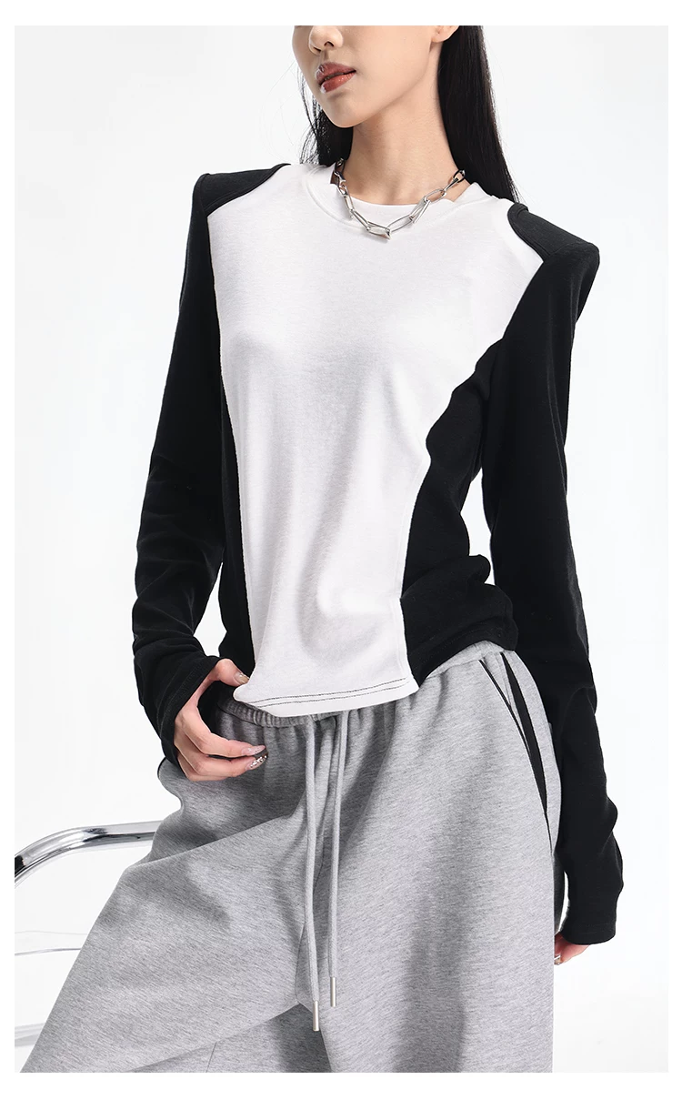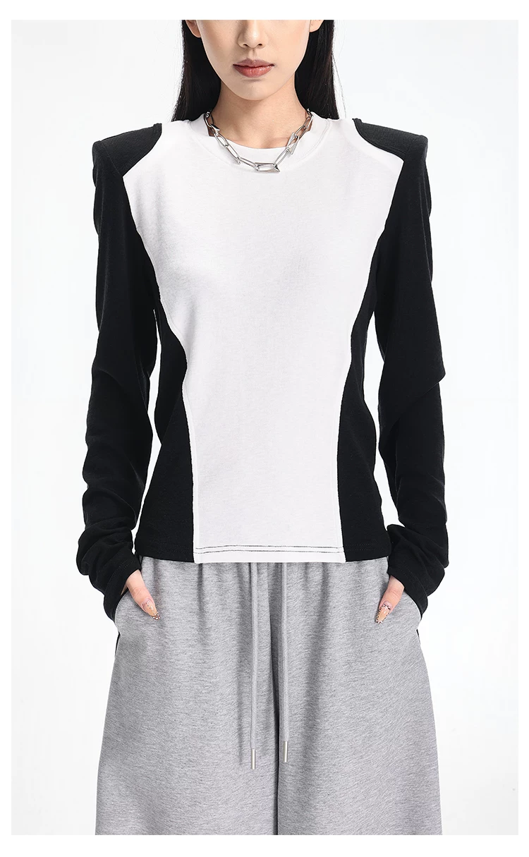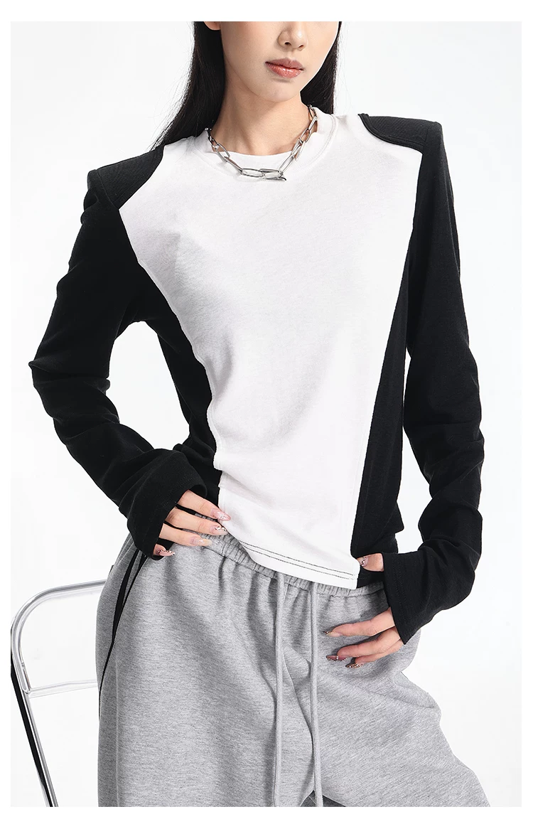 - KEN STUDIO Áo thun dài tay cổ tròn phối màu thu đông mới dành cho nữ, dáng ôm, áo sơ mi cơ bản đa năng