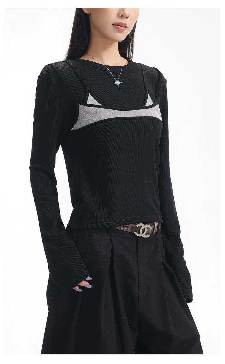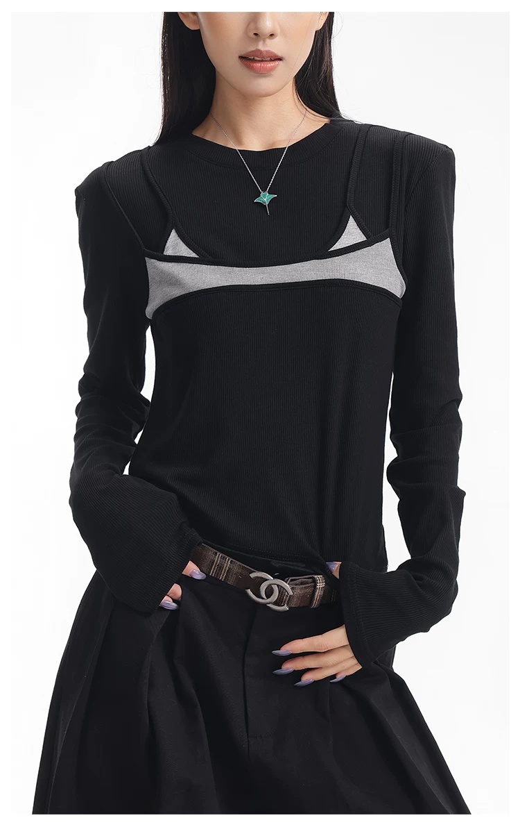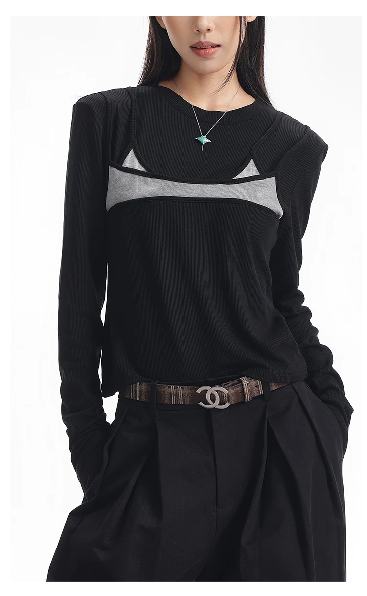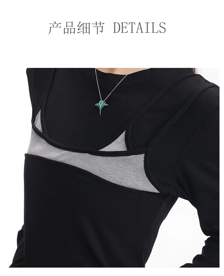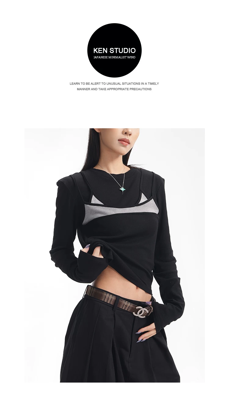- KEN STUDIO Áo thun dài tay dệt kim màu đen mới mùa thu đông dành cho nữ với thiết kế giả hai mảnh và áo ôm vừa vặn
