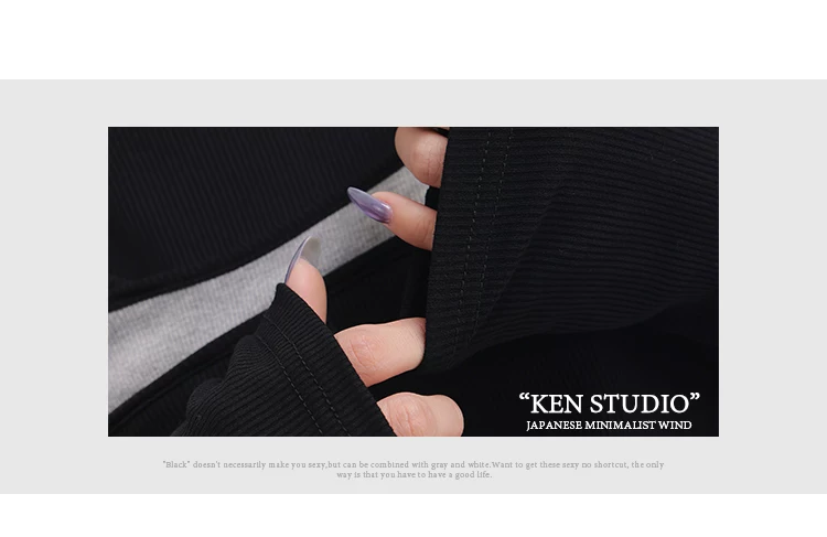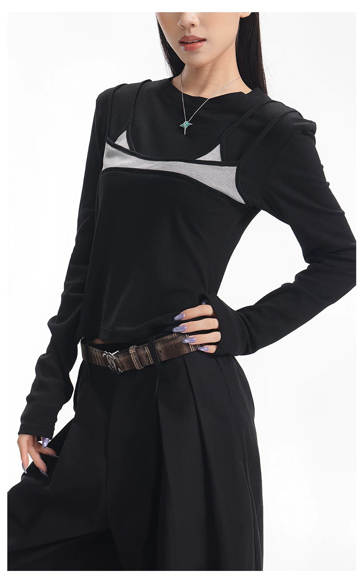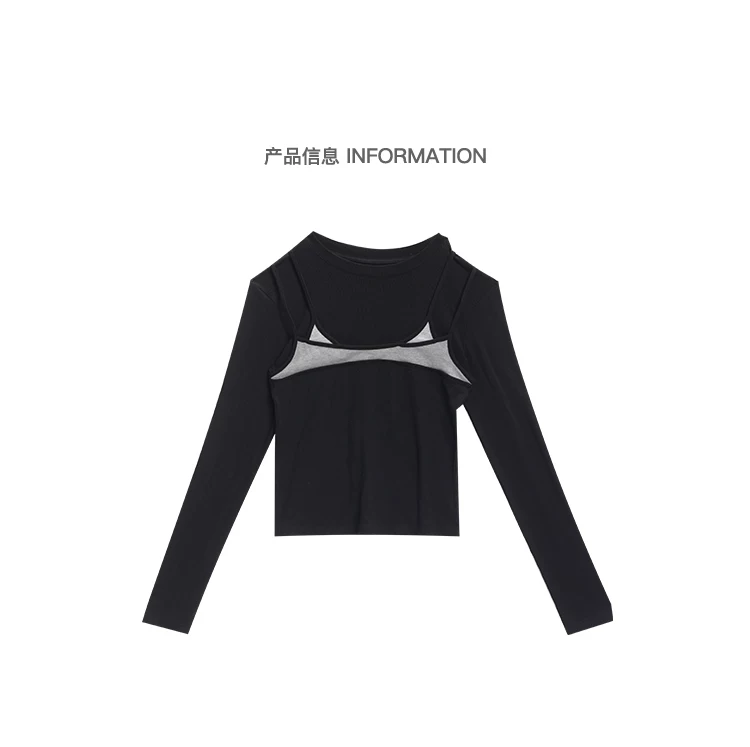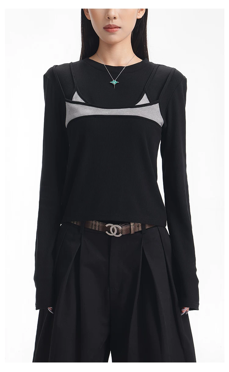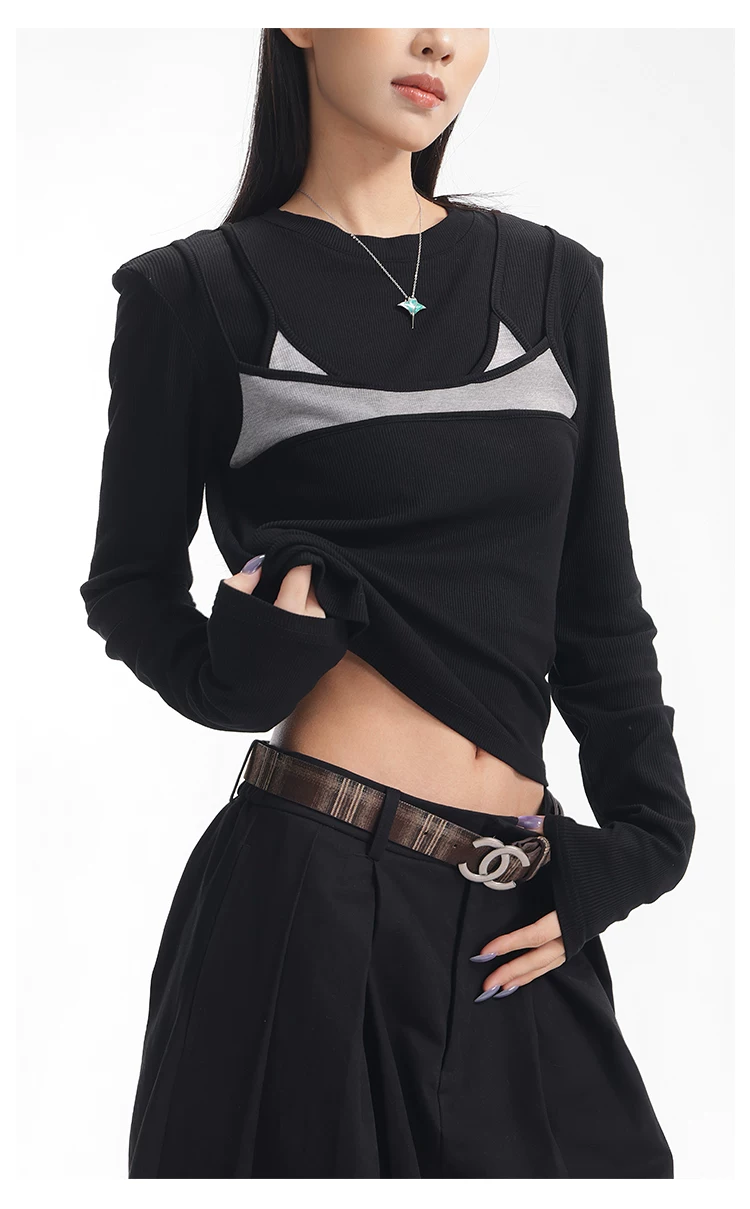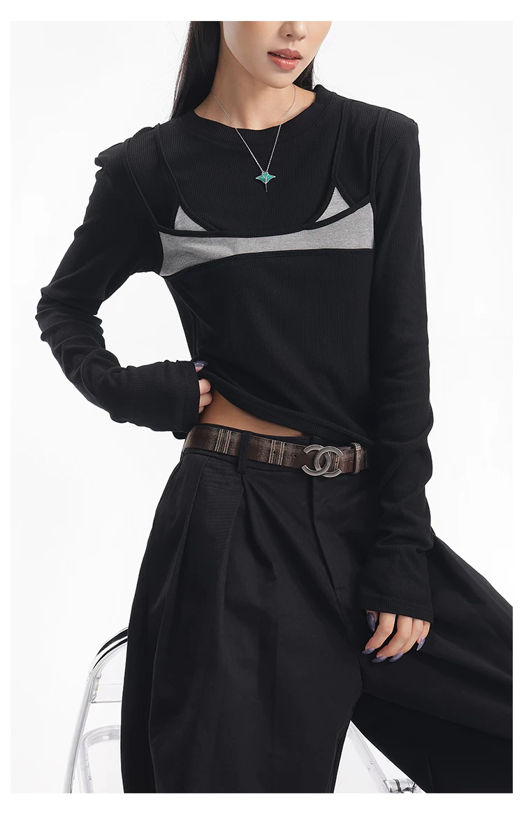 - KEN STUDIO Áo thun dài tay dệt kim màu đen mới mùa thu đông dành cho nữ với thiết kế giả hai mảnh và áo ôm vừa vặn