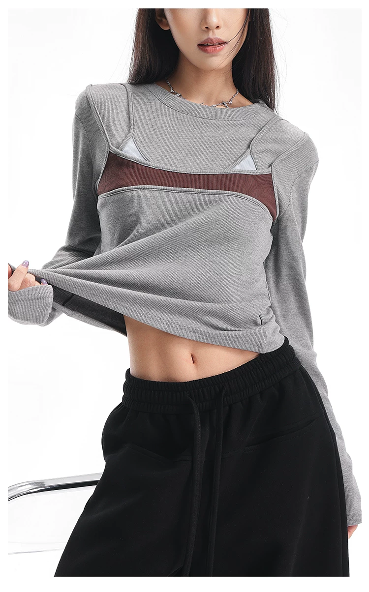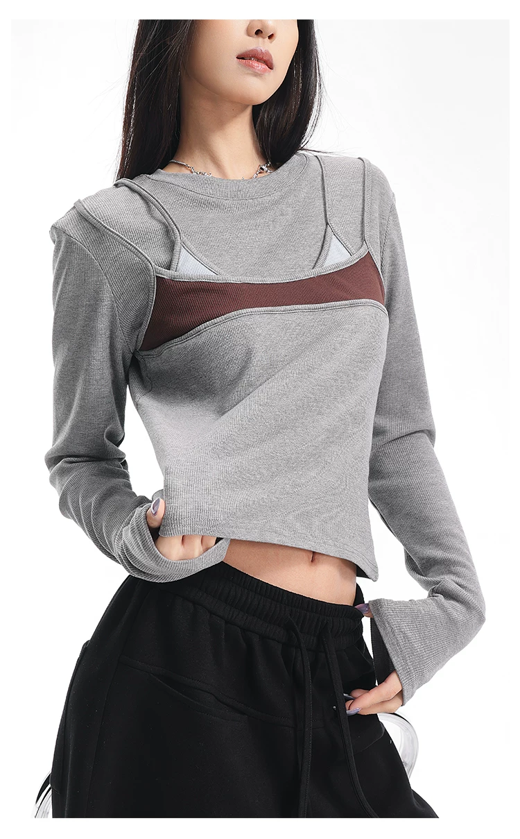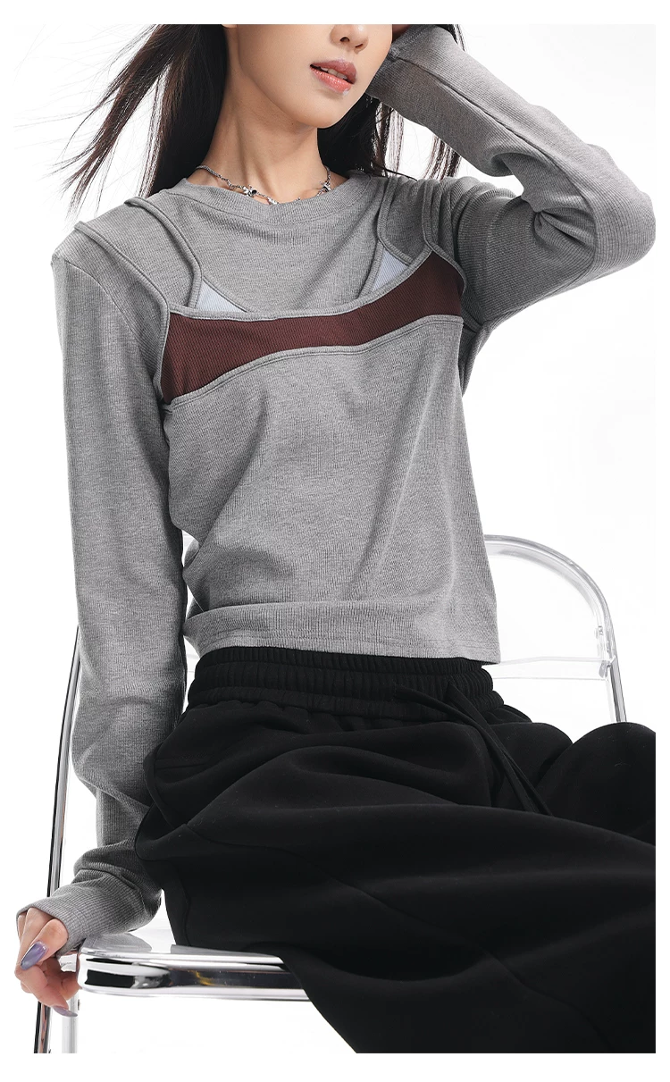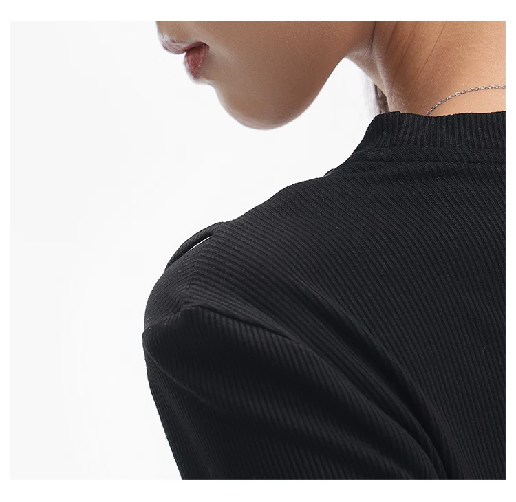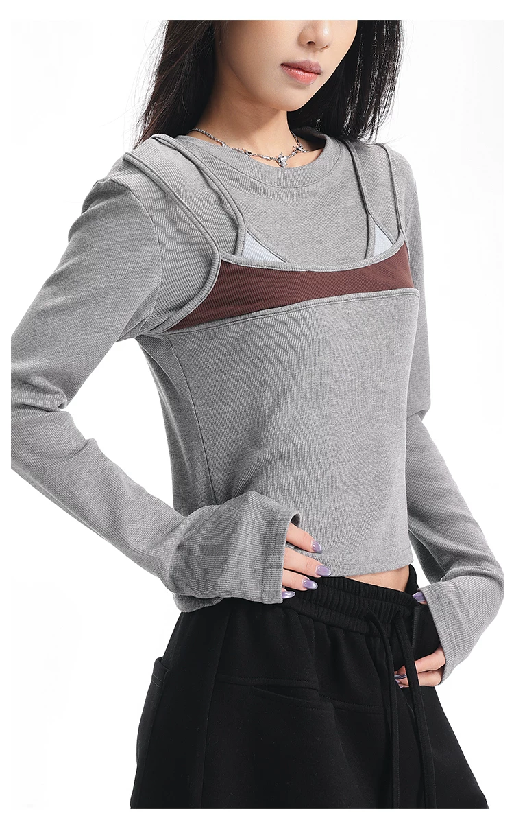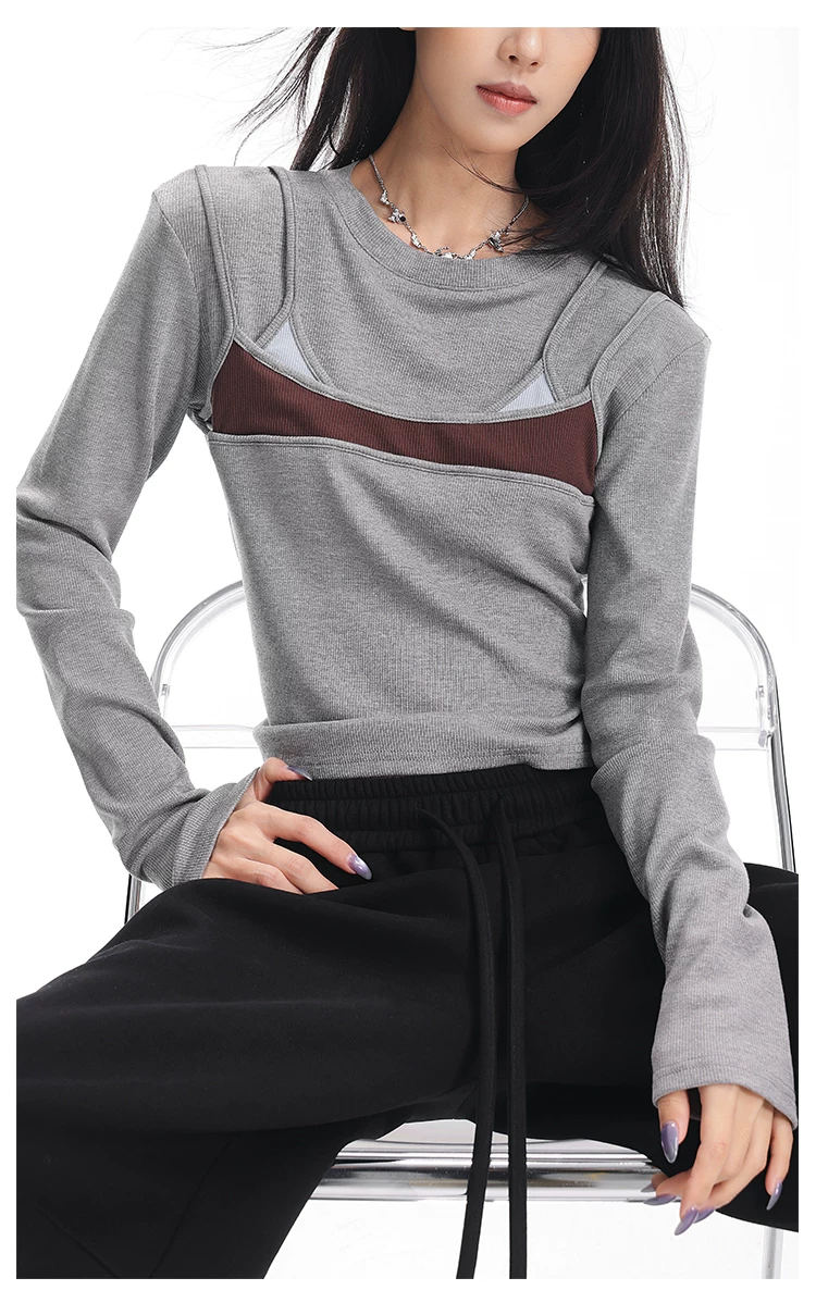 - KEN STUDIO Áo thun dài tay dệt kim màu đen mới mùa thu đông dành cho nữ với thiết kế giả hai mảnh và áo ôm vừa vặn