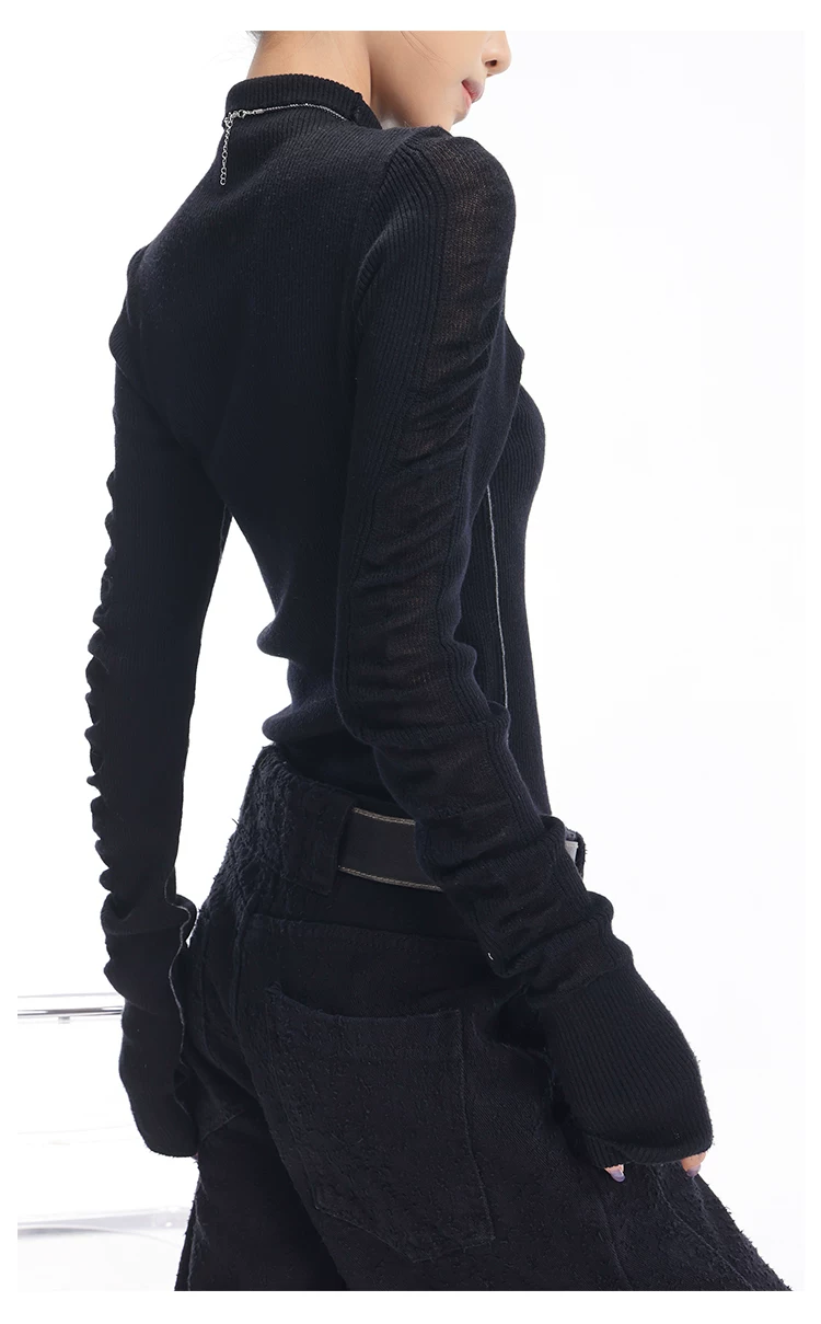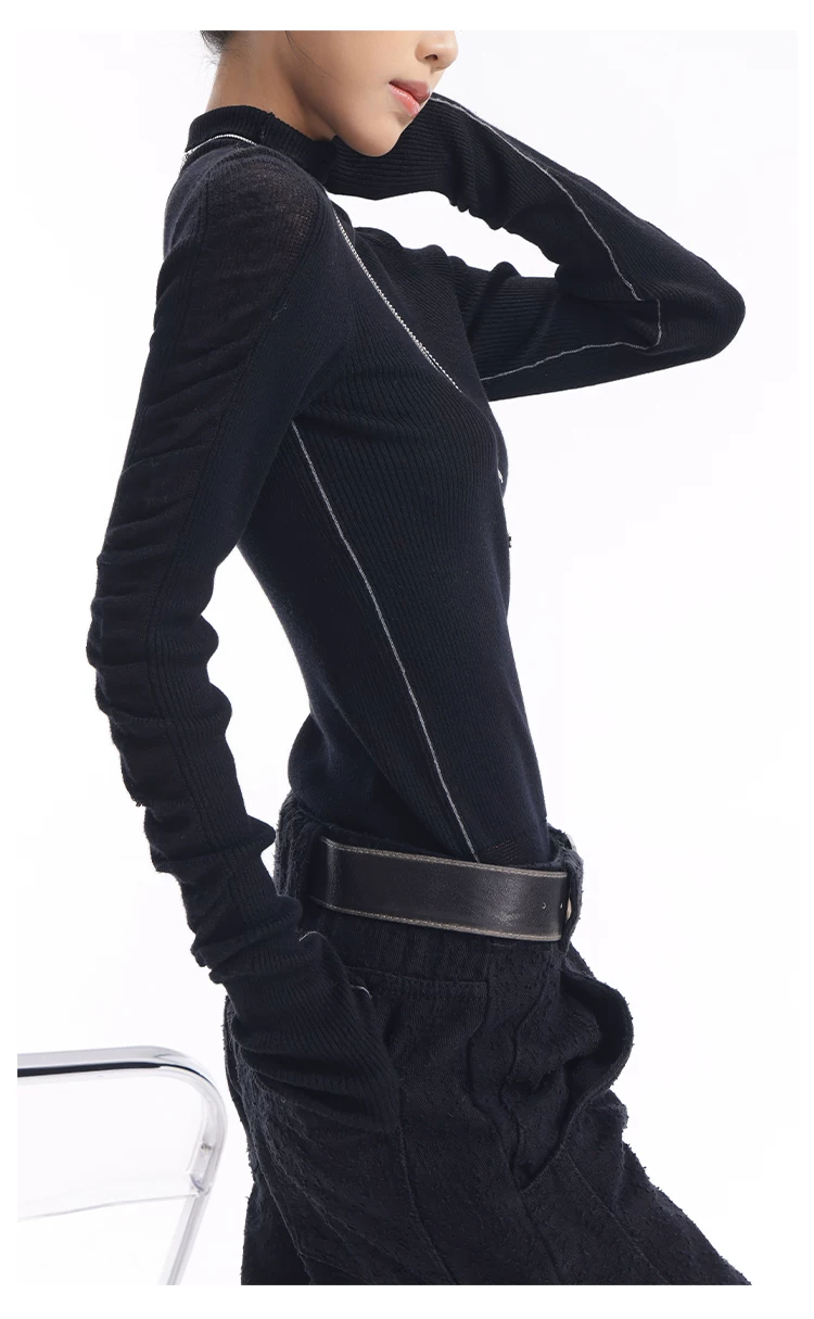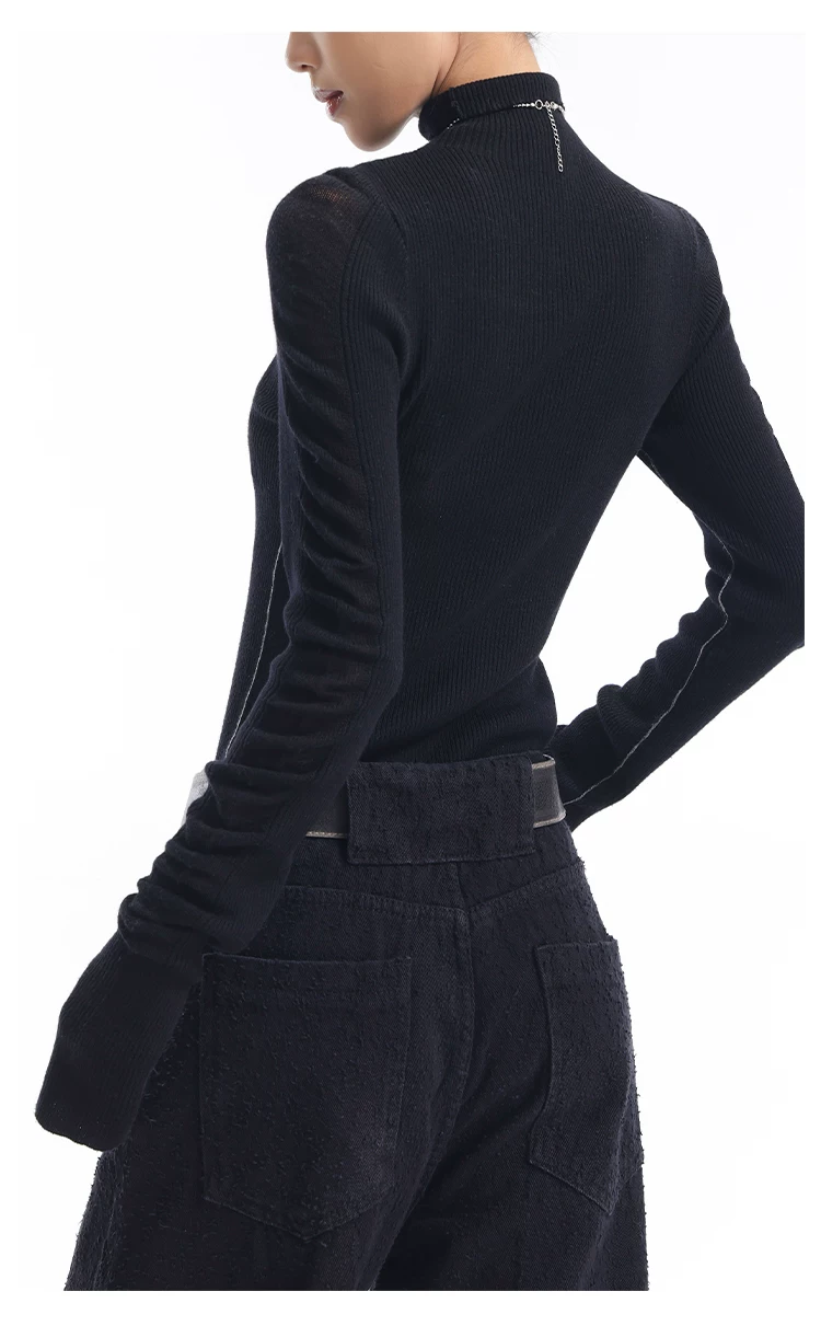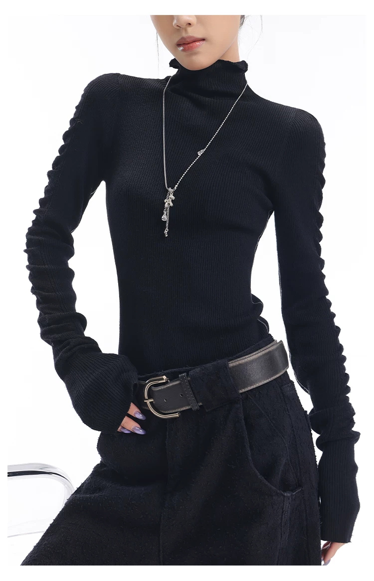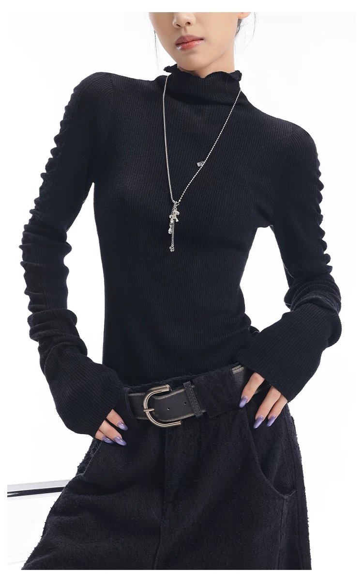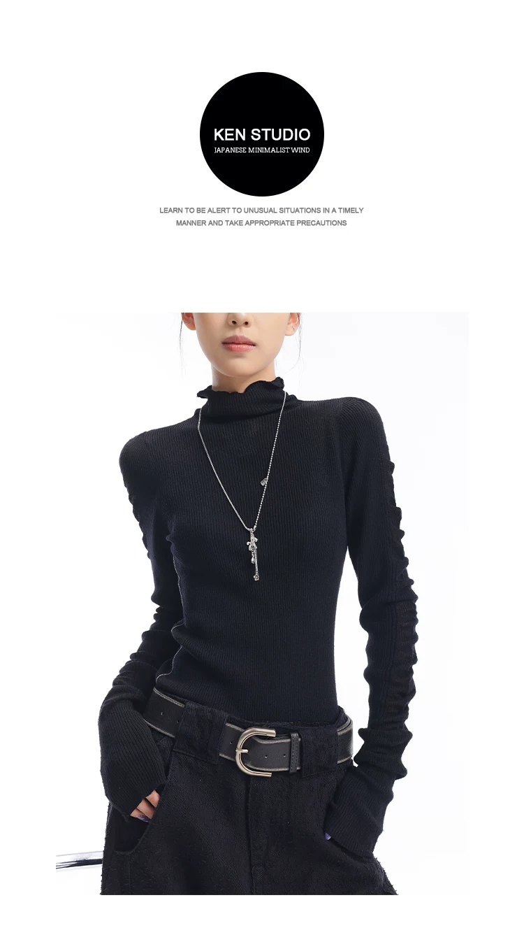 KEN STUDIO Áo thun dài tay màu đen mới thu đông của KEN STUDIO Áo thun dệt kim cổ cao ôm sát bên trong dành cho nữ