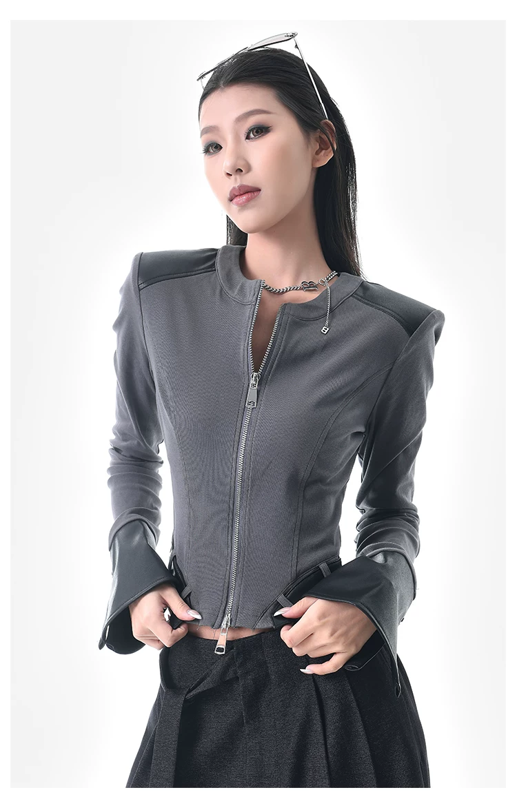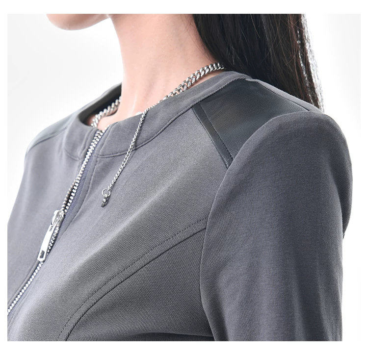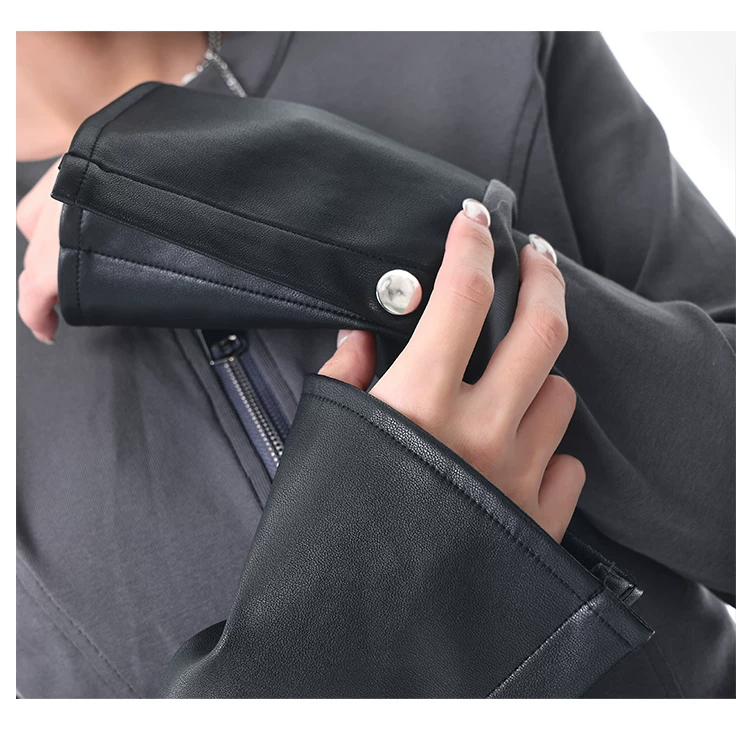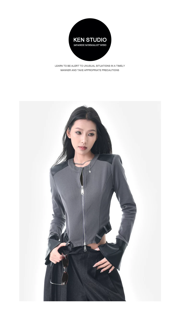 - KEN STUDIO Áo thun dài tay phối da PU mùa thu mới dành cho nữ với thiết kế khóa kéo đôi và áo ngắn ôm vừa vặn