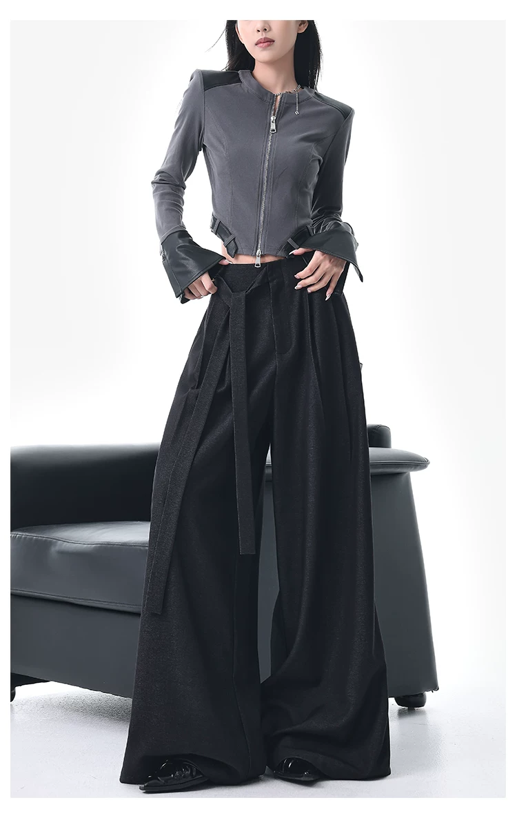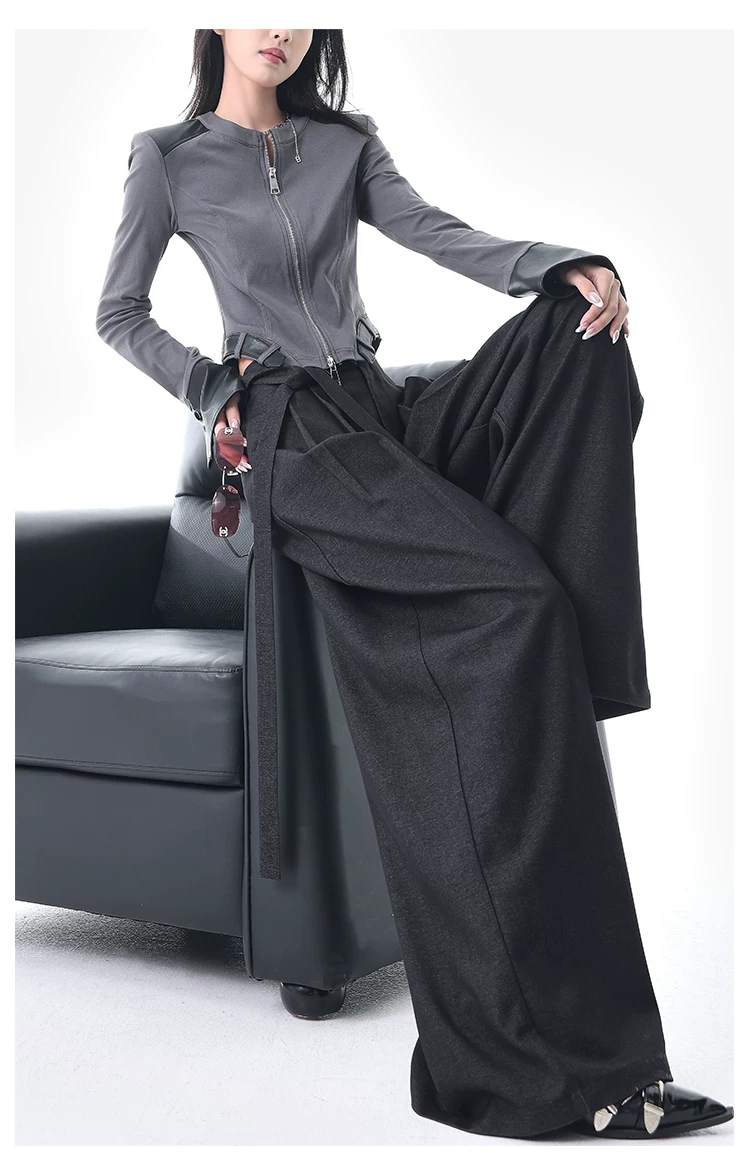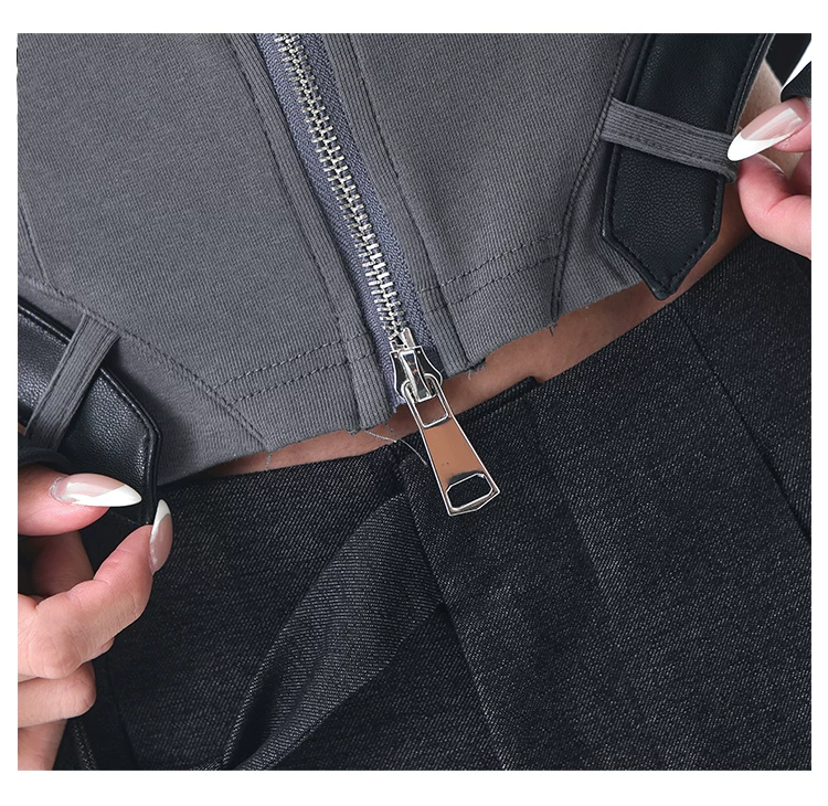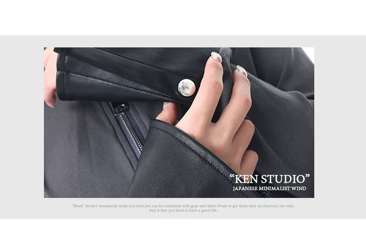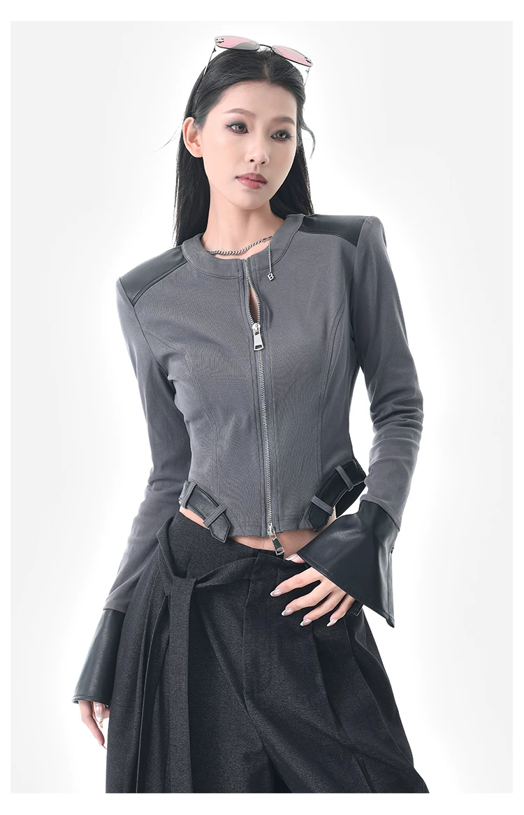 - KEN STUDIO Áo thun dài tay phối da PU mùa thu mới dành cho nữ với thiết kế khóa kéo đôi và áo ngắn ôm vừa vặn