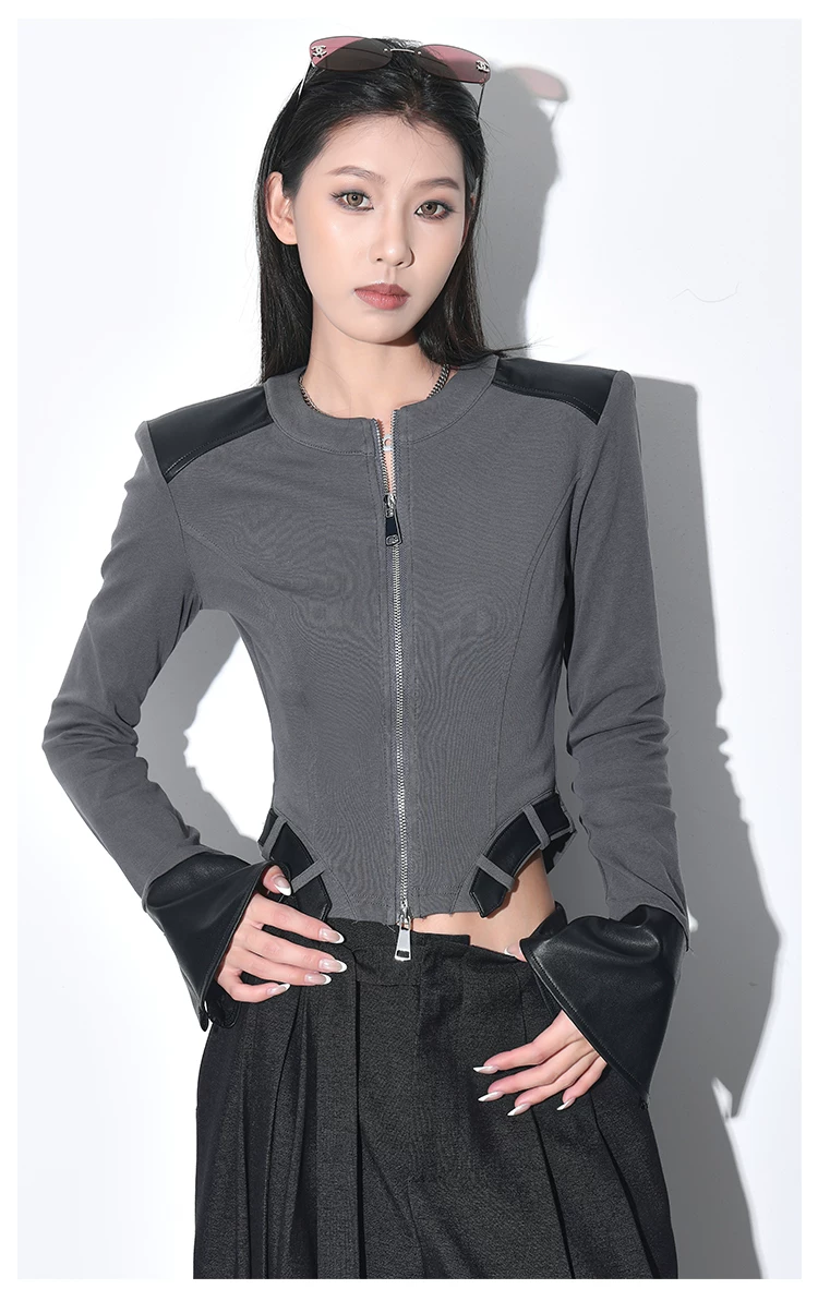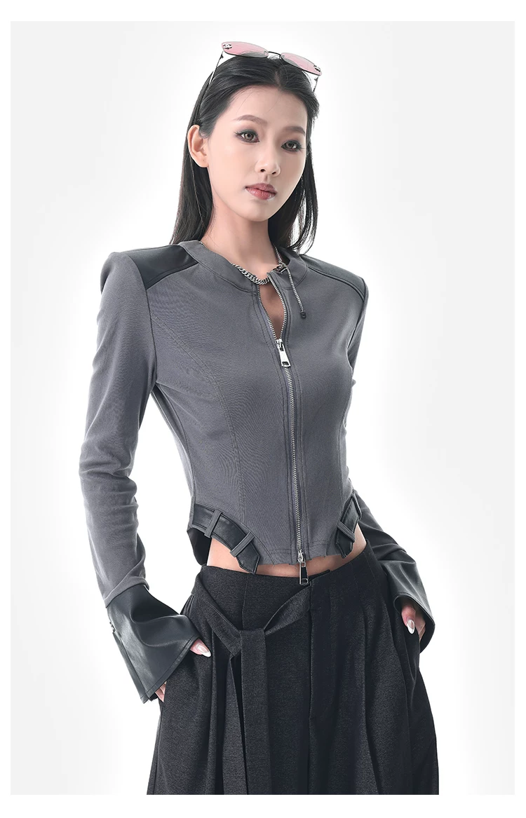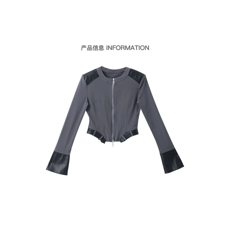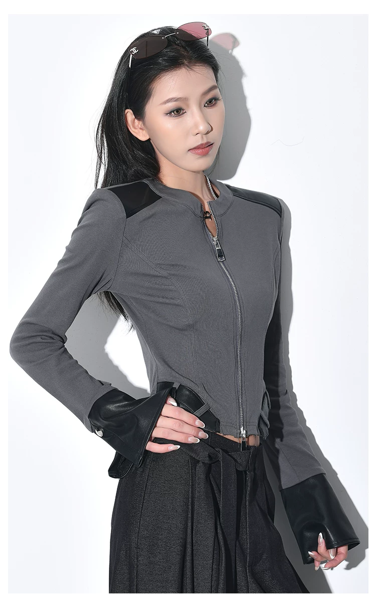 KEN STUDIO Áo thun dài tay phối da PU mùa thu mới dành cho nữ với thiết kế khóa kéo đôi và áo ngắn ôm vừa vặn