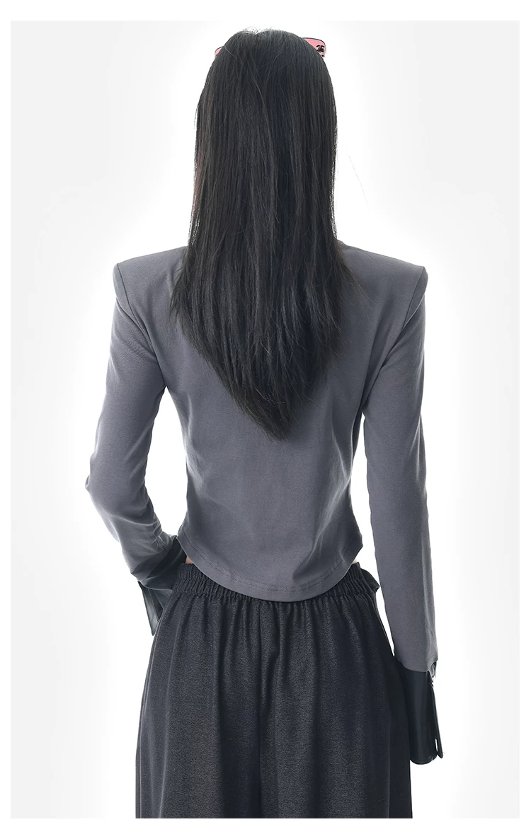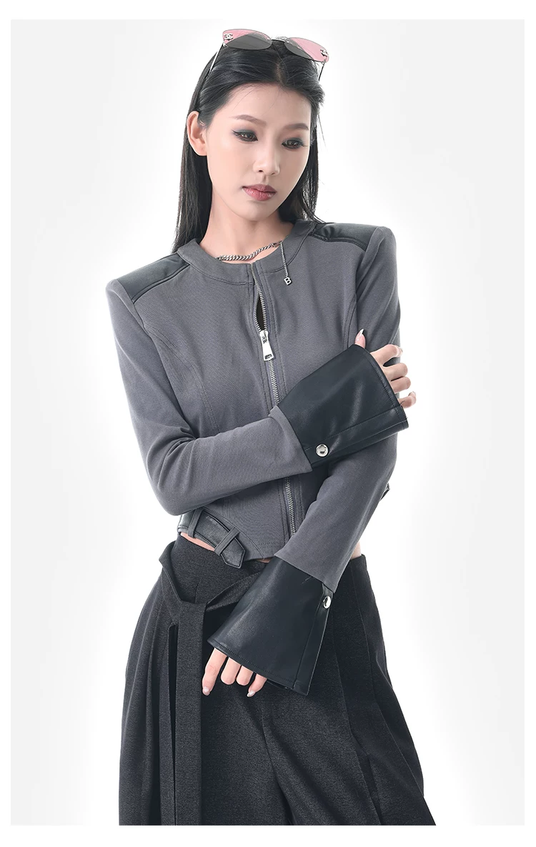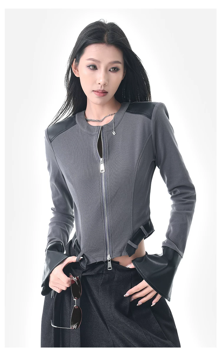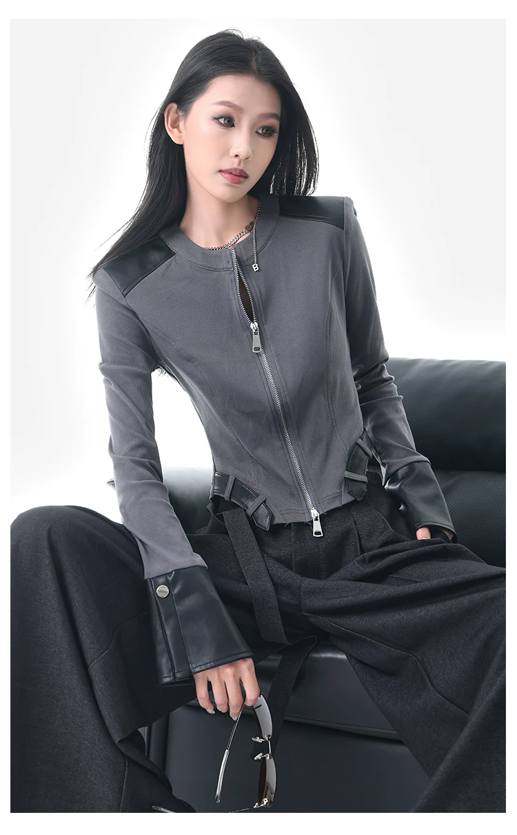 KEN STUDIO Áo thun dài tay phối da PU mùa thu mới dành cho nữ với thiết kế khóa kéo đôi và áo ngắn ôm vừa vặn