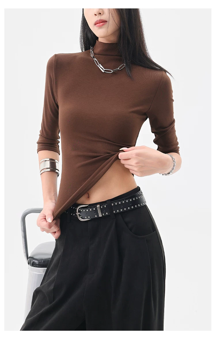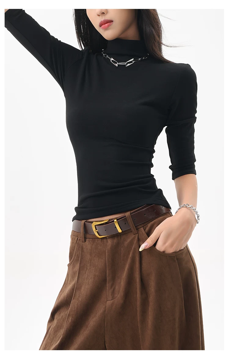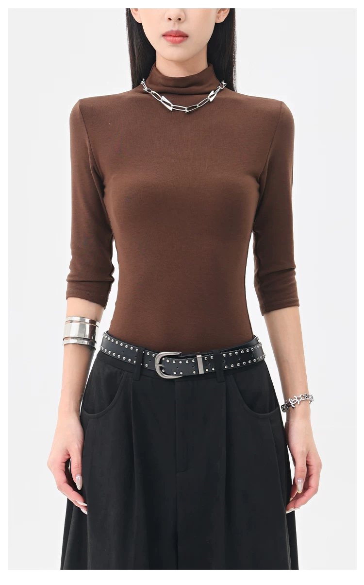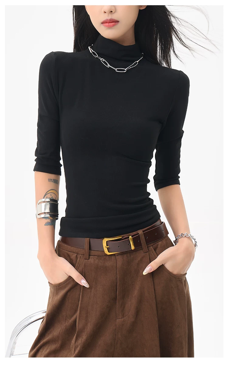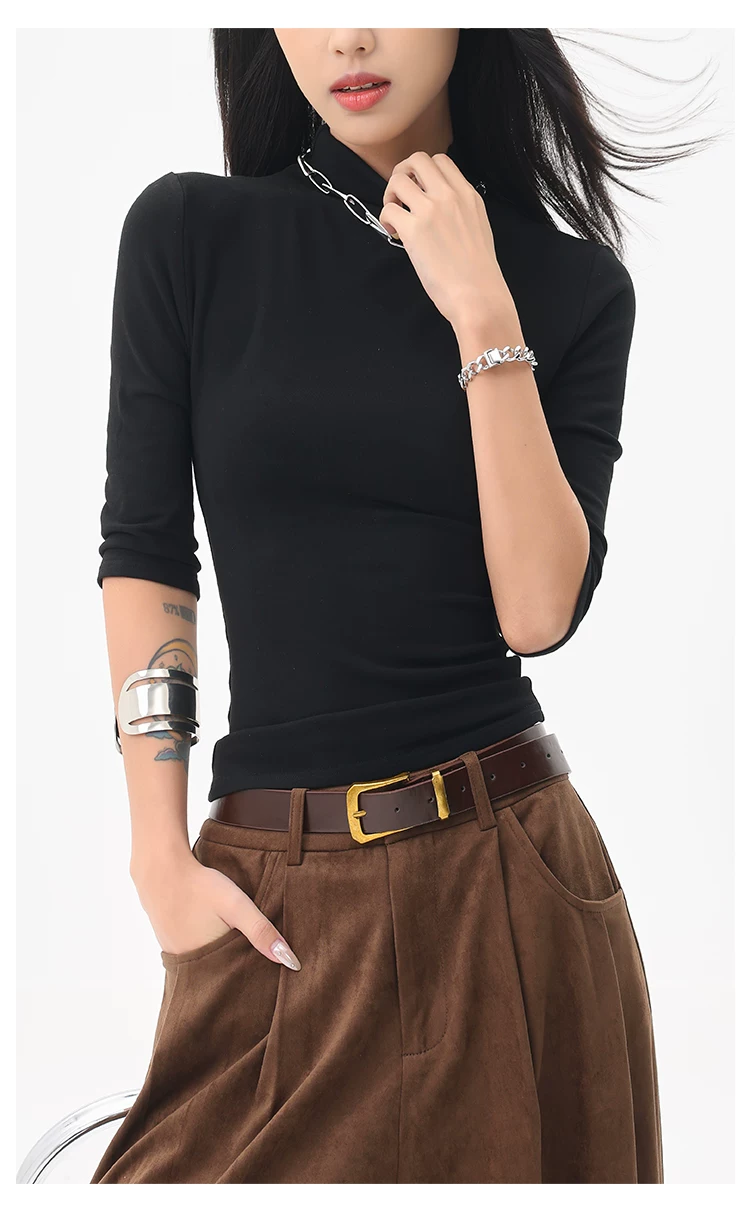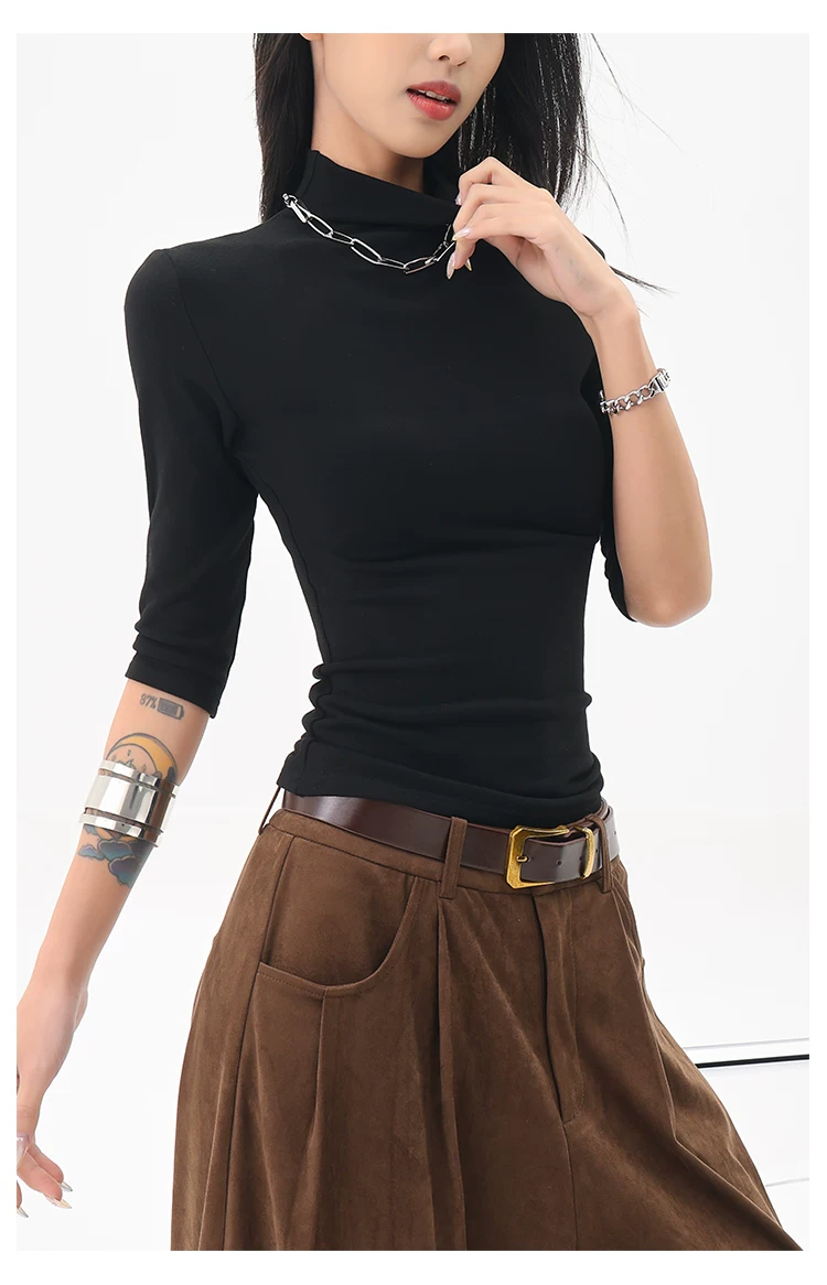 KEN STUDIO Áo thun dệt kim nửa tay cổ cao Melard dành cho nữ, áo trong mỏng vừa vặn mới đầu mùa thu