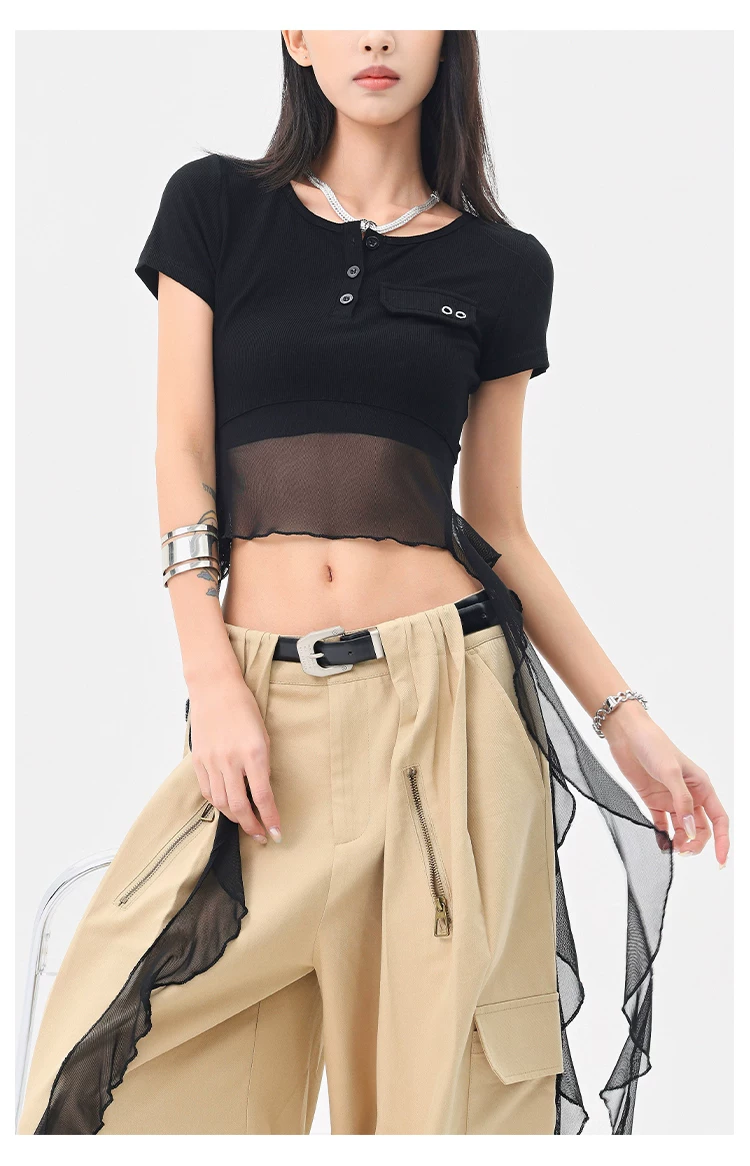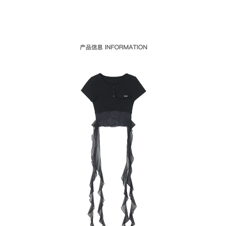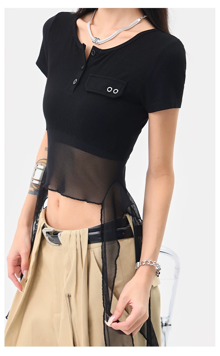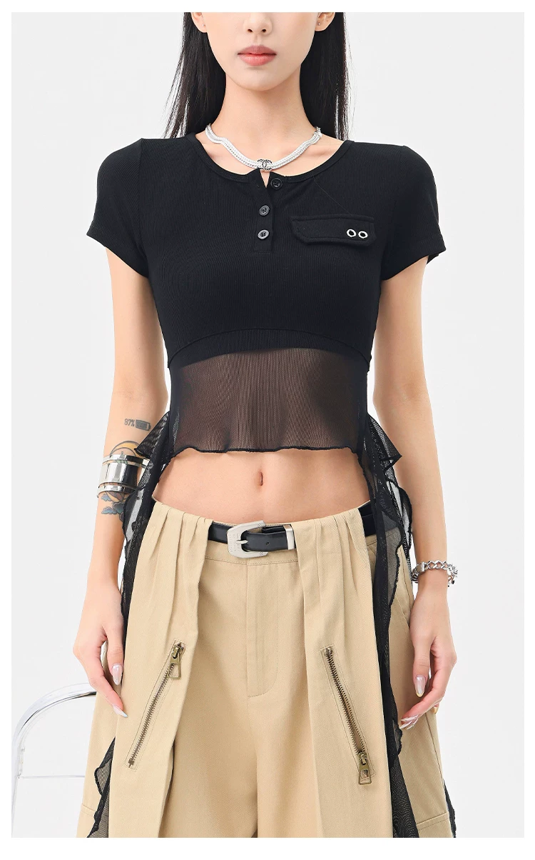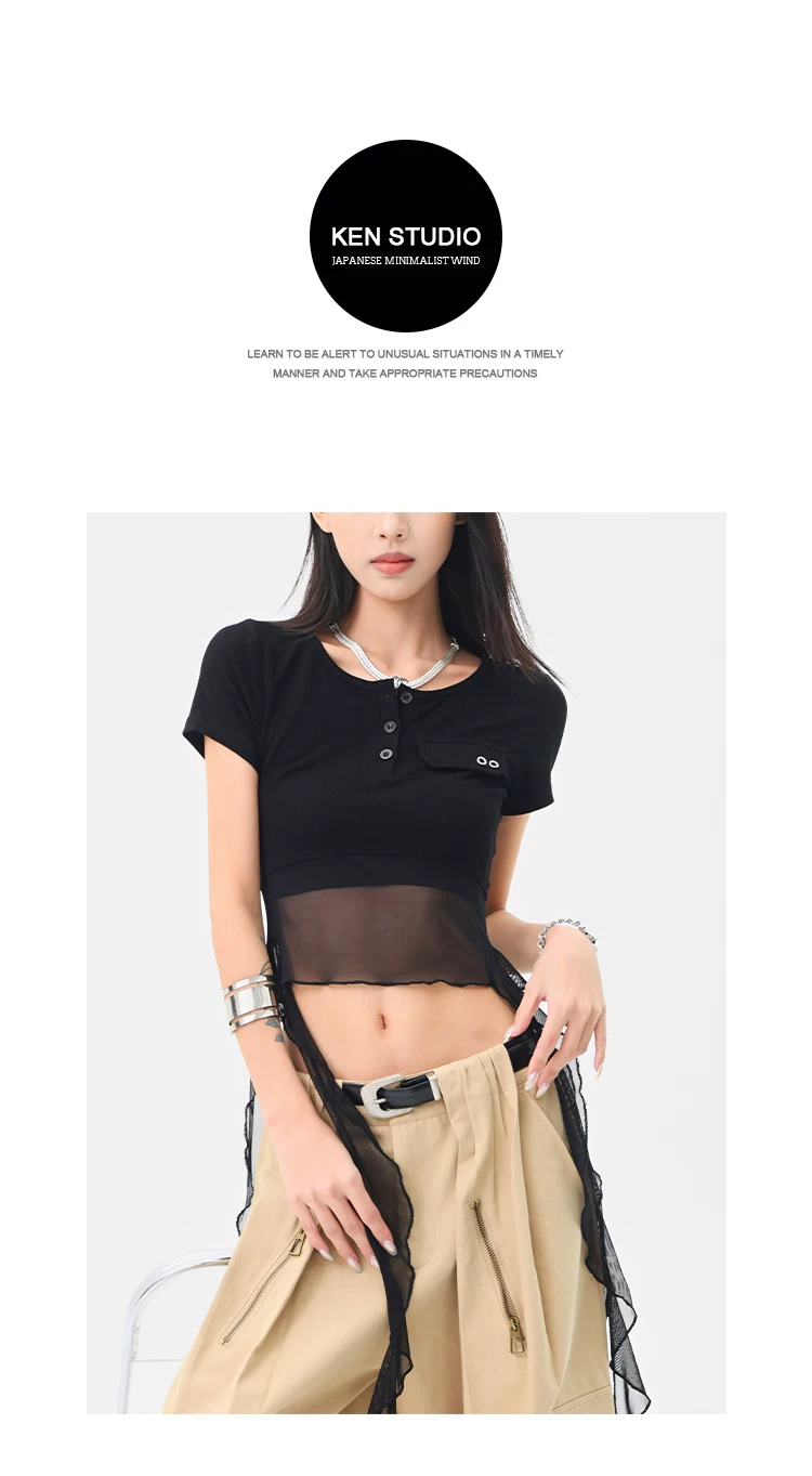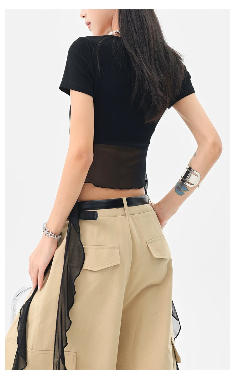 KEN STUDIO Áo thun ngắn tay lưới ruy băng đen phong cách Mỹ dành cho nữ, áo crop top ngắn lưng cao, áo ôm dáng
