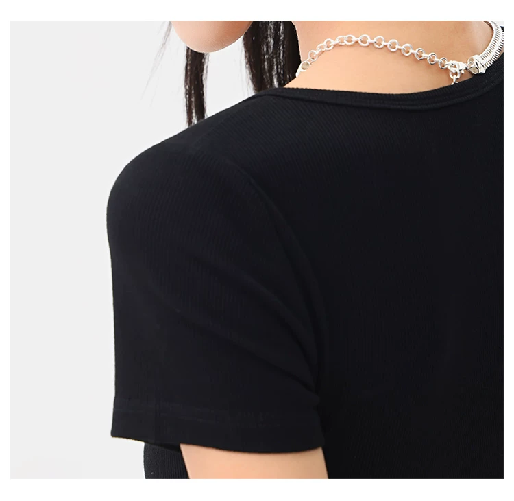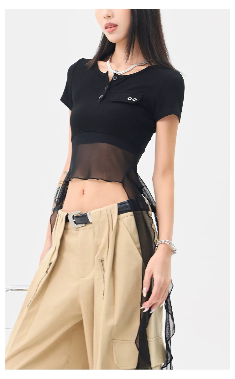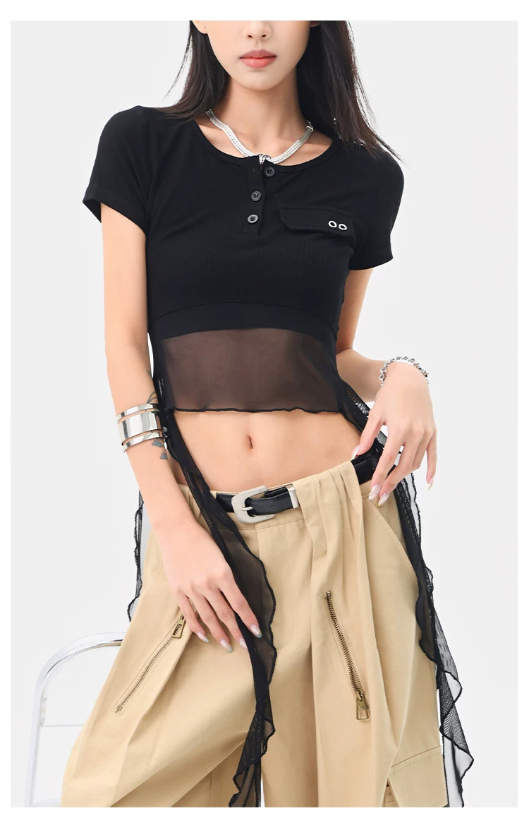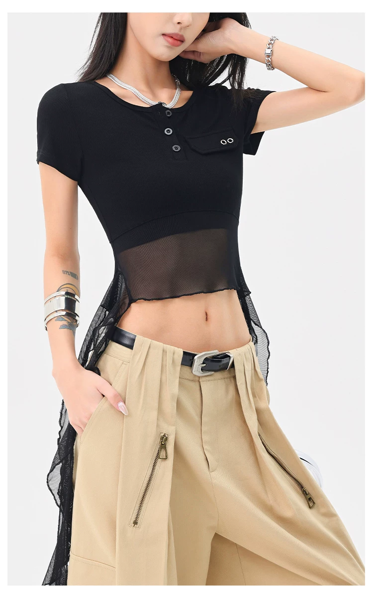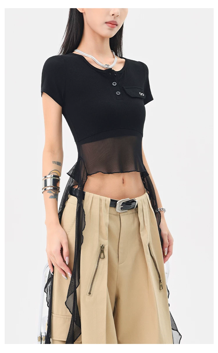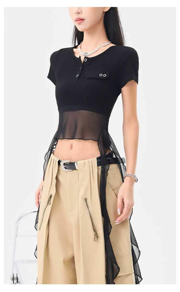 KEN STUDIO Áo thun ngắn tay lưới ruy băng đen phong cách Mỹ dành cho nữ, áo crop top ngắn lưng cao, áo ôm dáng
