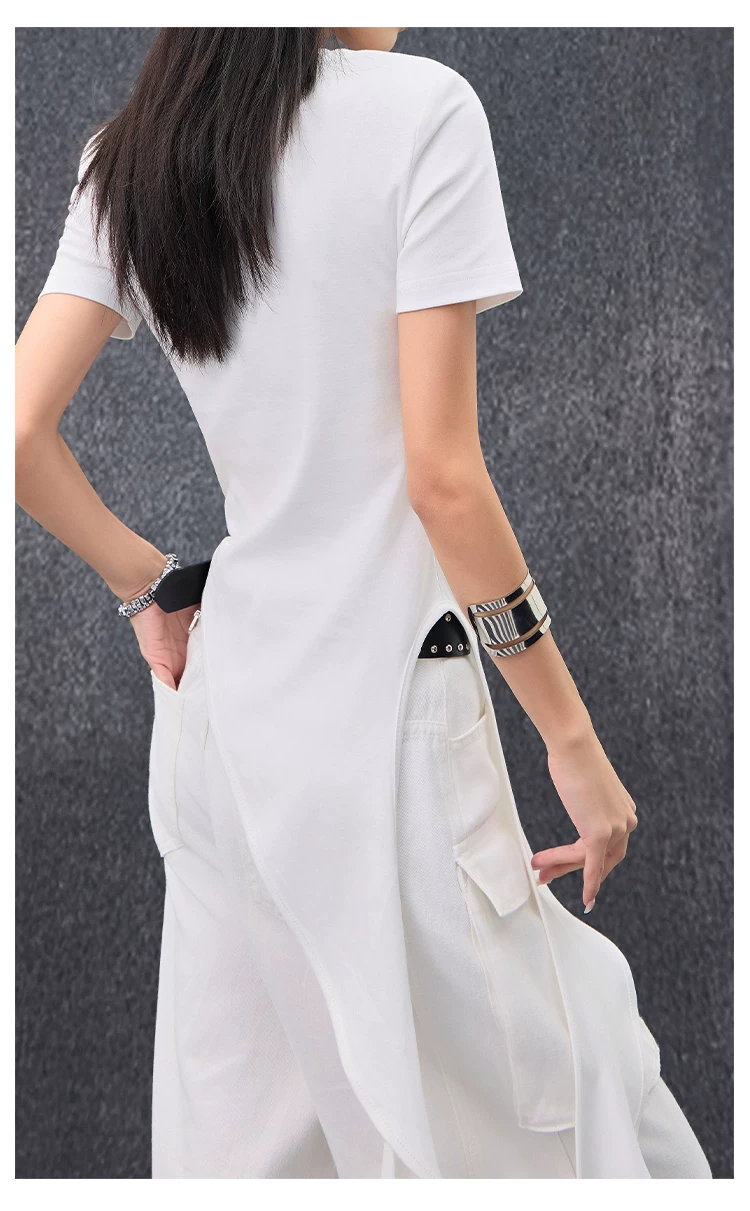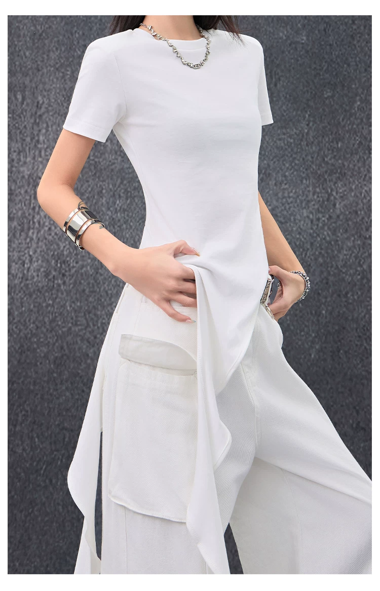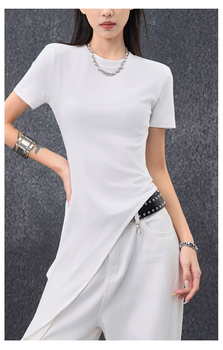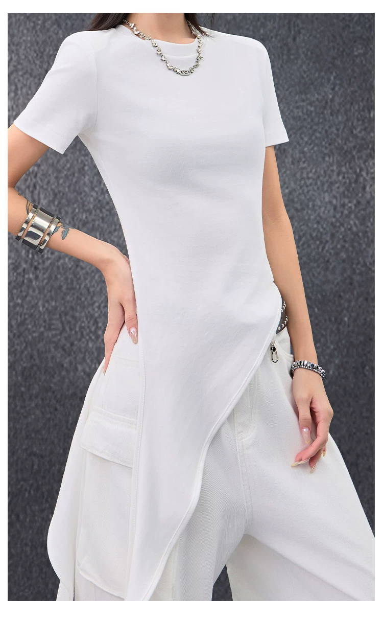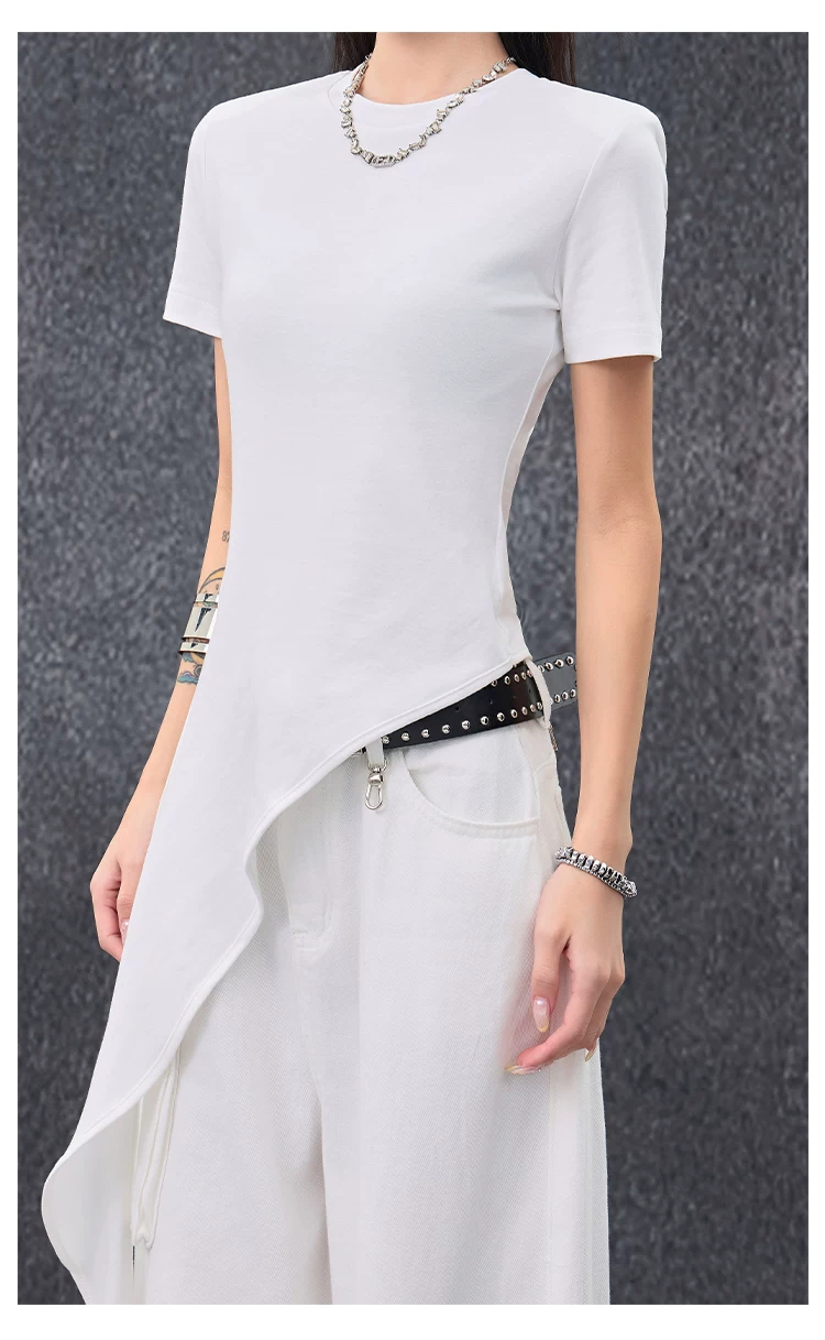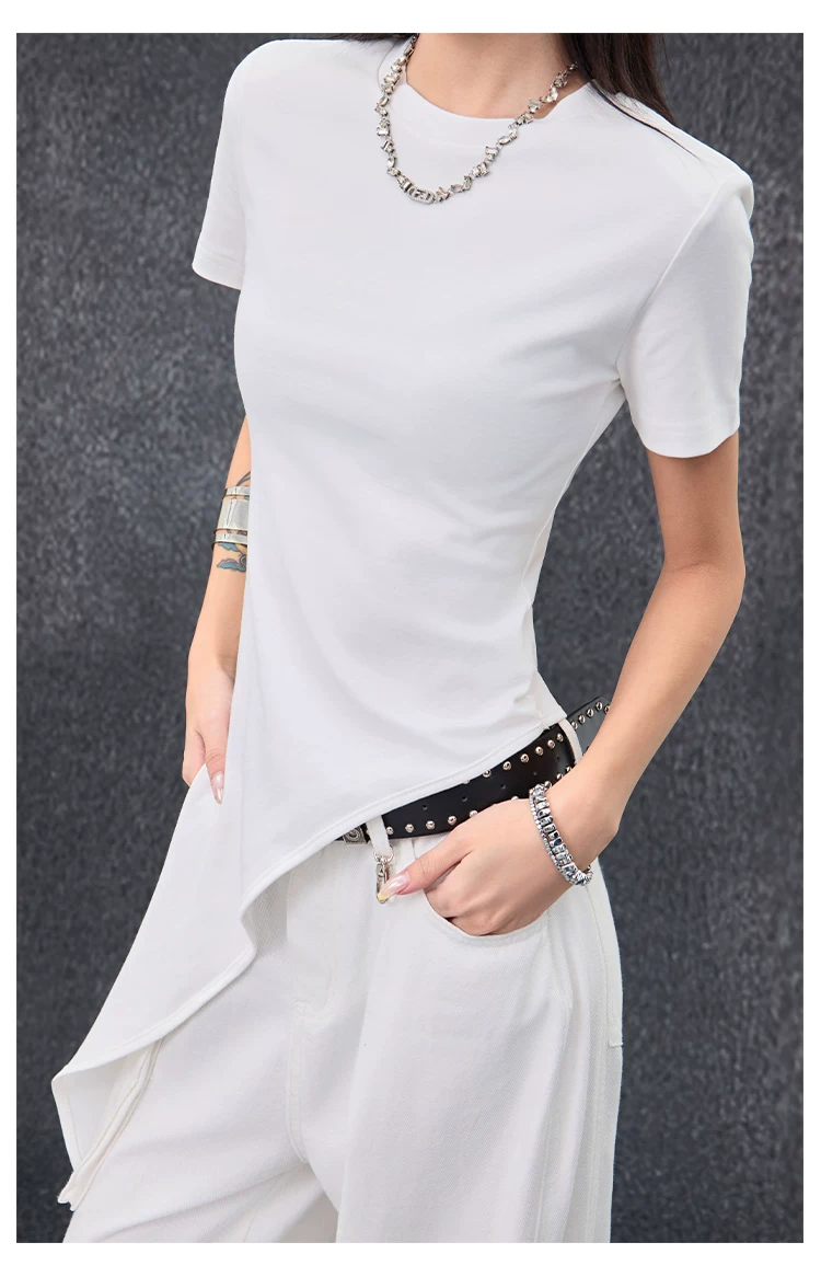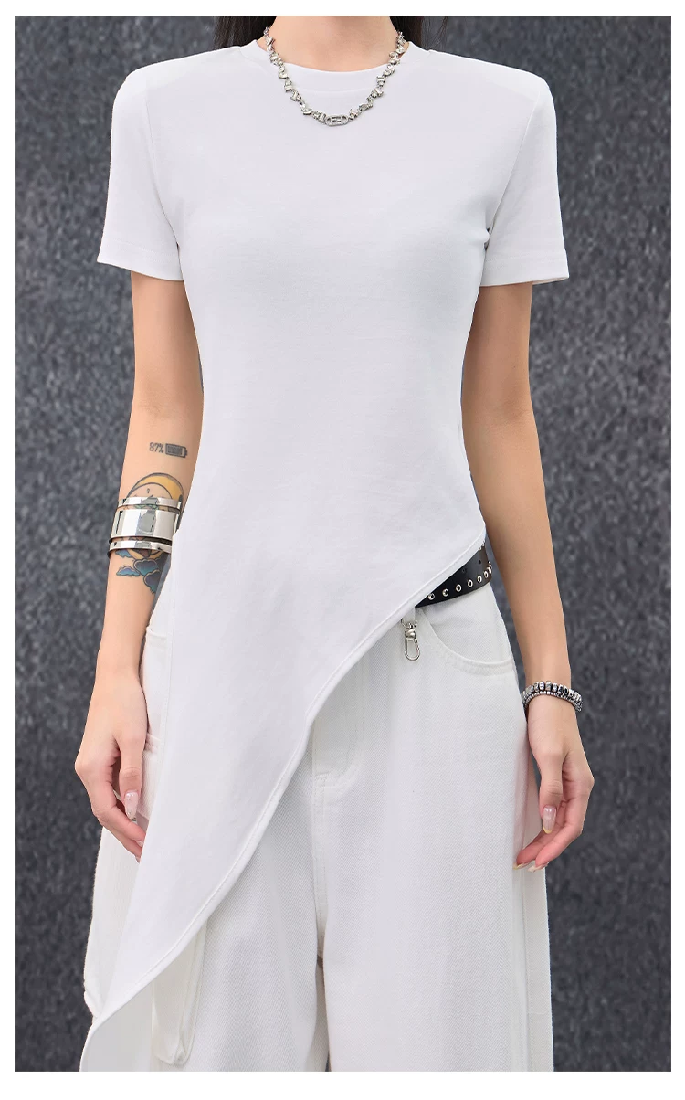 - KEN STUDIO áo thun trắng cổ tròn tay ngắn thiết kế mùa hè độc đáo áo dáng rộng bất đối xứng giúp thon gọn