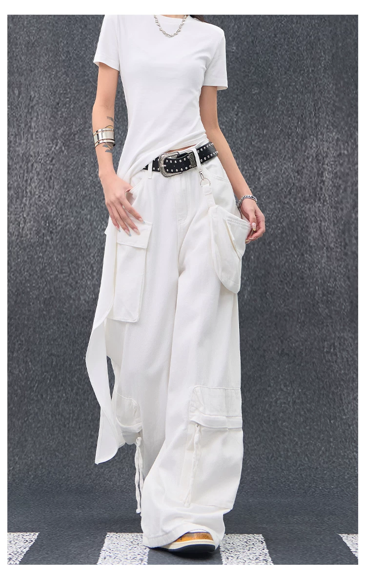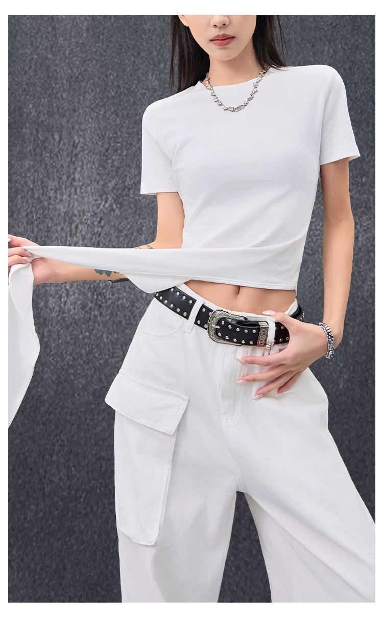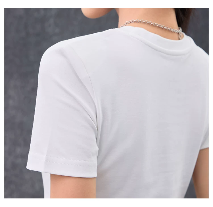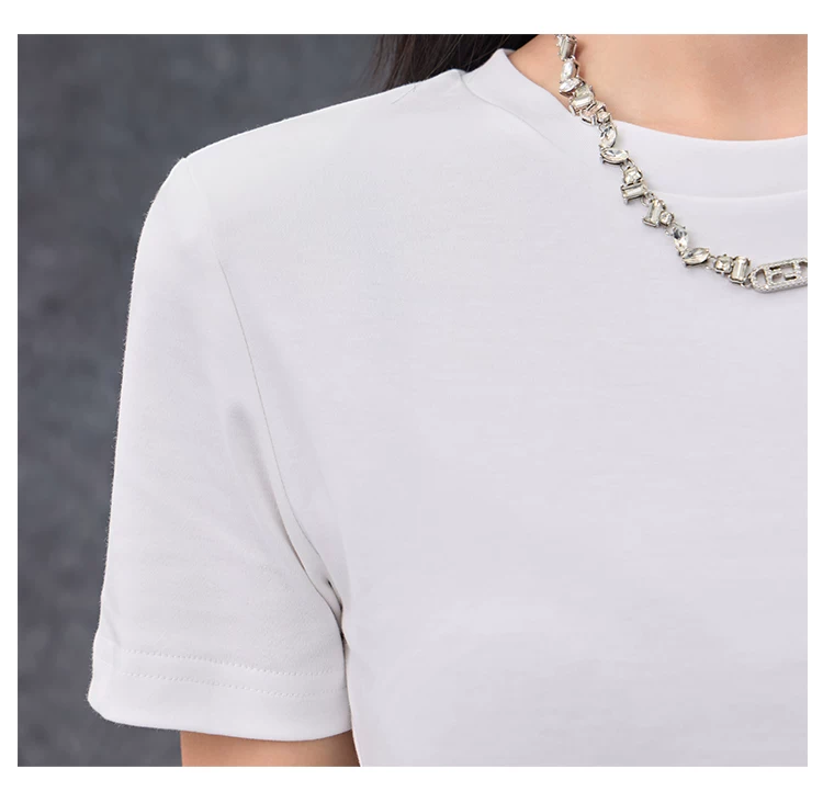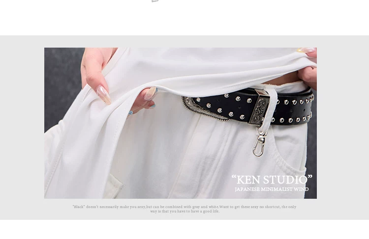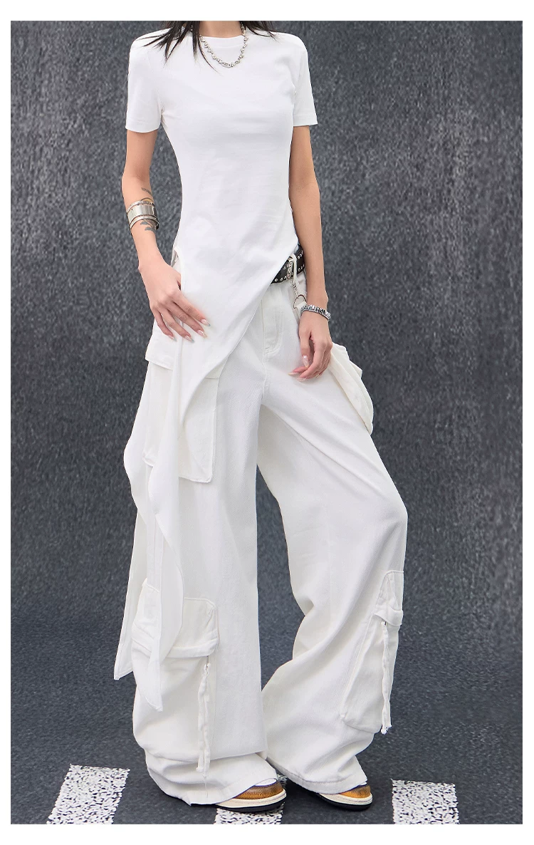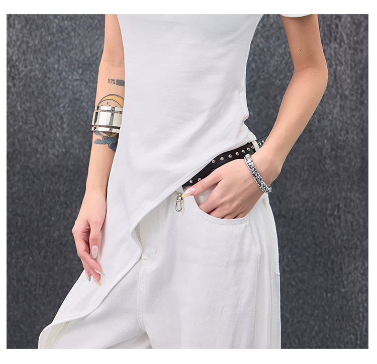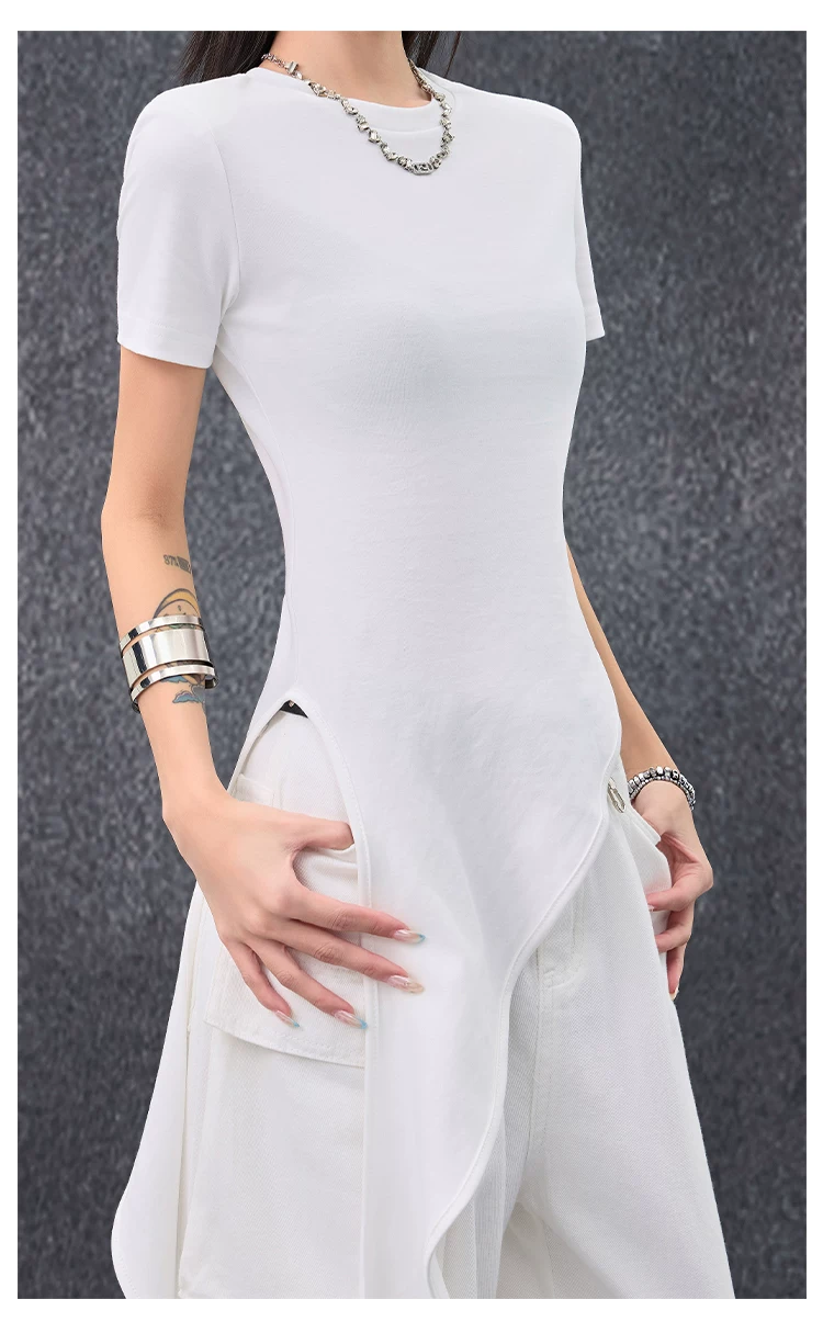 - KEN STUDIO áo thun trắng cổ tròn tay ngắn thiết kế mùa hè độc đáo áo dáng rộng bất đối xứng giúp thon gọn