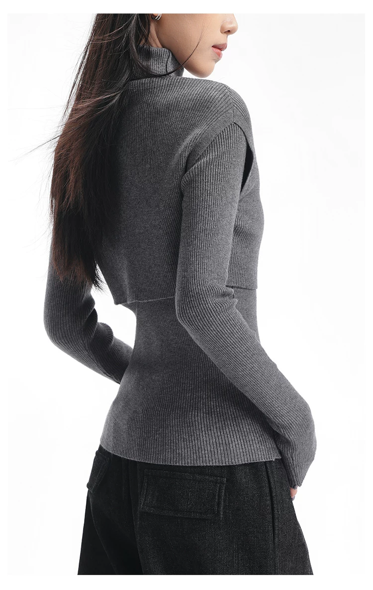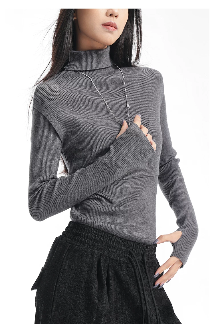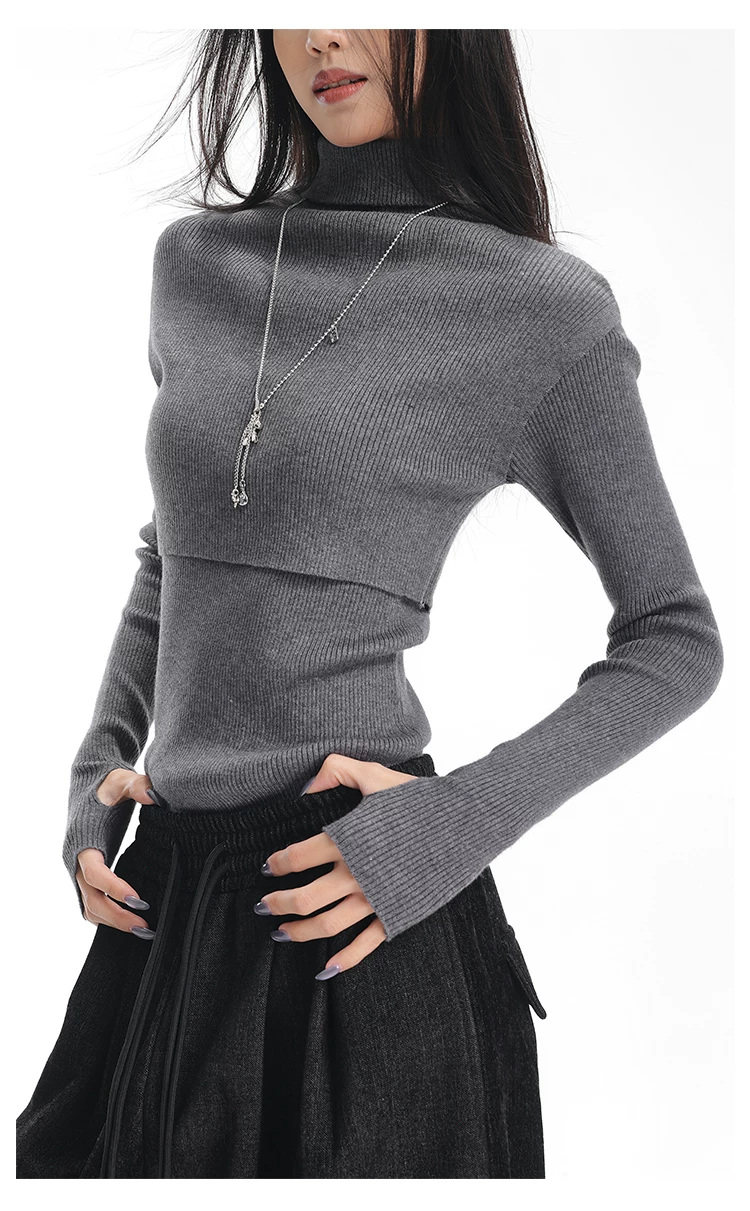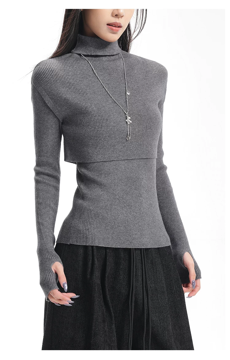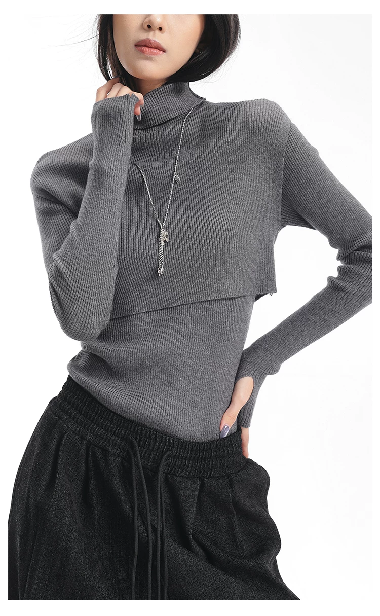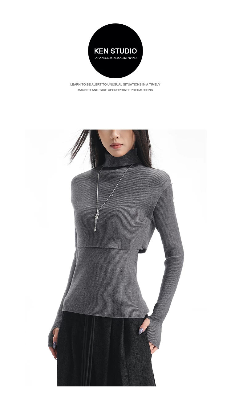 KEN STUDIO Bộ đồ hai mảnh áo len dài tay màu xám mùa thu đông mới dành cho nữ cổ cao ôm sát bên trong