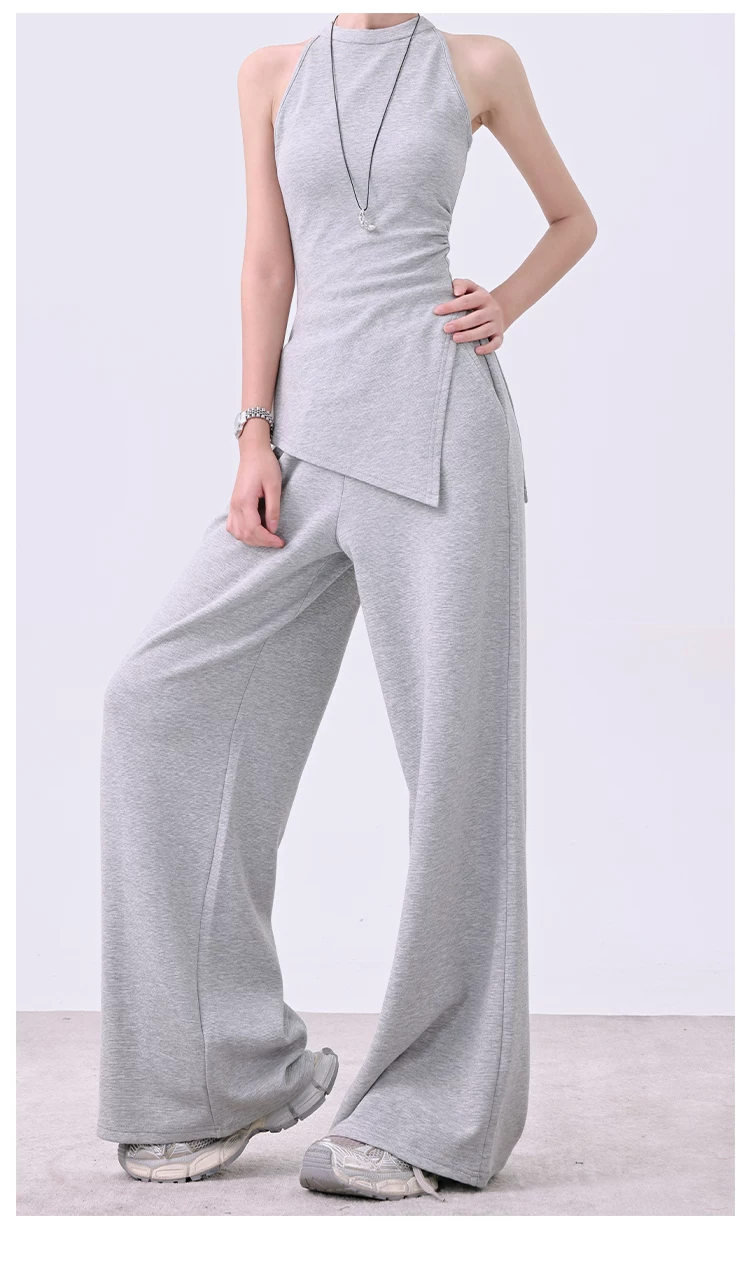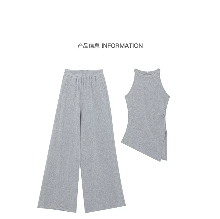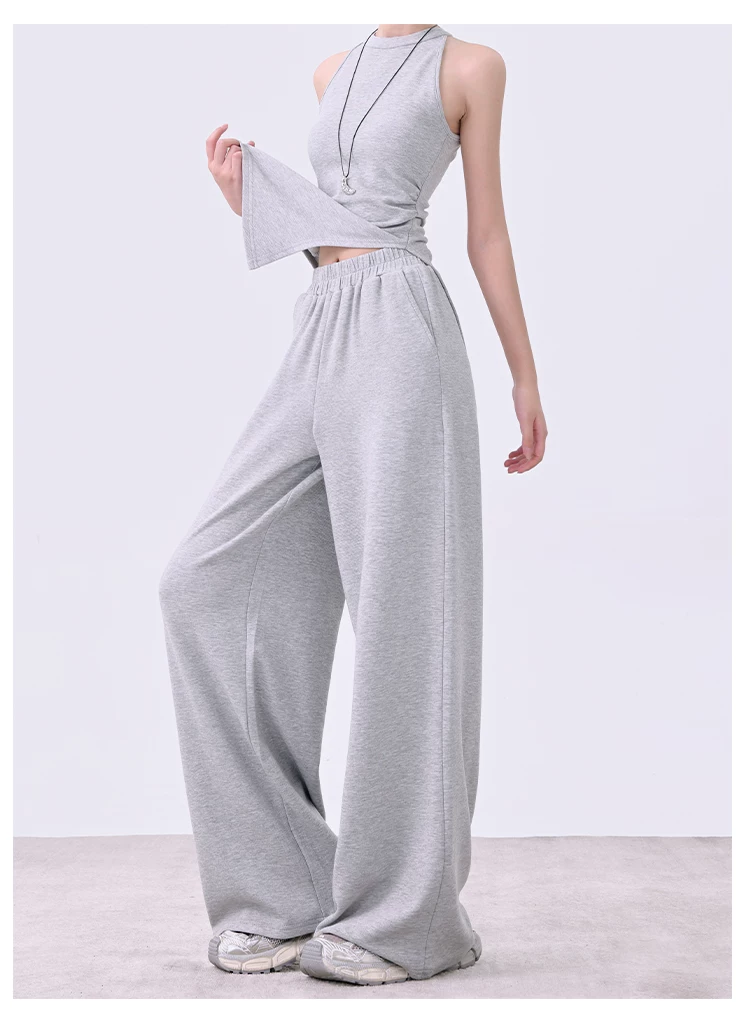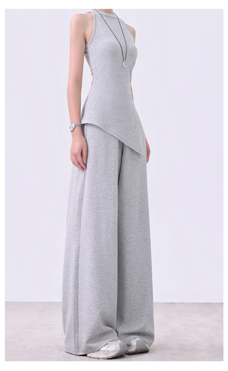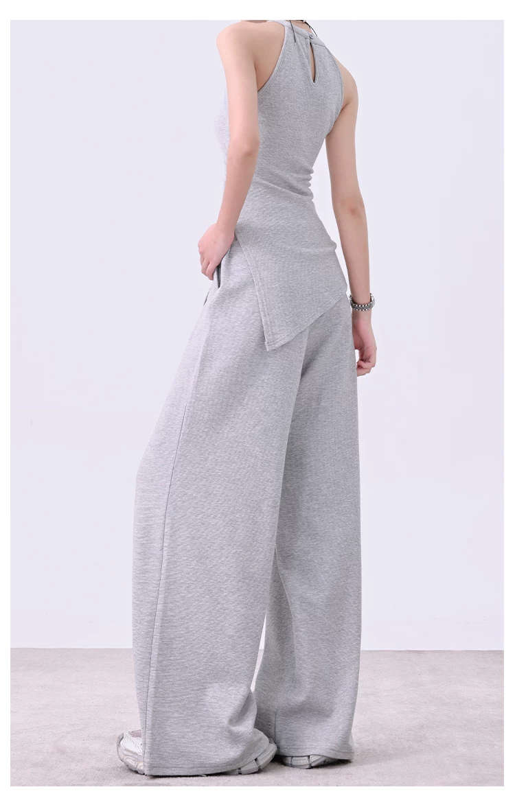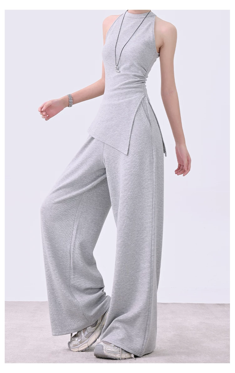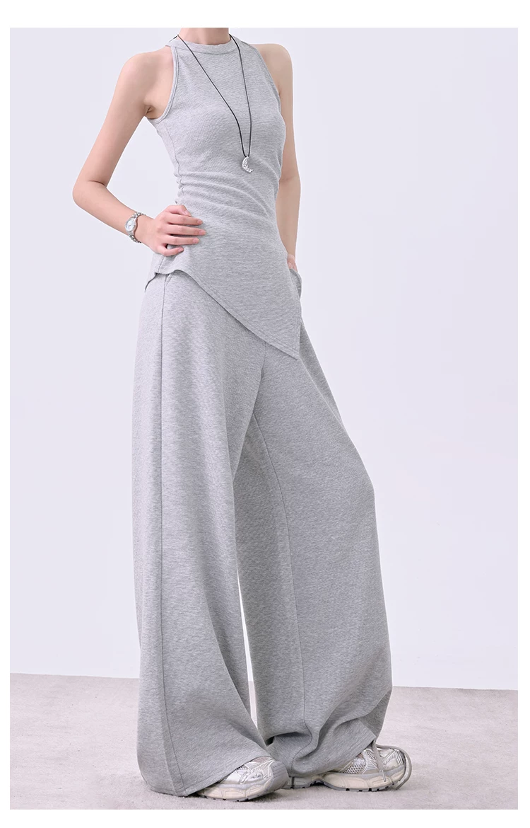 KEN STUDIO Bộ vest màu xám thanh lịch phong cách Hàn Quốc dành cho nữ, áo ba lỗ ôm sát, quần ống rộng dáng rộng, quần thể thao