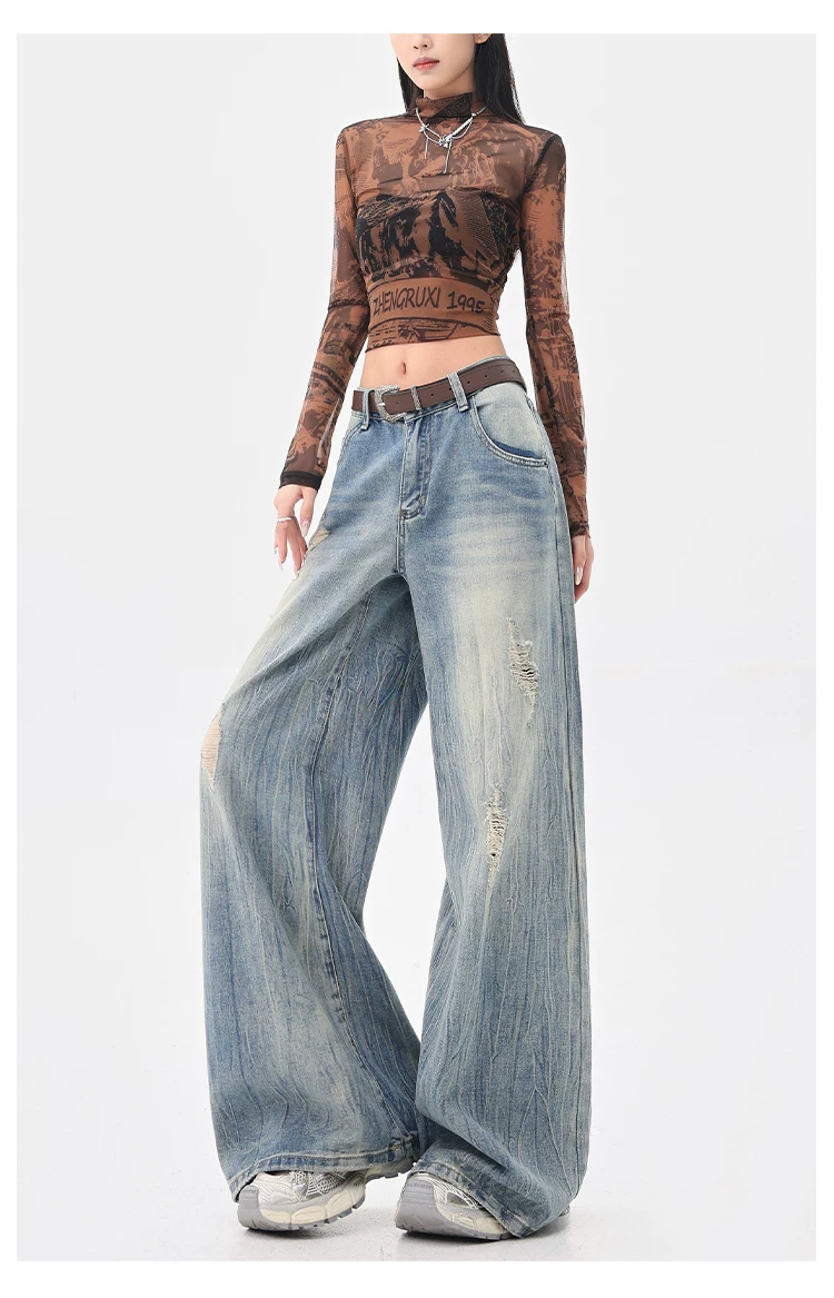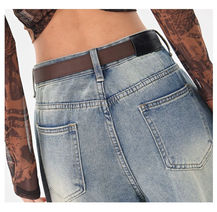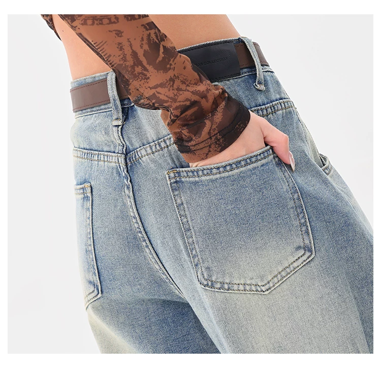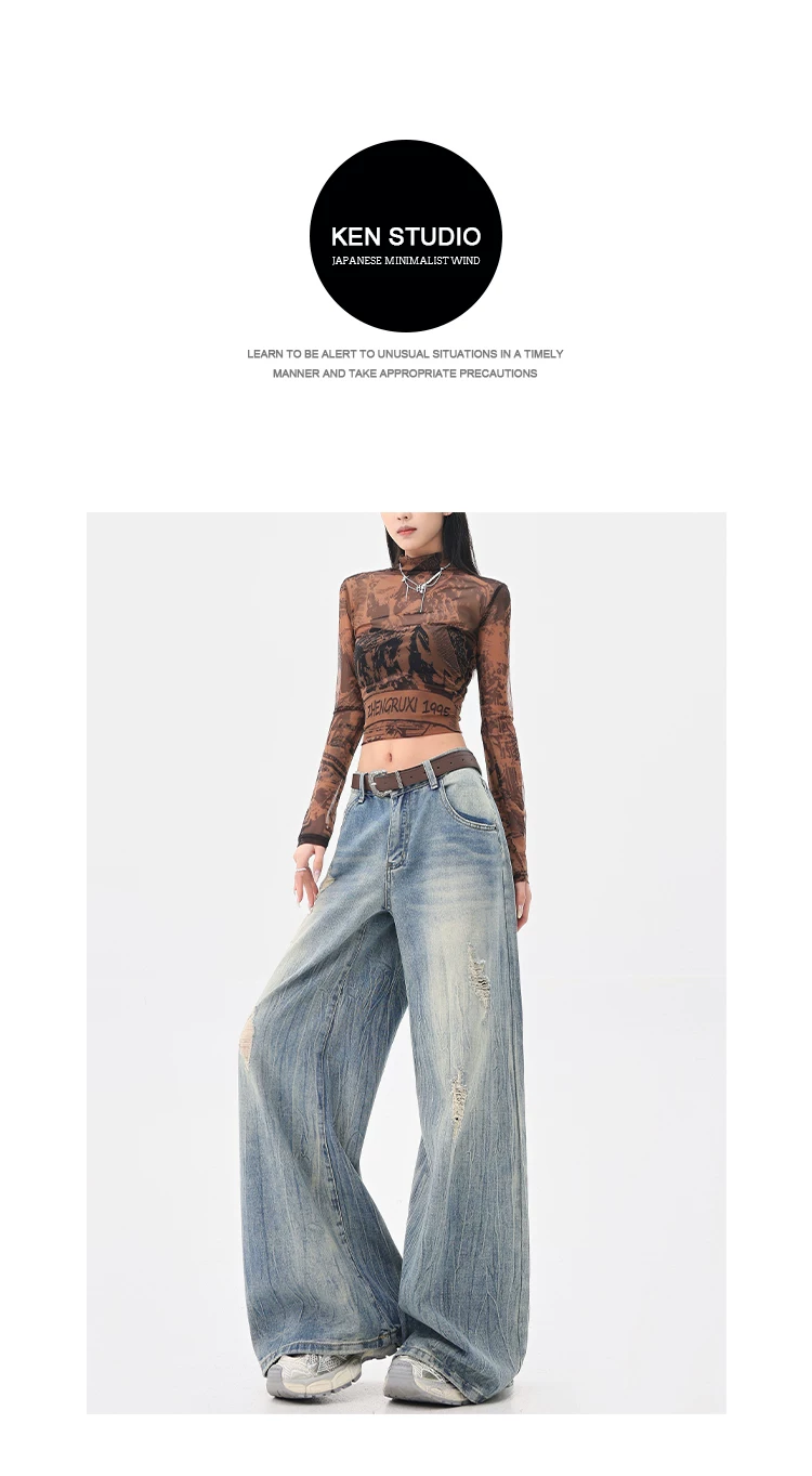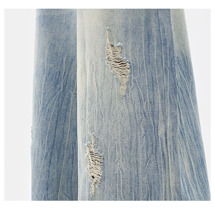 - KEN STUDIO đầu mùa thu quần jean ống rộng rách kiểu Mỹ cổ điển mới dành cho nữ, quần ống đứng dáng suông giản dị
