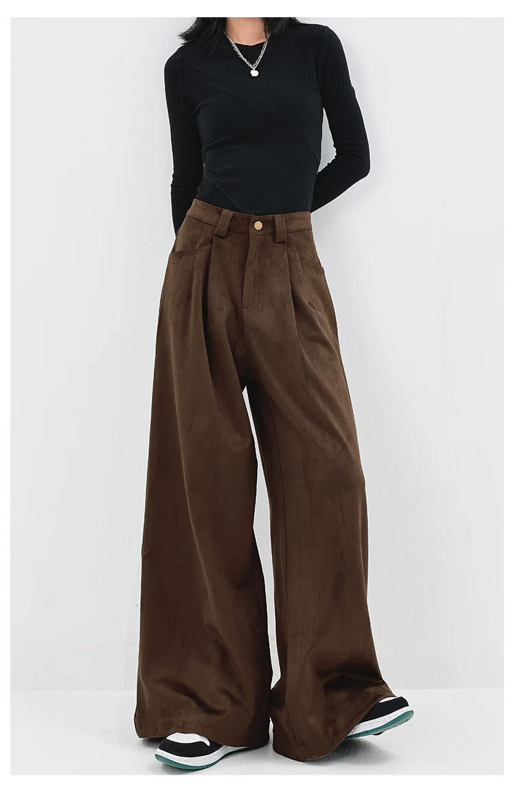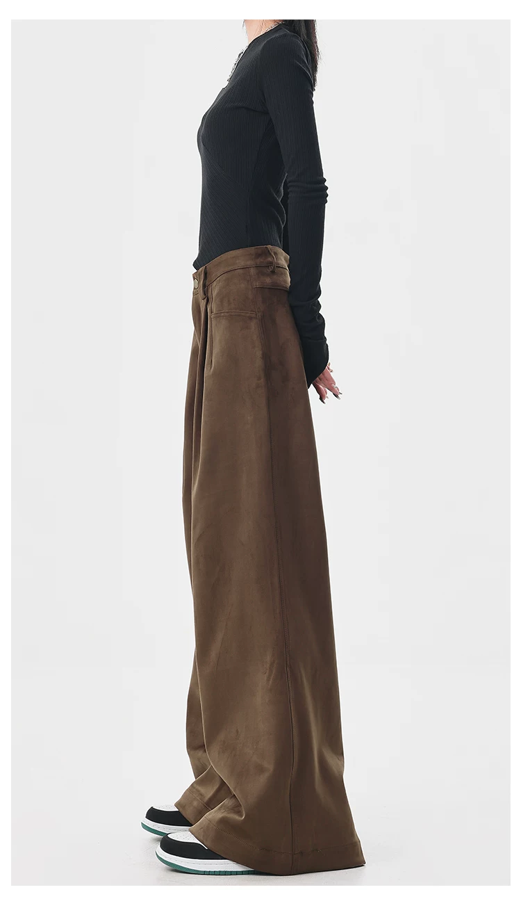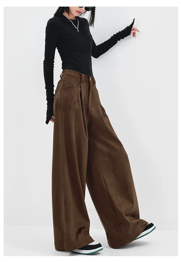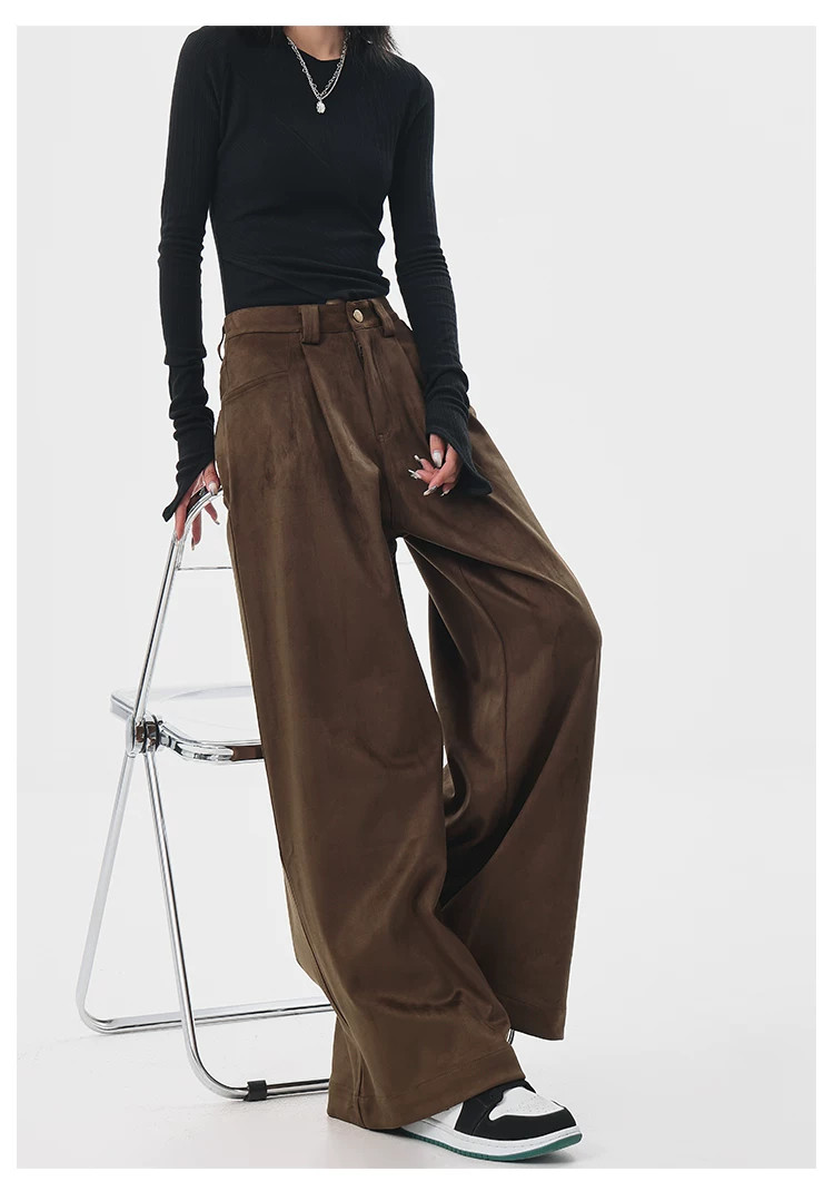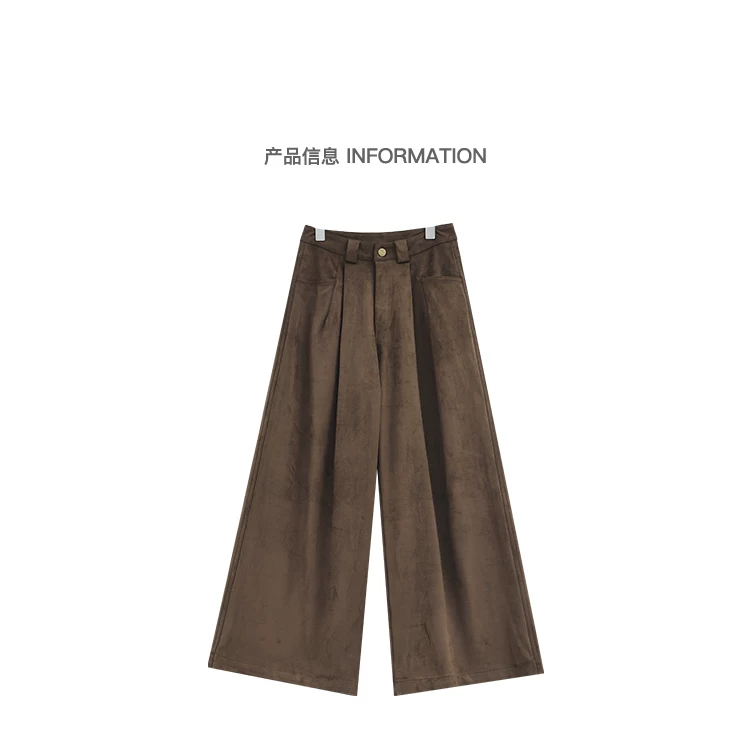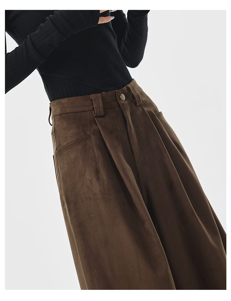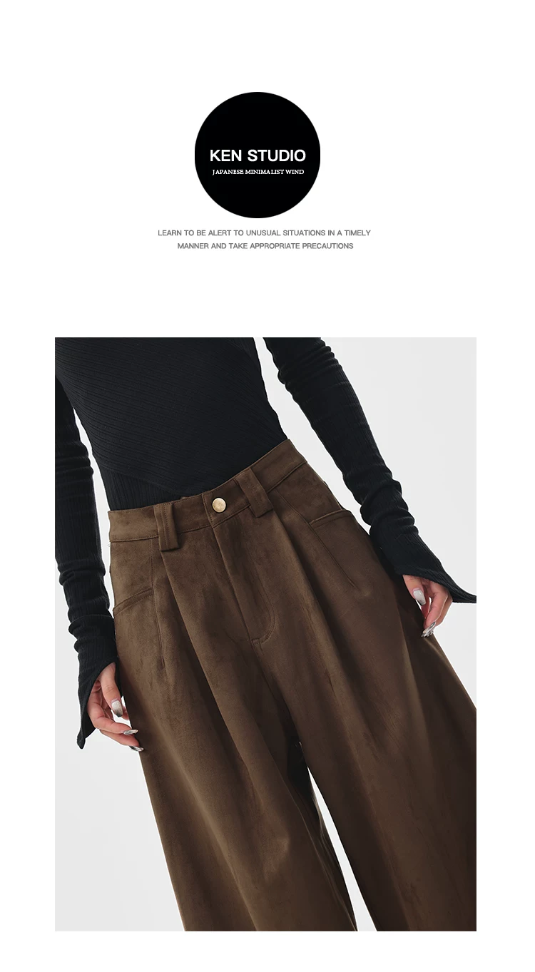 - KEN STUDIO Melard Trang phục Thu Đông Da lộn dày màu cà phê Quần âu nữ dài đến sàn Quần ống rộng