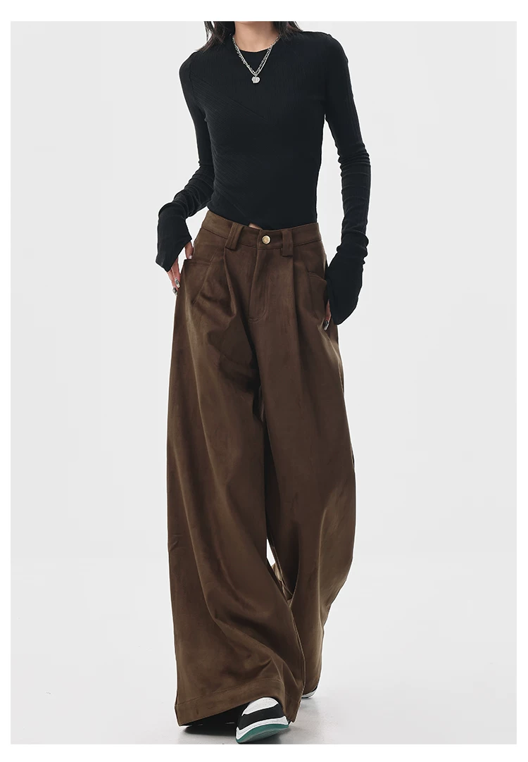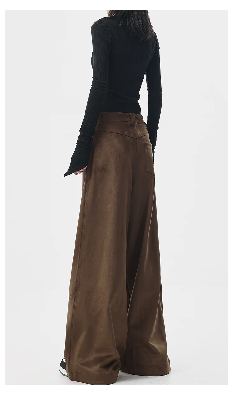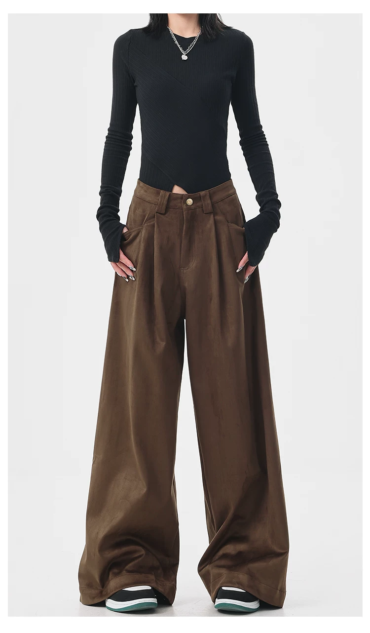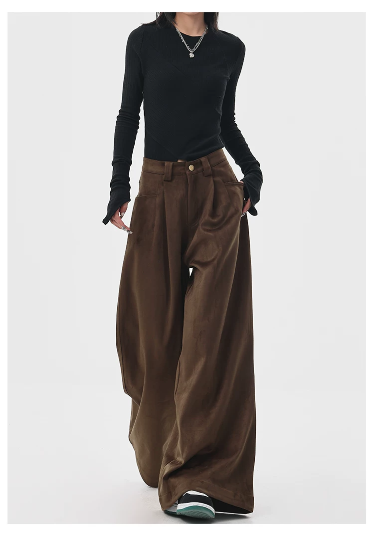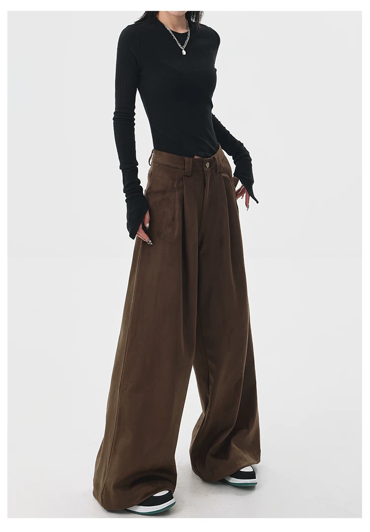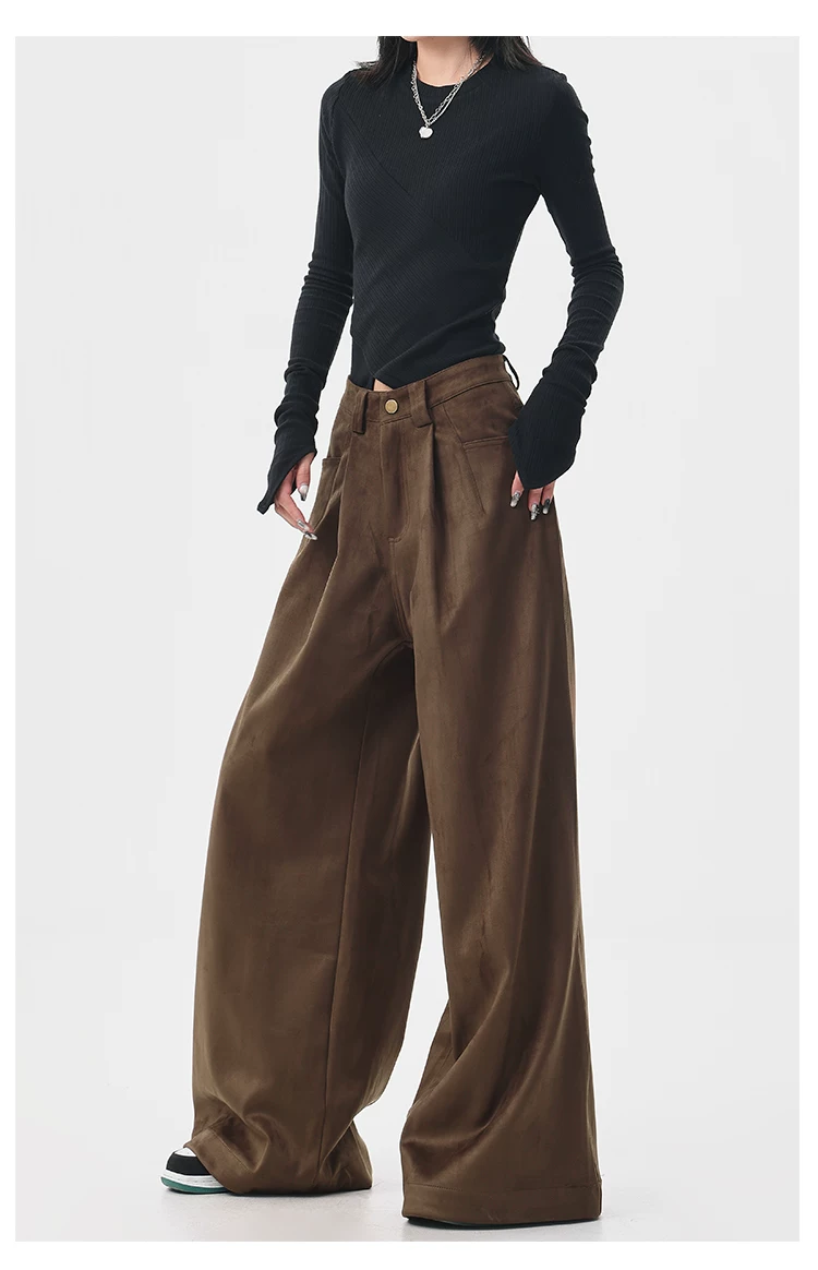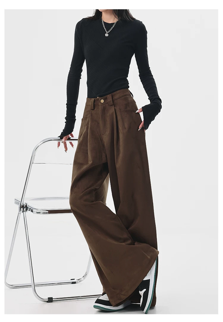 - KEN STUDIO Melard Trang phục Thu Đông Da lộn dày màu cà phê Quần âu nữ dài đến sàn Quần ống rộng