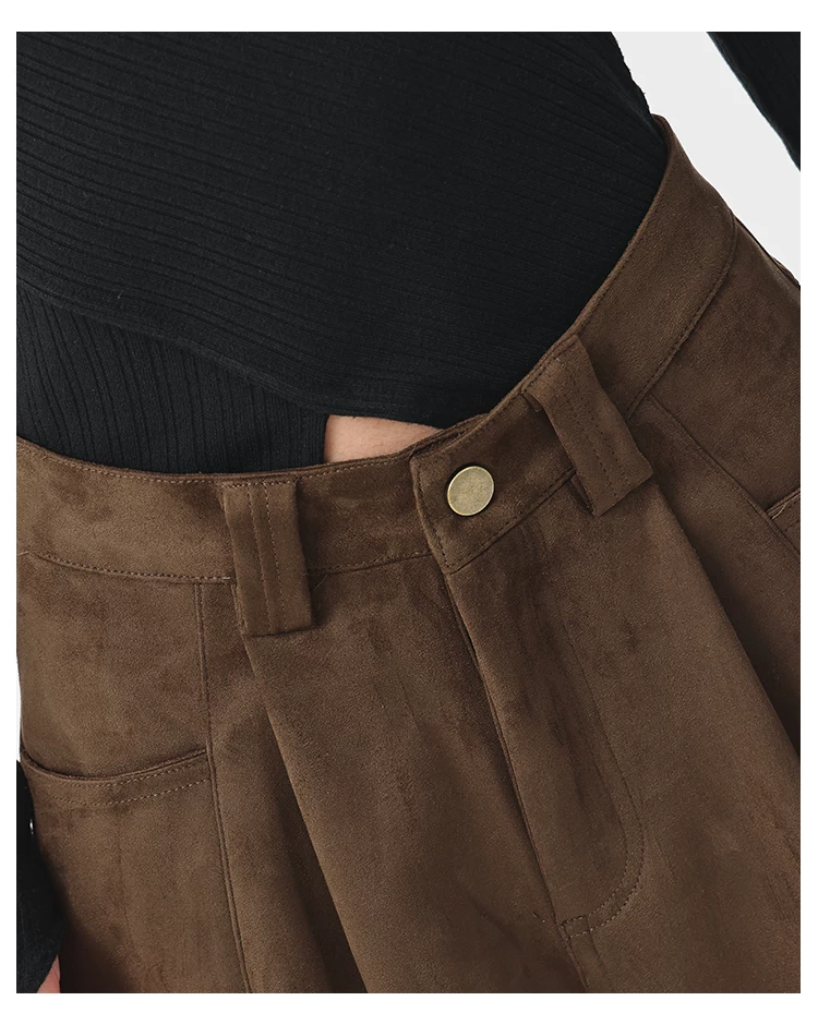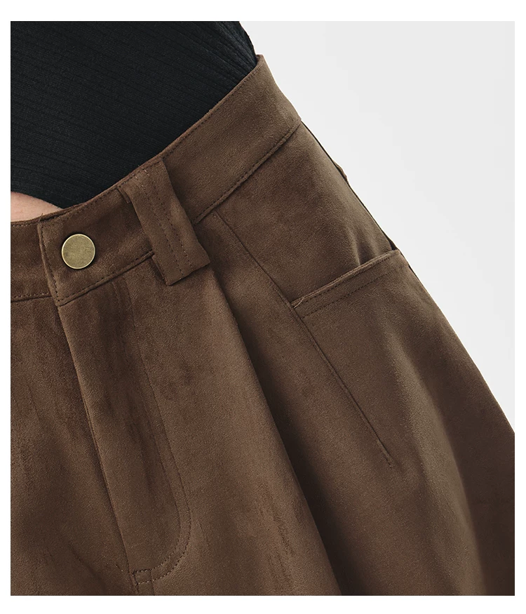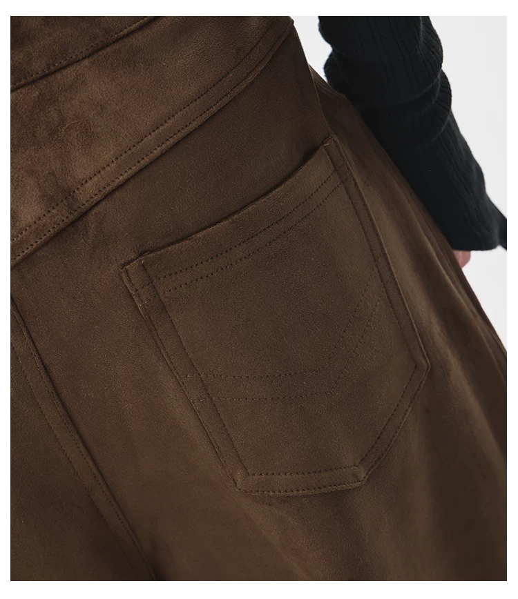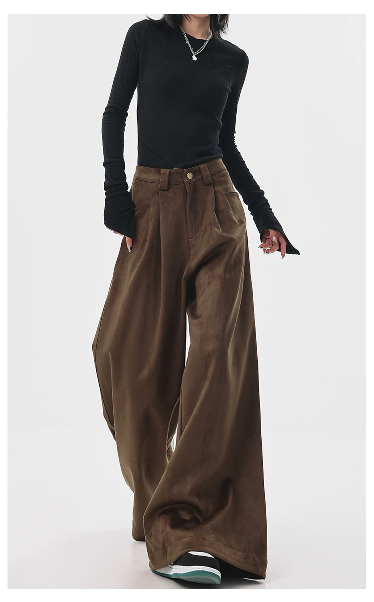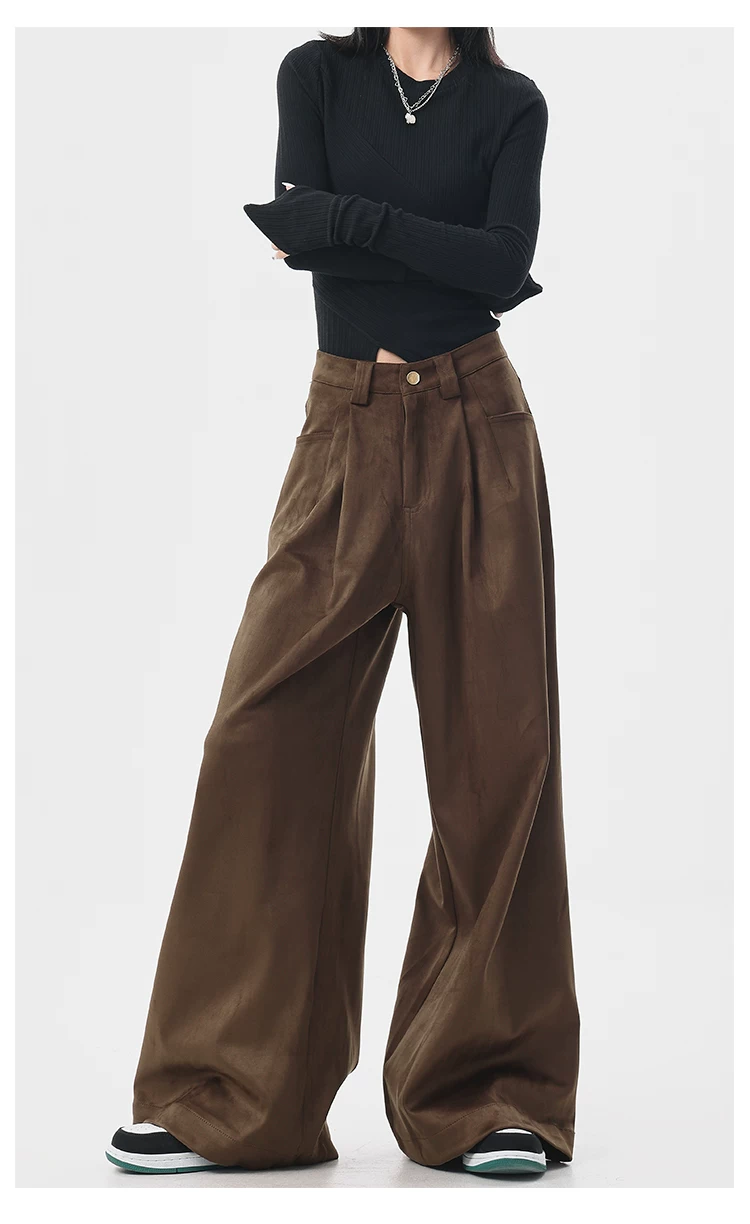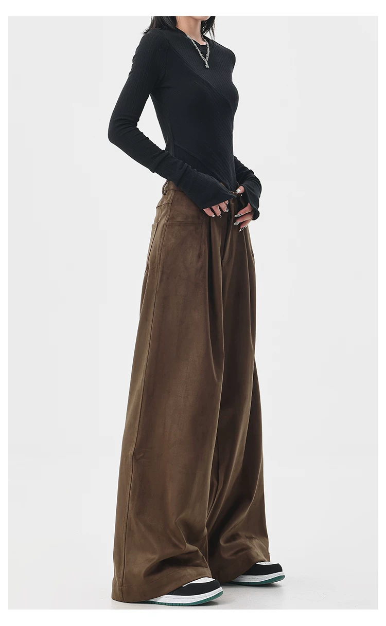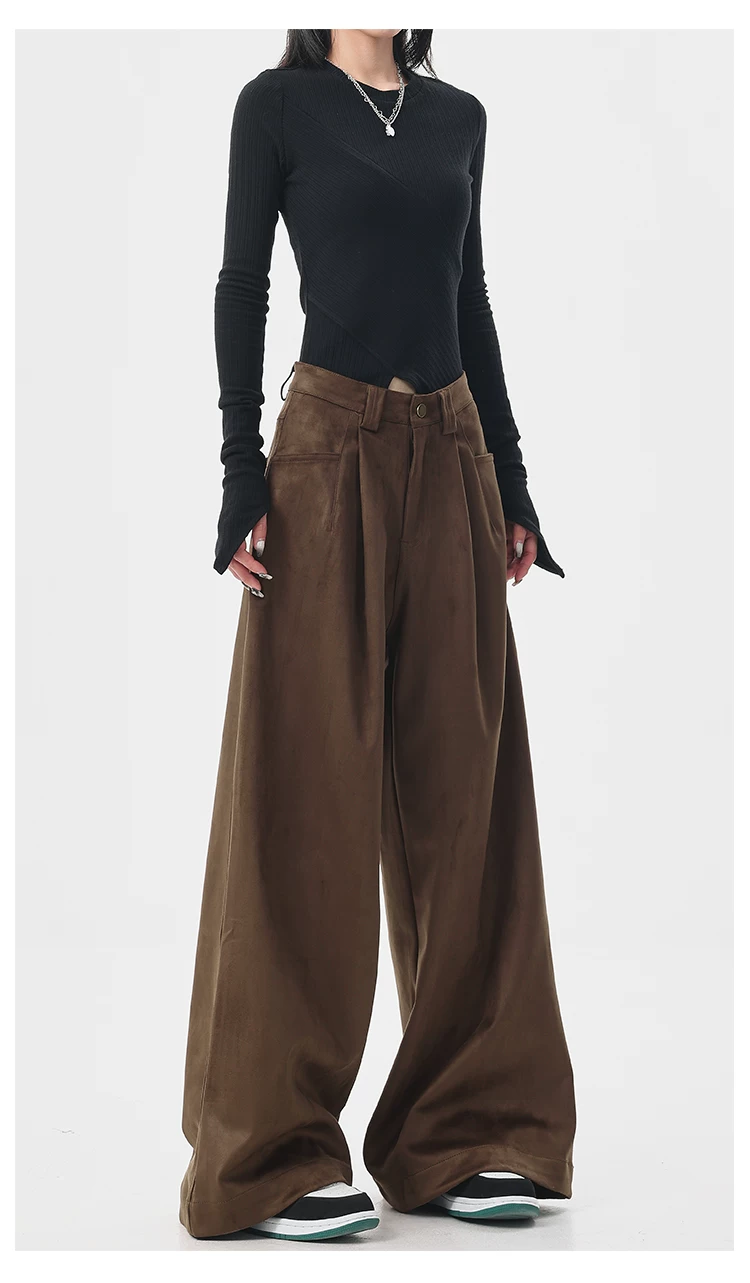 - KEN STUDIO Melard Trang phục Thu Đông Da lộn dày màu cà phê Quần âu nữ dài đến sàn Quần ống rộng