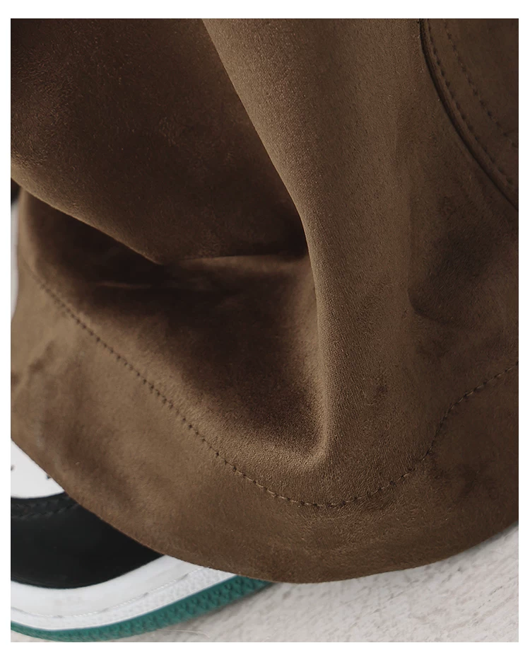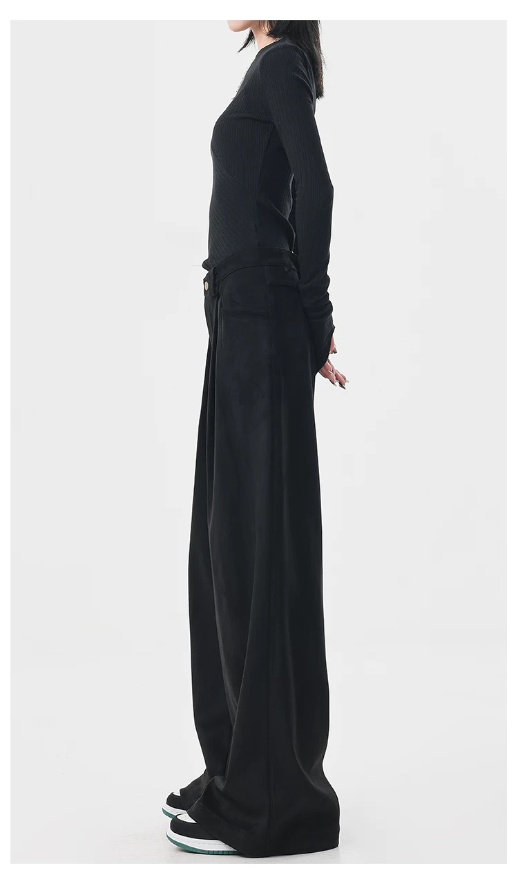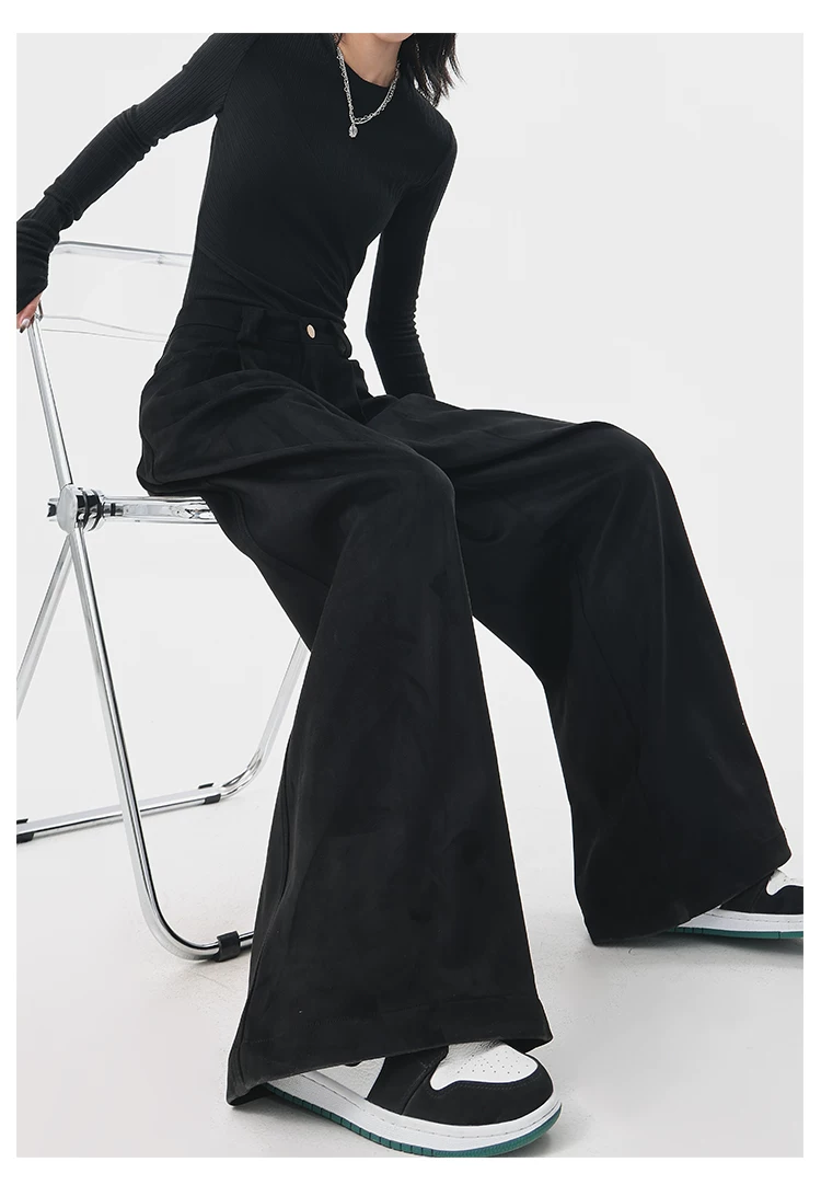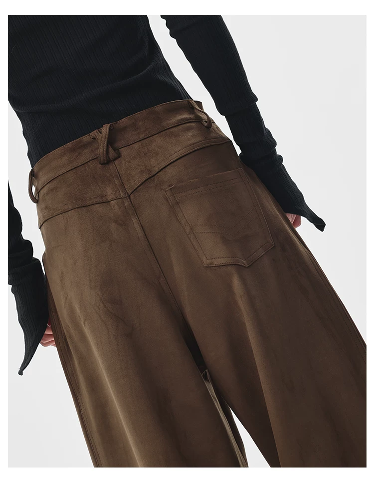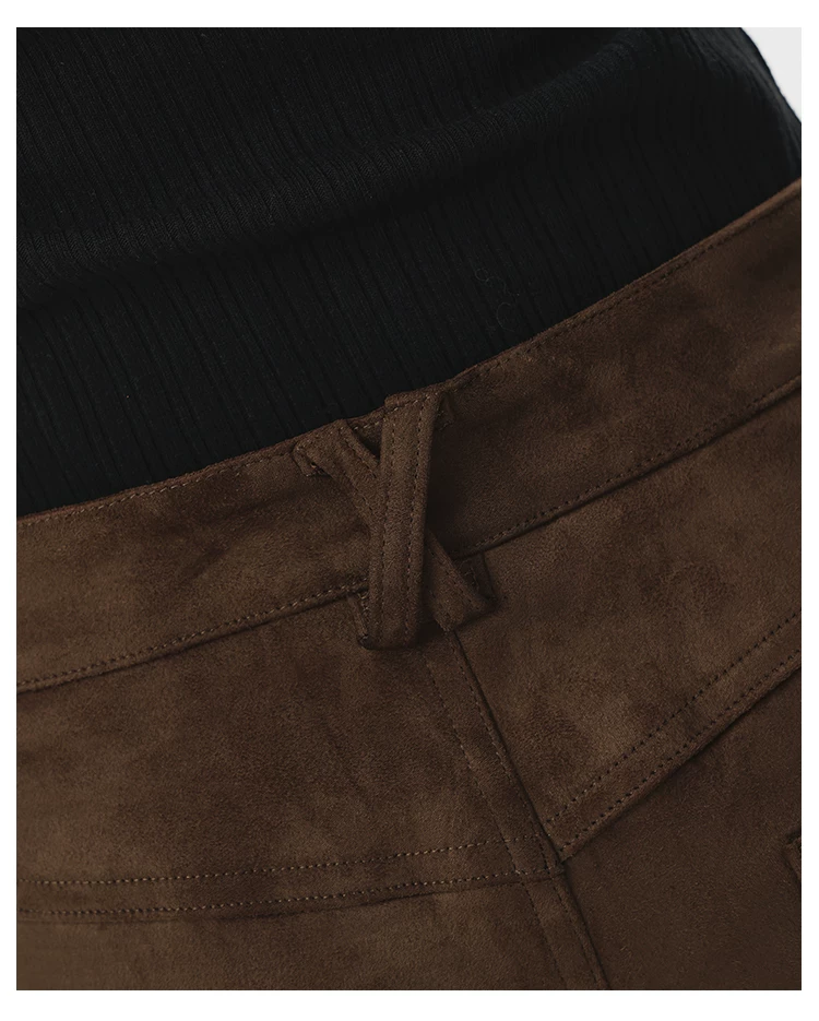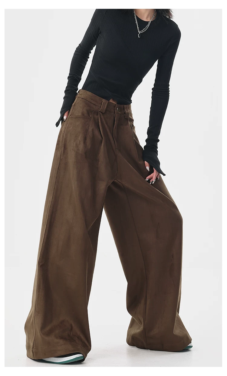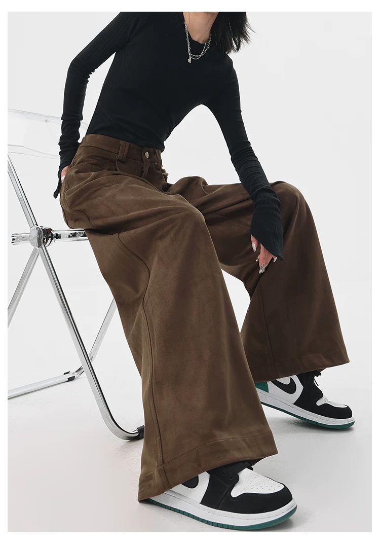 - KEN STUDIO Melard Trang phục Thu Đông Da lộn dày màu cà phê Quần âu nữ dài đến sàn Quần ống rộng