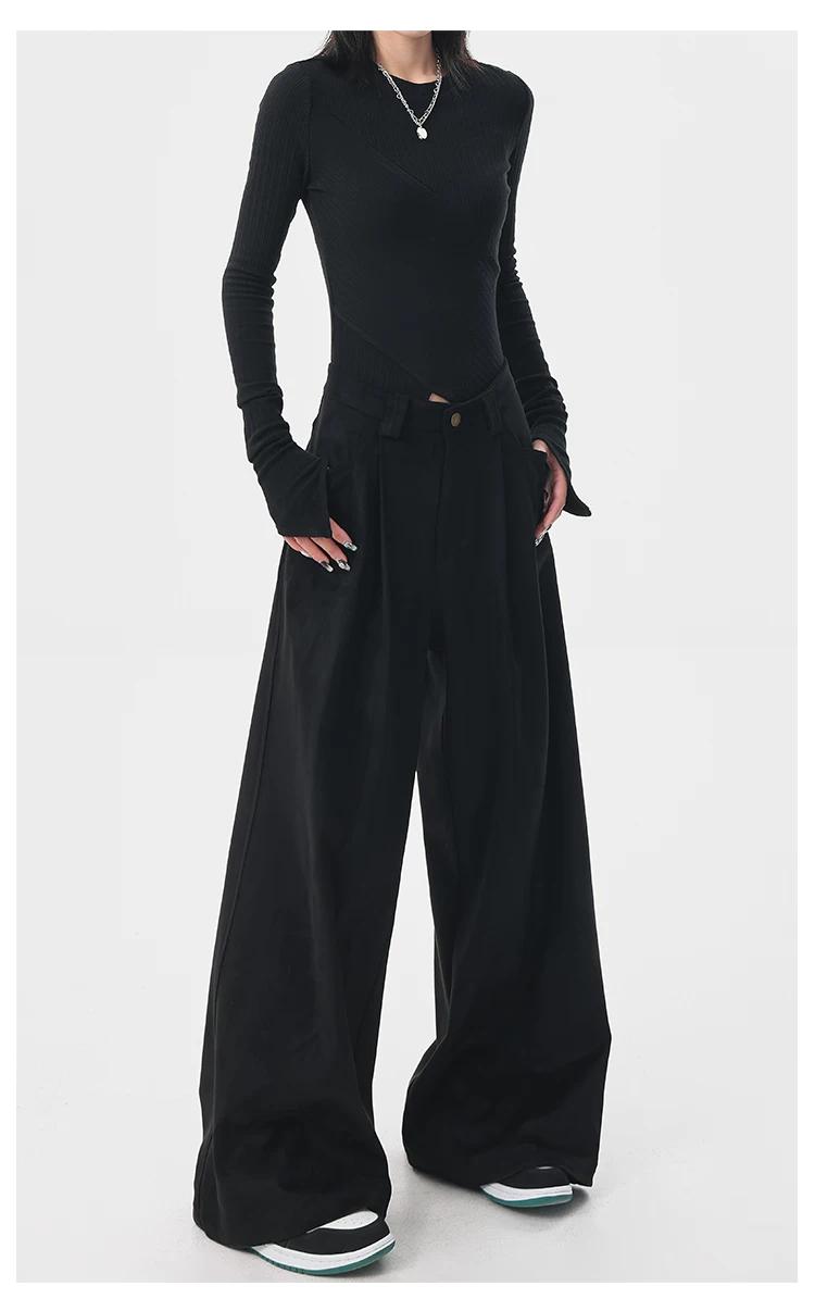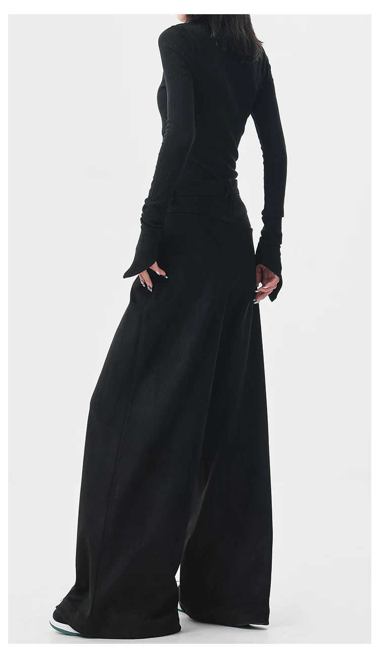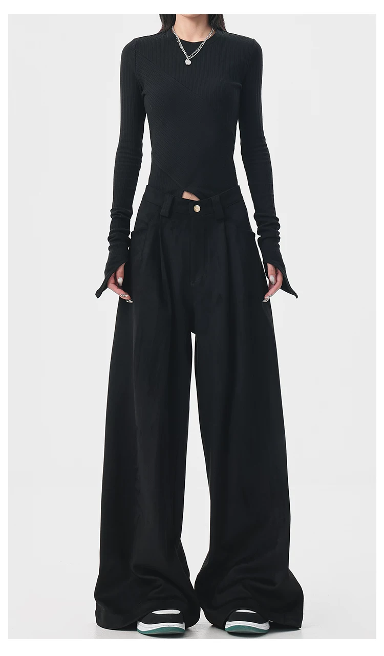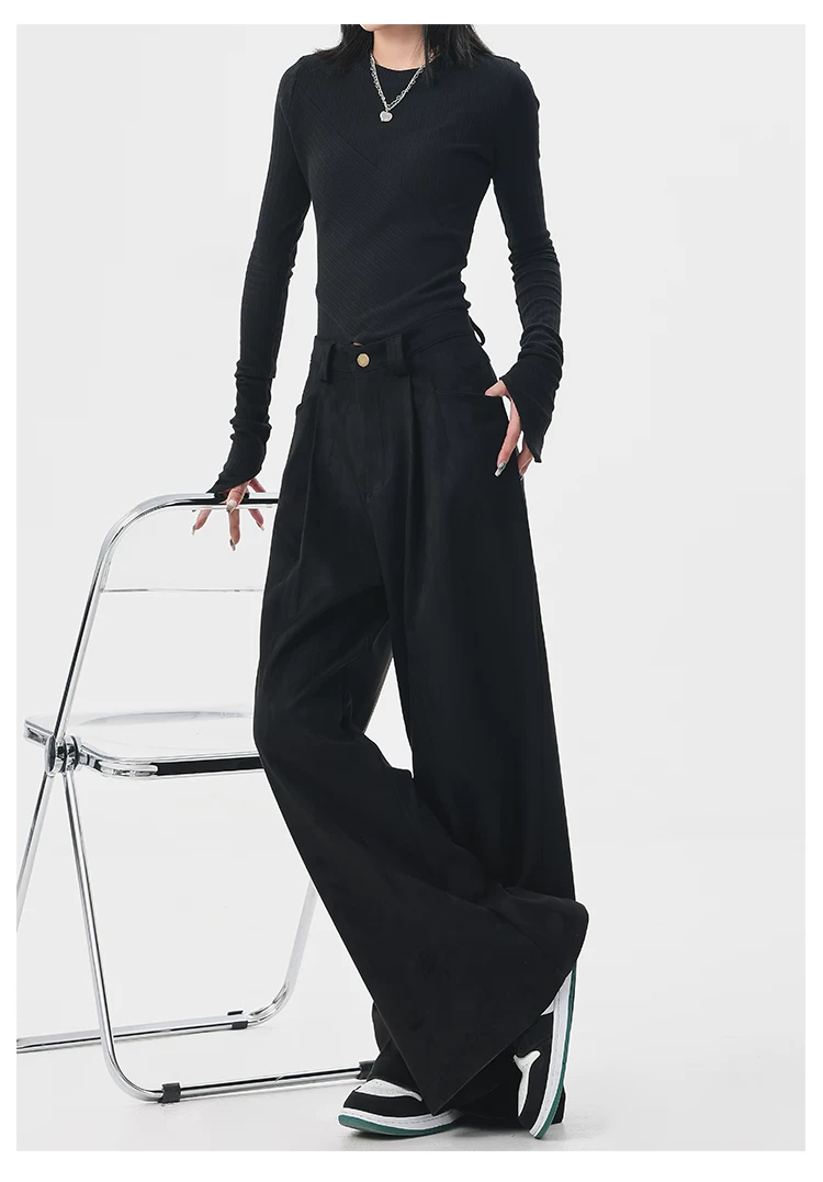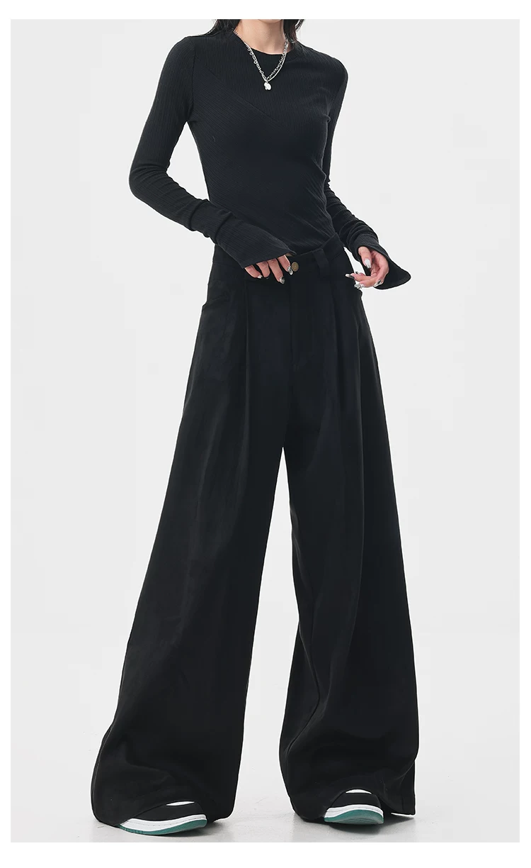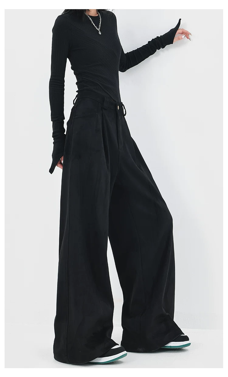 - KEN STUDIO Melard Trang phục Thu Đông Da lộn dày màu cà phê Quần âu nữ dài đến sàn Quần ống rộng
