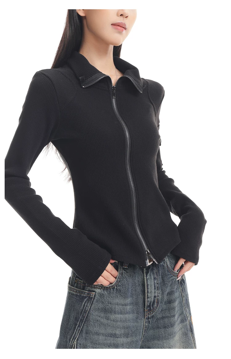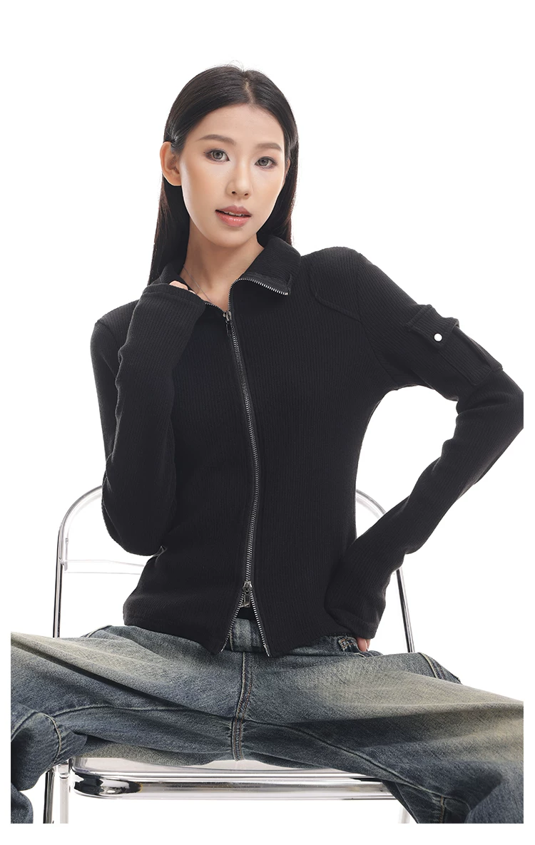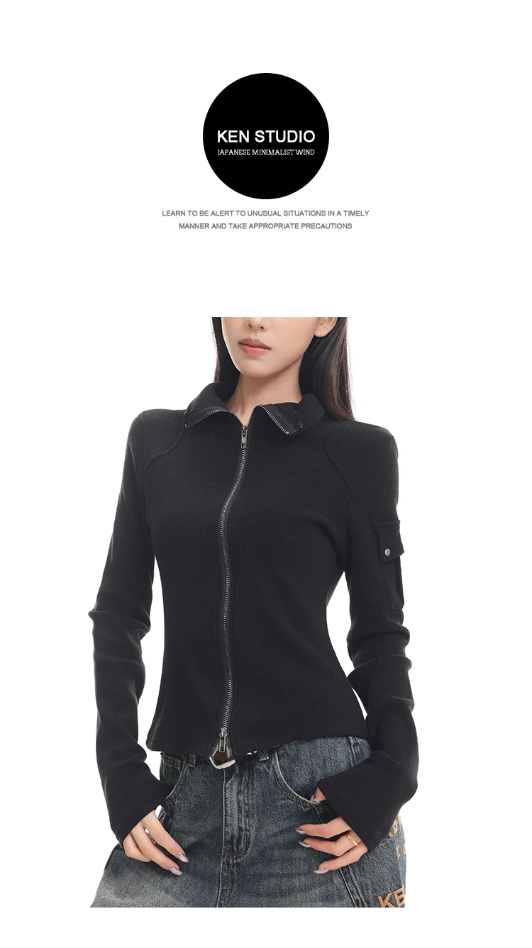 KEN STUDIO mới mùa thu đông màu đen dệt kim nữ có khóa kéo đôi có ve áo dáng ôm vừa vặn áo cardigan dài tay